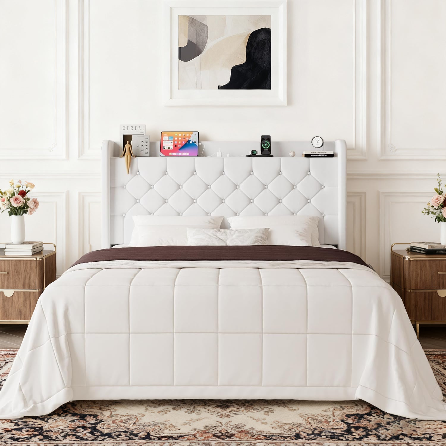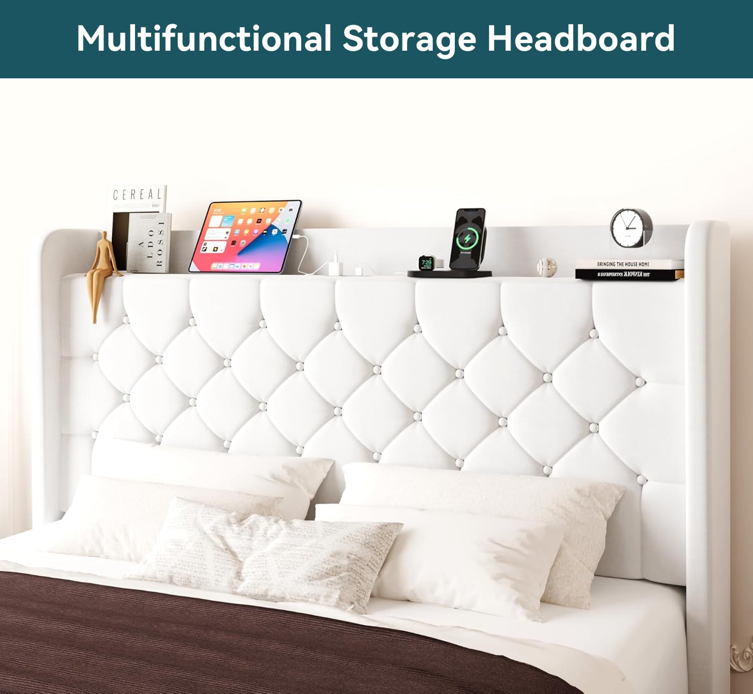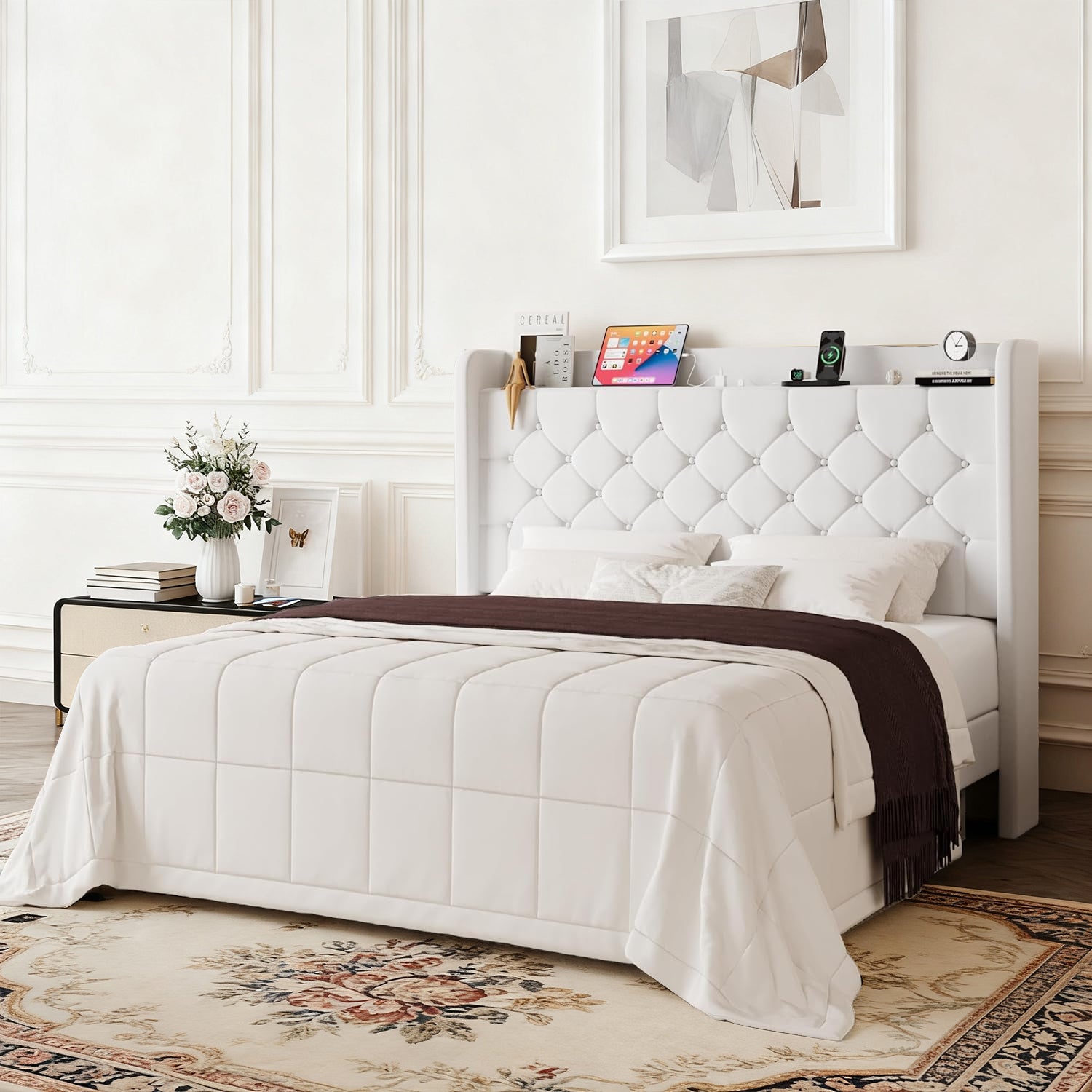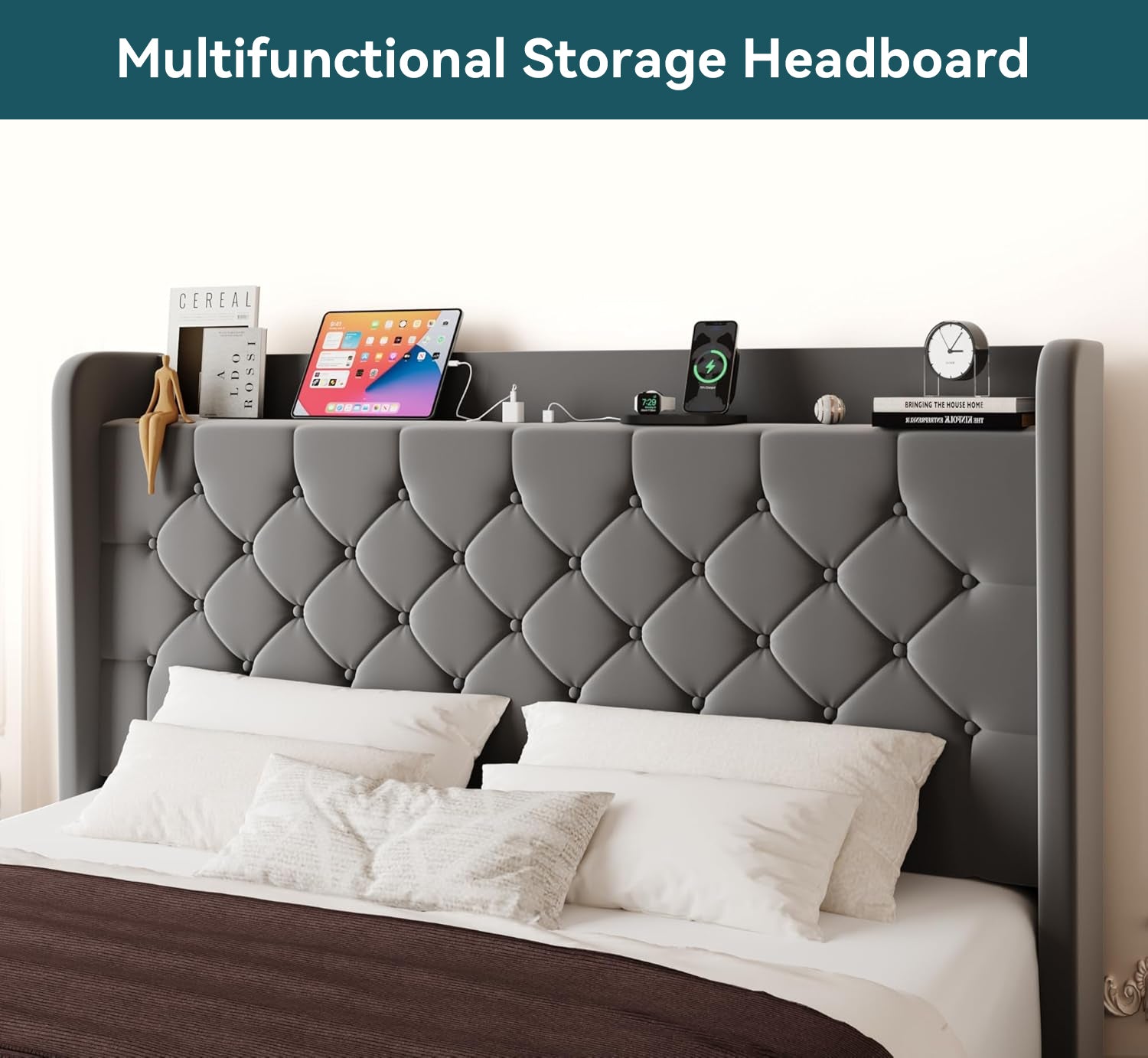Wingback Velvet Upholstered Bed Frame with Storage Headboard, Charging Station & Button-Tufted Design