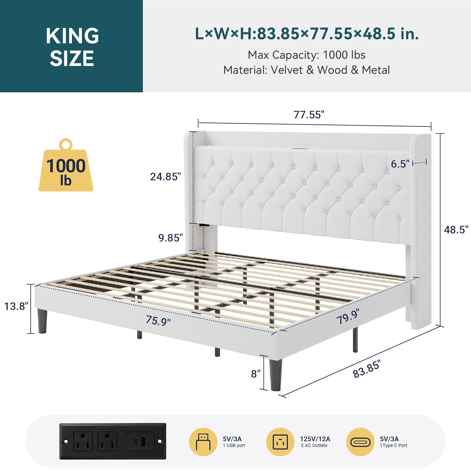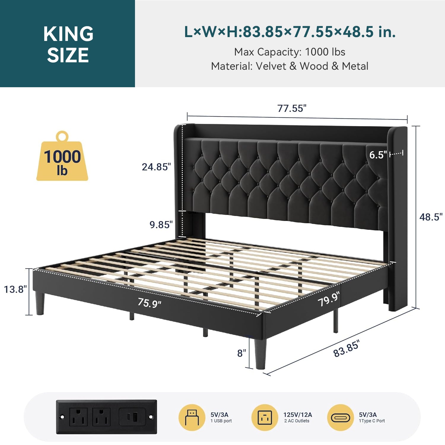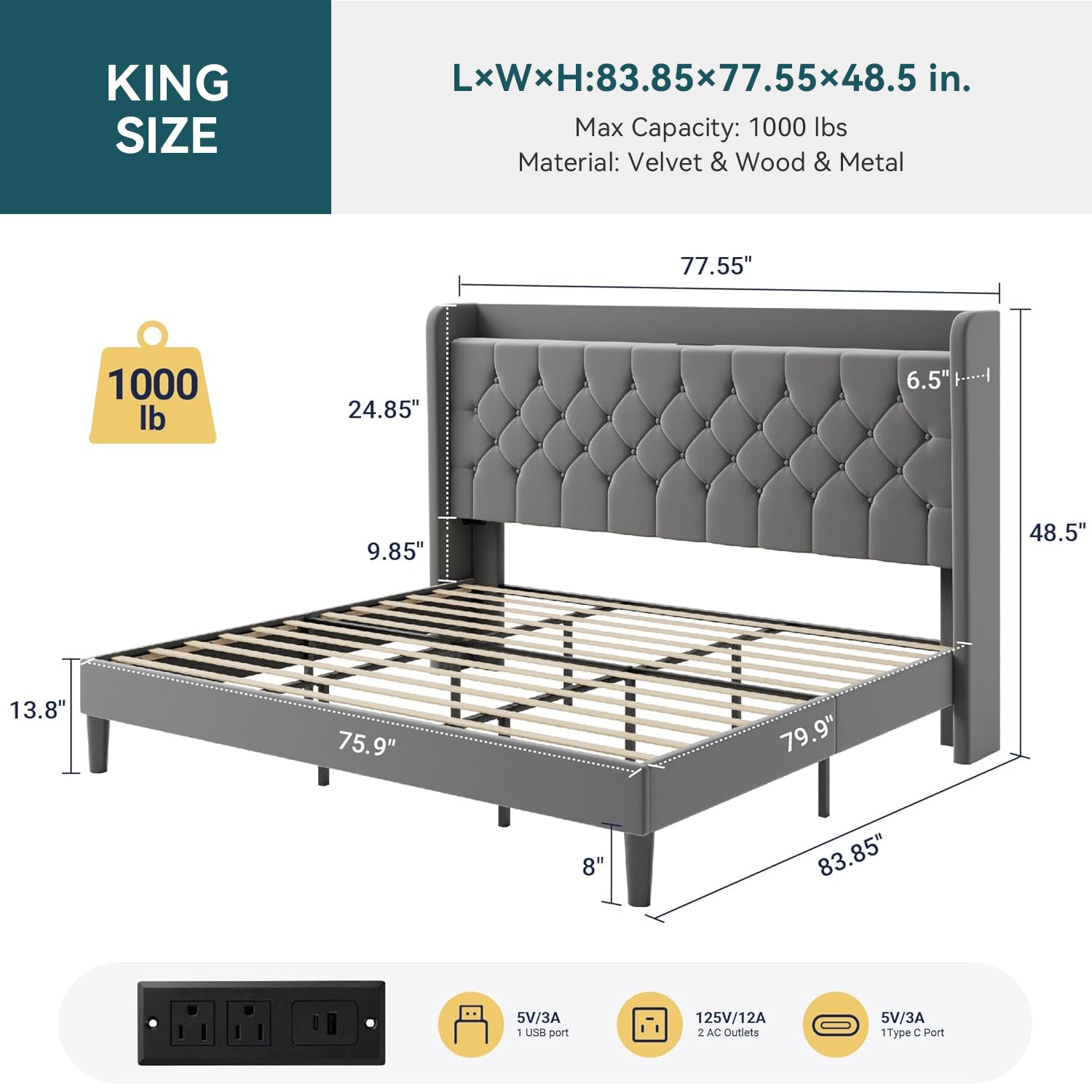 | King Size Bed Frame | 83.85"L x 77.55"W x 48.5"H |