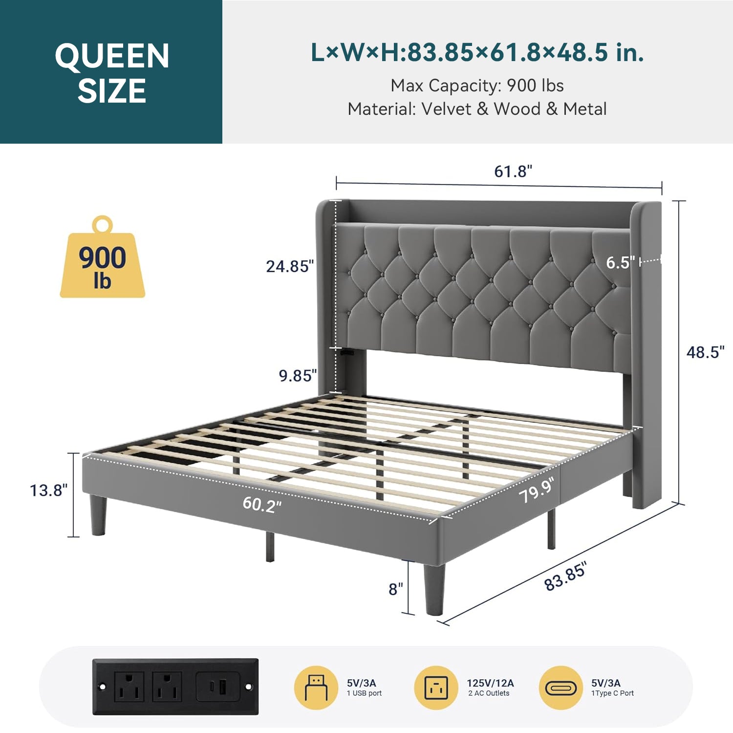 | Queen Size Bed Frame | 83.85"L x 61.8"W x 48.5"H |