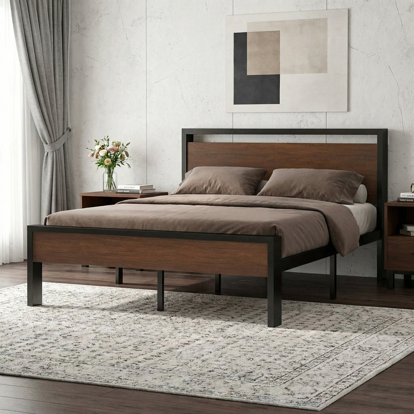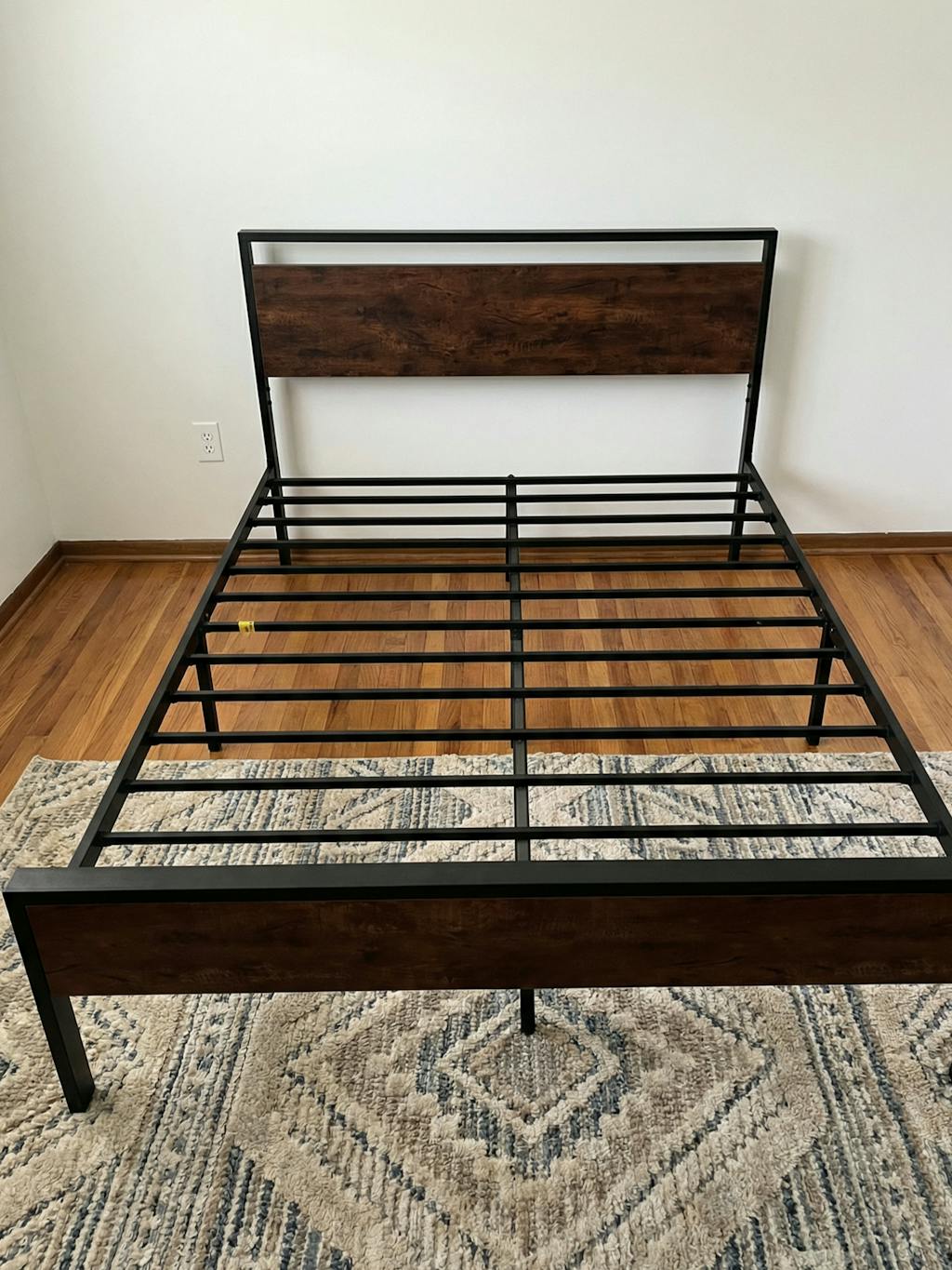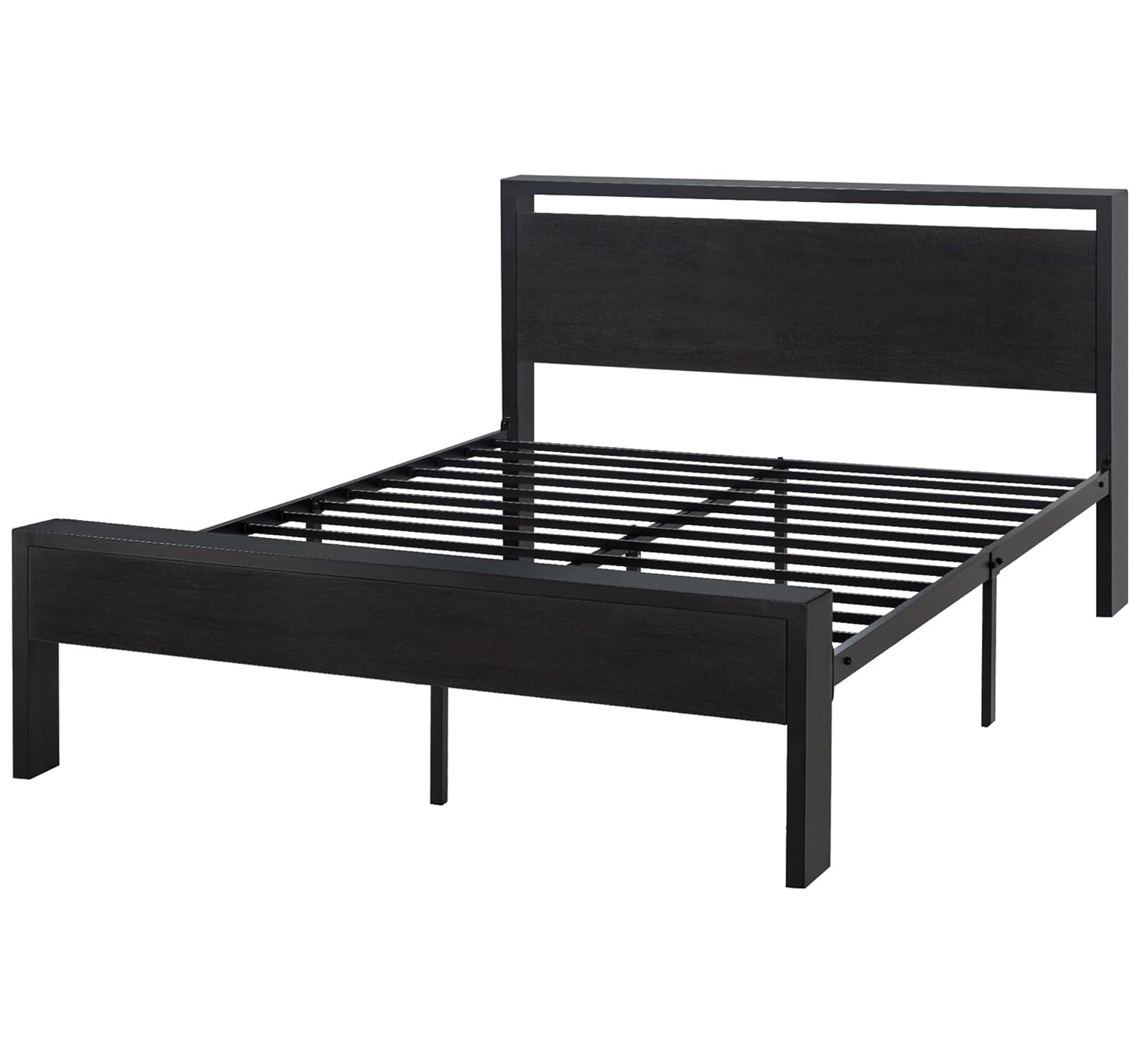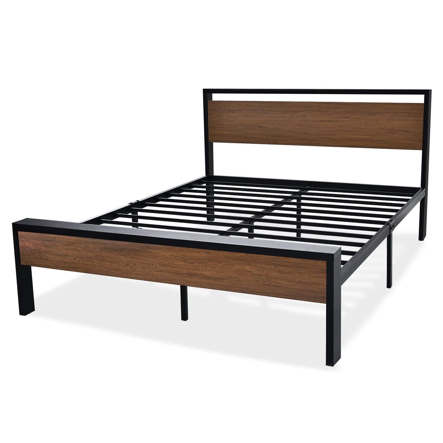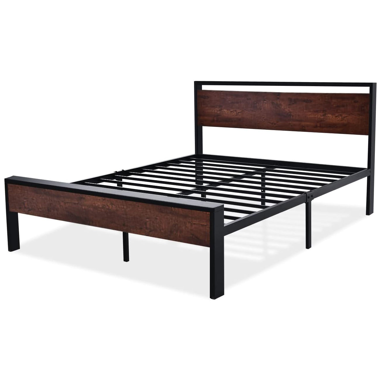 The metal platform bed frame combines a reinforced steel structure with a wooden headboard and footboard to deliver strong, reliable mattress support for everyday use. Its solid construction eliminates the need for a box spring while keeping your bedroom clean and streamlined. Its noise-free design features anti-slip slat holders and a rubber locking system that reduces movement and prevents squeaks. Even with frequent use, the bed frame stays stable and quiet, creating a more restful sleep environment. The elevated platform design provides ample under-bed storage space, perfect for organizing bedding, storage bins, or seasonal items. This space-saving feature makes the bed frame especially ideal for apartments, guest rooms, or smaller bedrooms. Its heavy-duty metal slats and multiple independent support legs evenly distribute weight, ensuring long-lasting durability and dependable performance night after night. The sturdy platform offers peace of mind for daily sleeping without sagging or shifting. The industrial farmhouse aesthetic blends frosted metal details with a rustic wood-look headboard, adding character and warmth to modern, industrial, or country-style interiors. Designed with easy assembly in mind, this platform bed frame delivers strength, storage, and style in one practical solution.