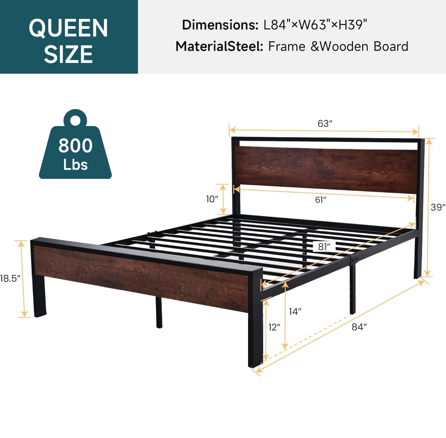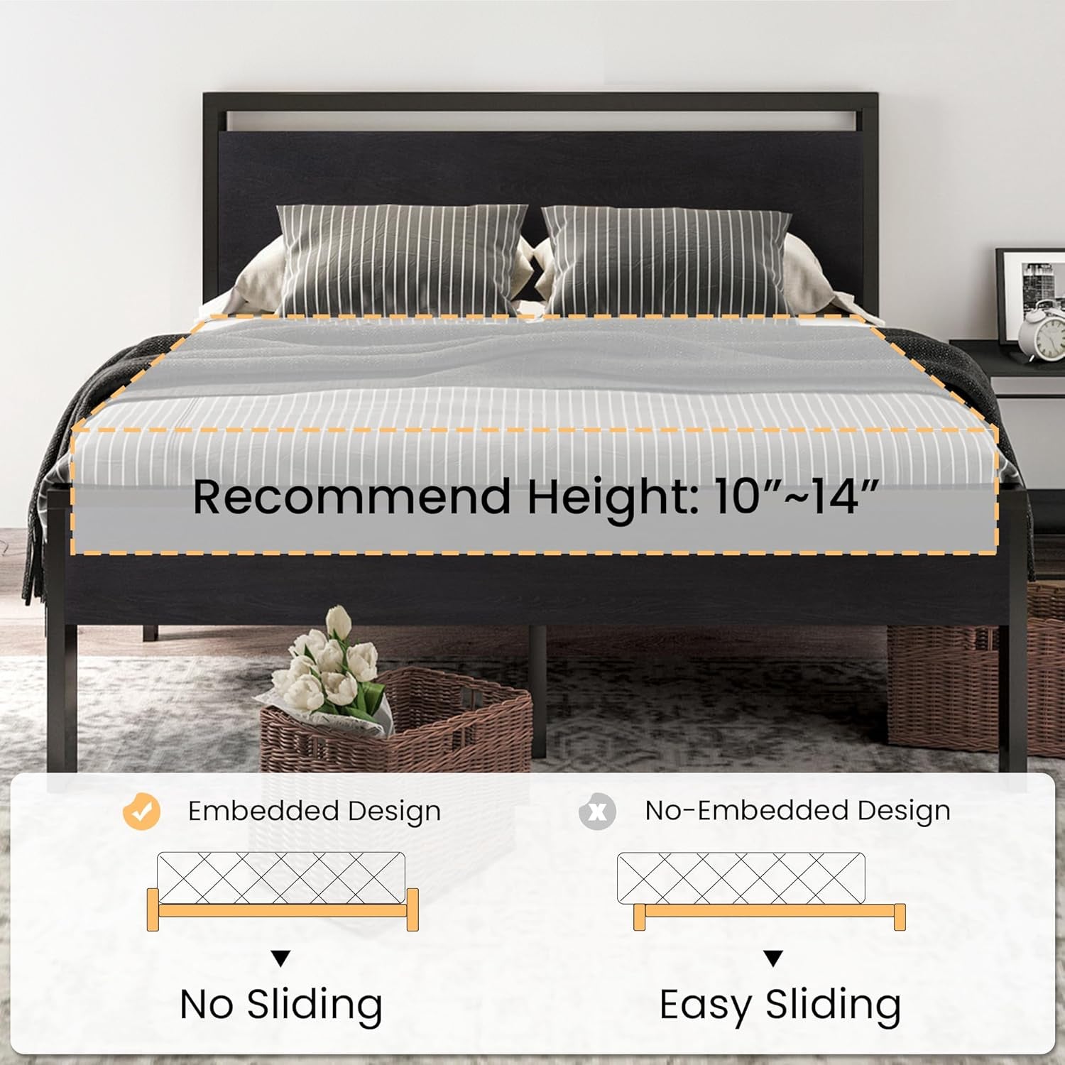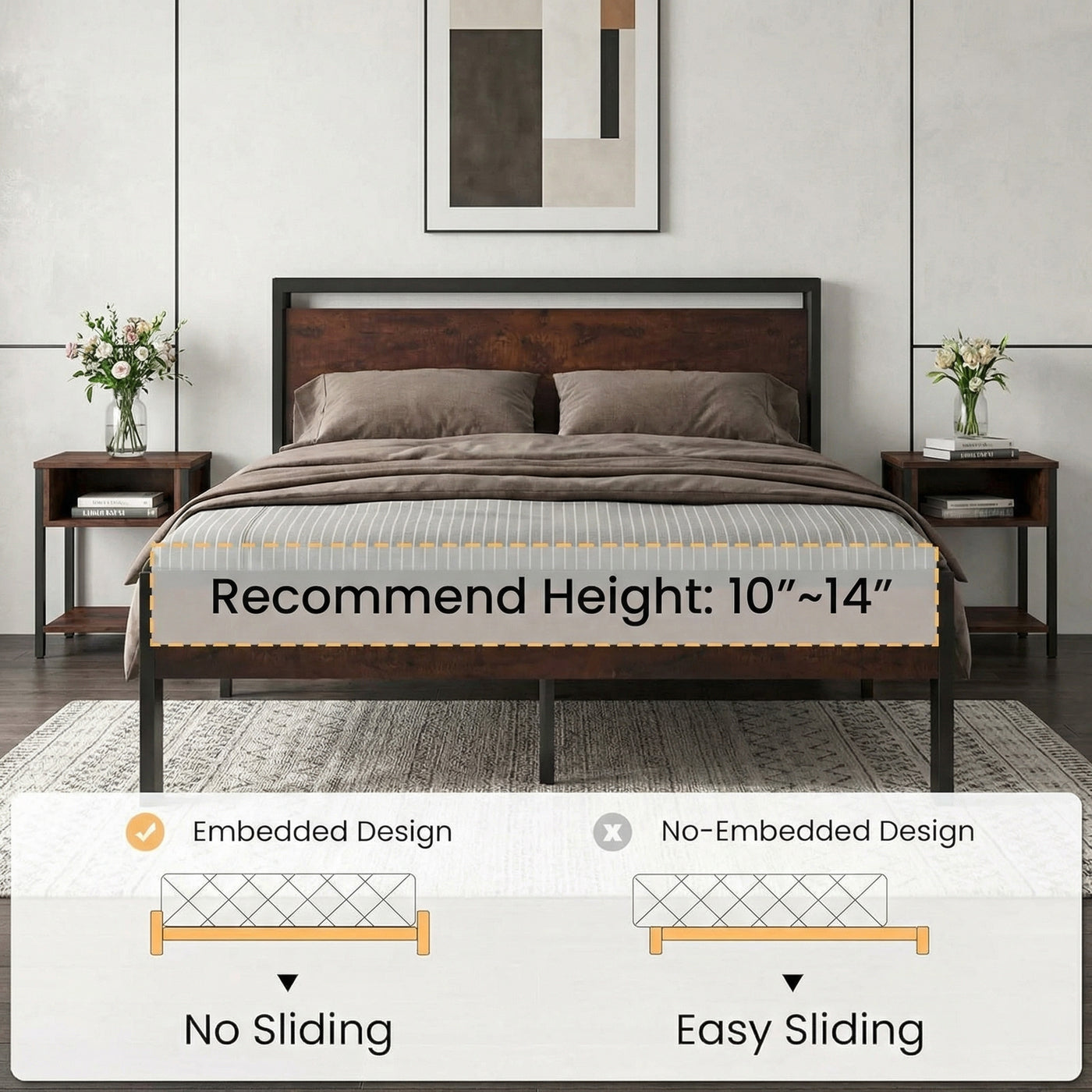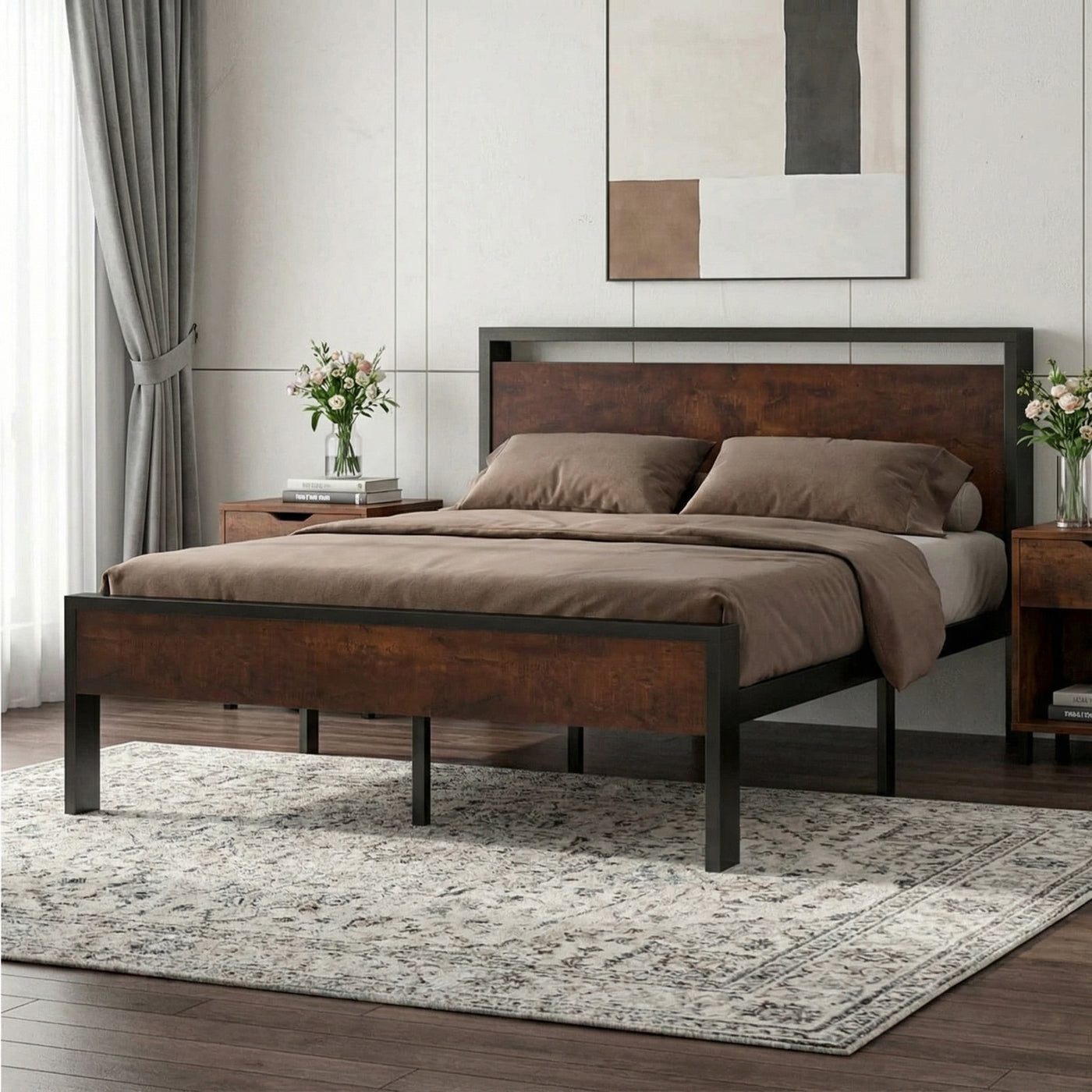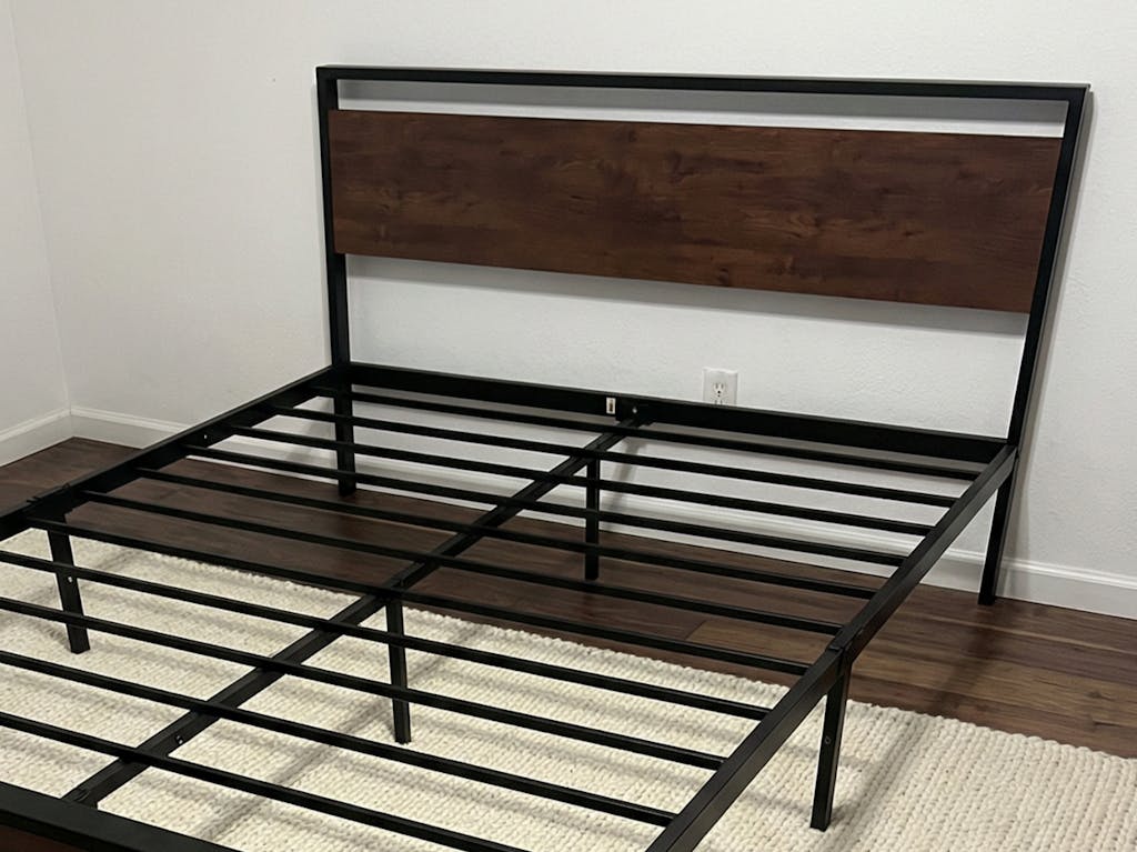 The metal platform bed frame combines a reinforced steel structure with a wooden headboard and footboard to deliver strong, reliable mattress support for everyday use. Its solid construction eliminates the need for a box spring while keeping your bedroom clean and streamlined. Its noise-free design features anti-slip slat holders and a rubber locking system that reduces movement and prevents squeaks. Even with frequent use, the bed frame stays stable and quiet, creating a more restful sleep environment. The elevated platform design provides ample under-bed storage space, perfect for organizing bedding, storage bins, or seasonal items. This space-saving feature makes the bed frame especially ideal for apartments, guest rooms, or smaller bedrooms. Its heavy-duty metal slats and multiple independent support legs evenly distribute weight, ensuring long-lasting durability and dependable performance night after night. The sturdy platform offers peace of mind for daily sleeping without sagging or shifting. The industrial farmhouse aesthetic blends frosted metal details with a rustic wood-look headboard, adding character and warmth to modern, industrial, or country-style interiors. Designed with easy assembly in mind, this platform bed frame delivers strength, storage, and style in one practical solution.