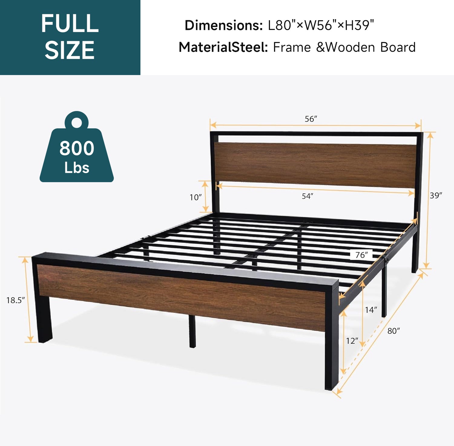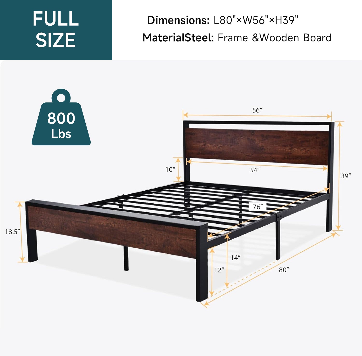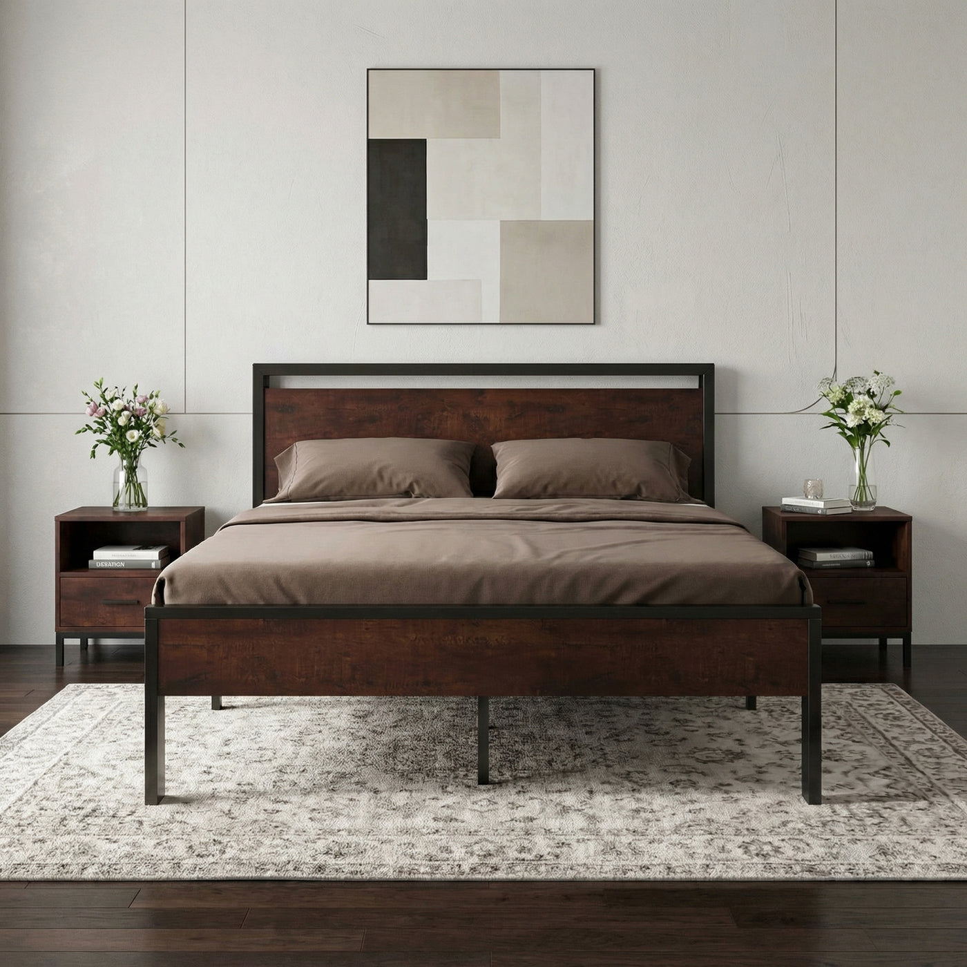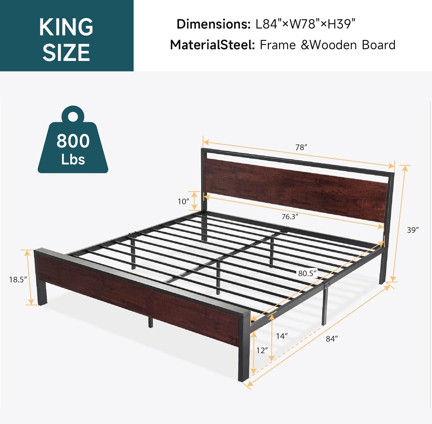 The metal platform bed frame combines a reinforced steel structure with a wooden headboard and footboard to deliver strong, reliable mattress support for everyday use. Its solid construction eliminates the need for a box spring while keeping your bedroom clean and streamlined. Its noise-free design features anti-slip slat holders and a rubber locking system that reduces movement and prevents squeaks. Even with frequent use, the bed frame stays stable and quiet, creating a more restful sleep environment. The elevated platform design provides ample under-bed storage space, perfect for organizing bedding, storage bins, or seasonal items. This space-saving feature makes the bed frame especially ideal for apartments, guest rooms, or smaller bedrooms. Its heavy-duty metal slats and multiple independent support legs evenly distribute weight, ensuring long-lasting durability and dependable performance night after night. The sturdy platform offers peace of mind for daily sleeping without sagging or shifting. The industrial farmhouse aesthetic blends frosted metal details with a rustic wood-look headboard, adding character and warmth to modern, industrial, or country-style interiors. Designed with easy assembly in mind, this platform bed frame delivers strength, storage, and style in one practical solution.