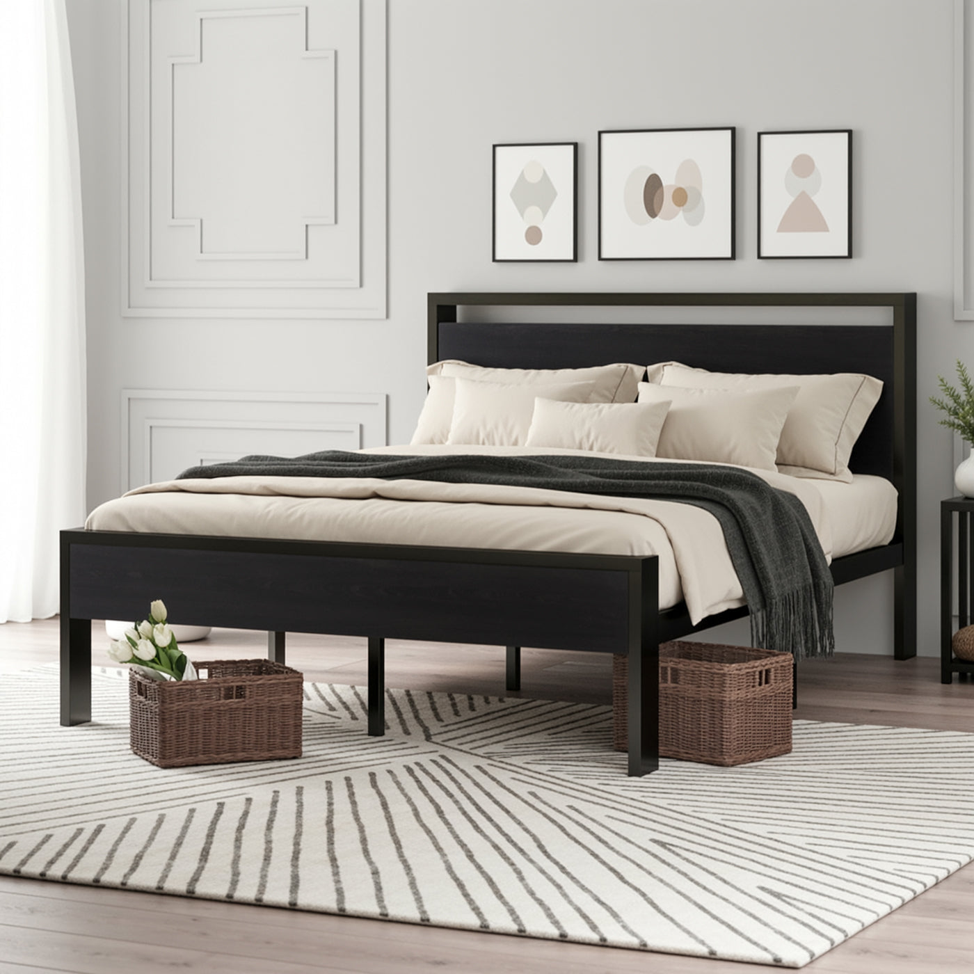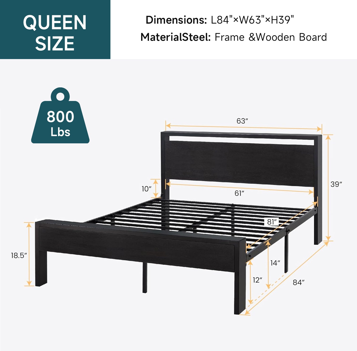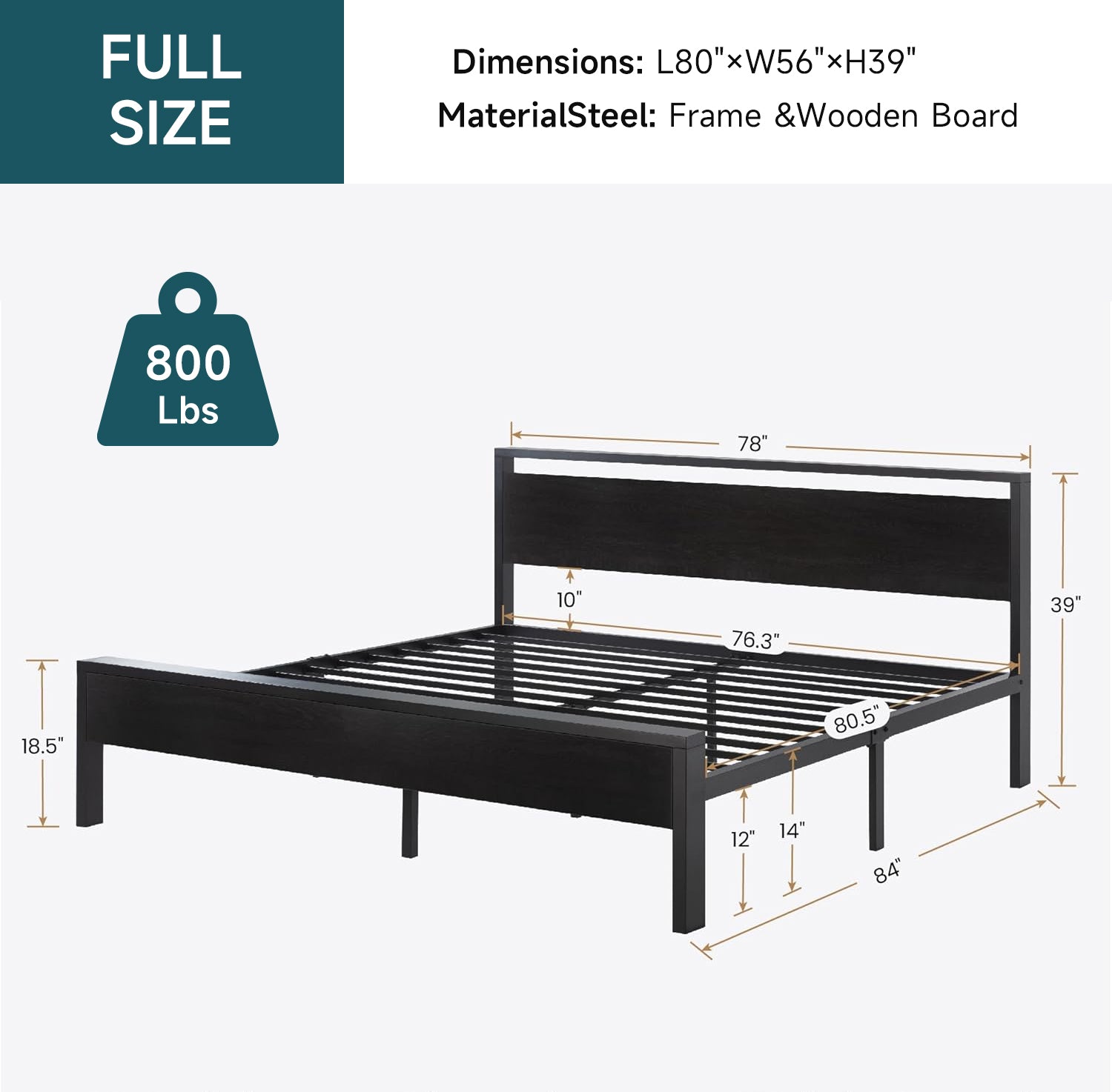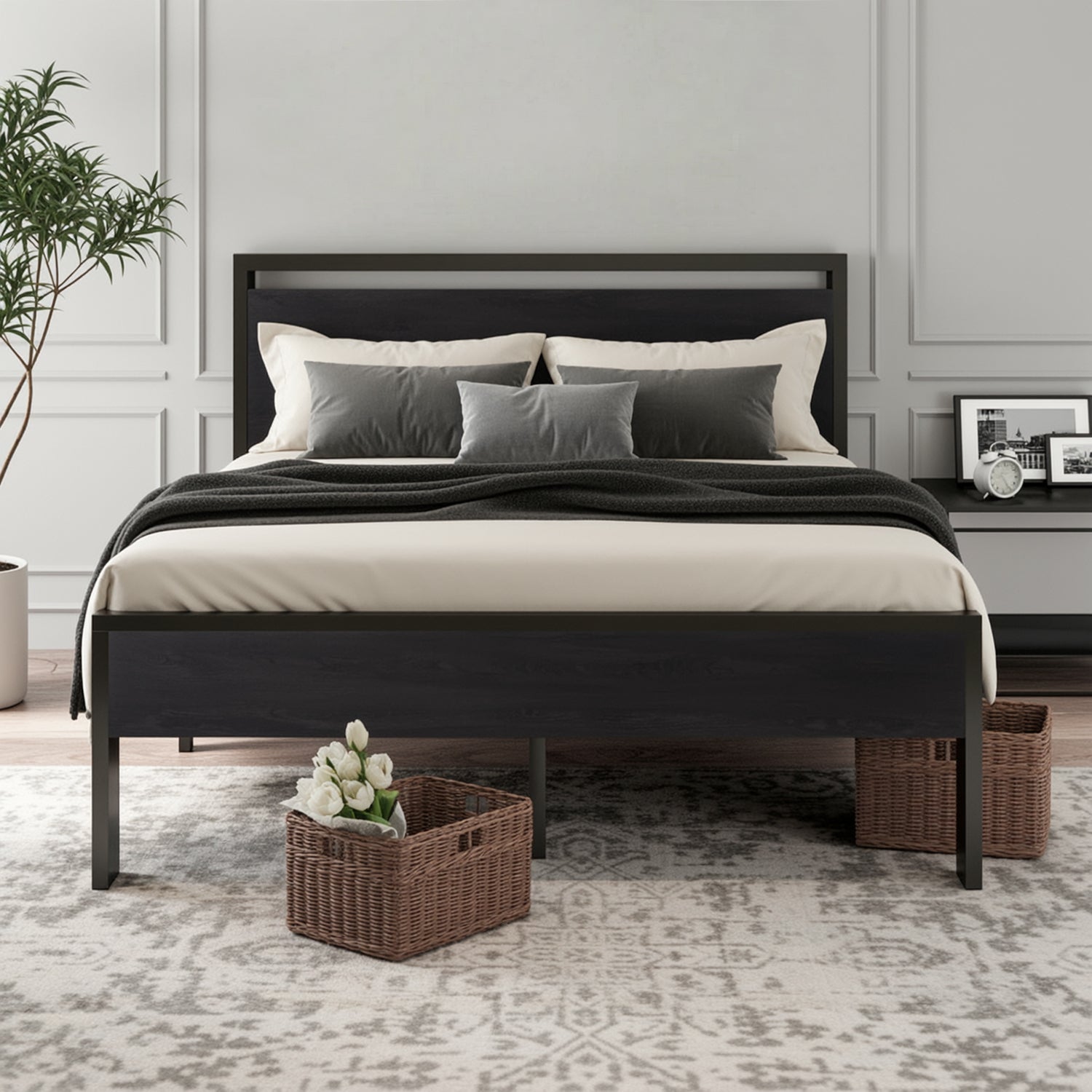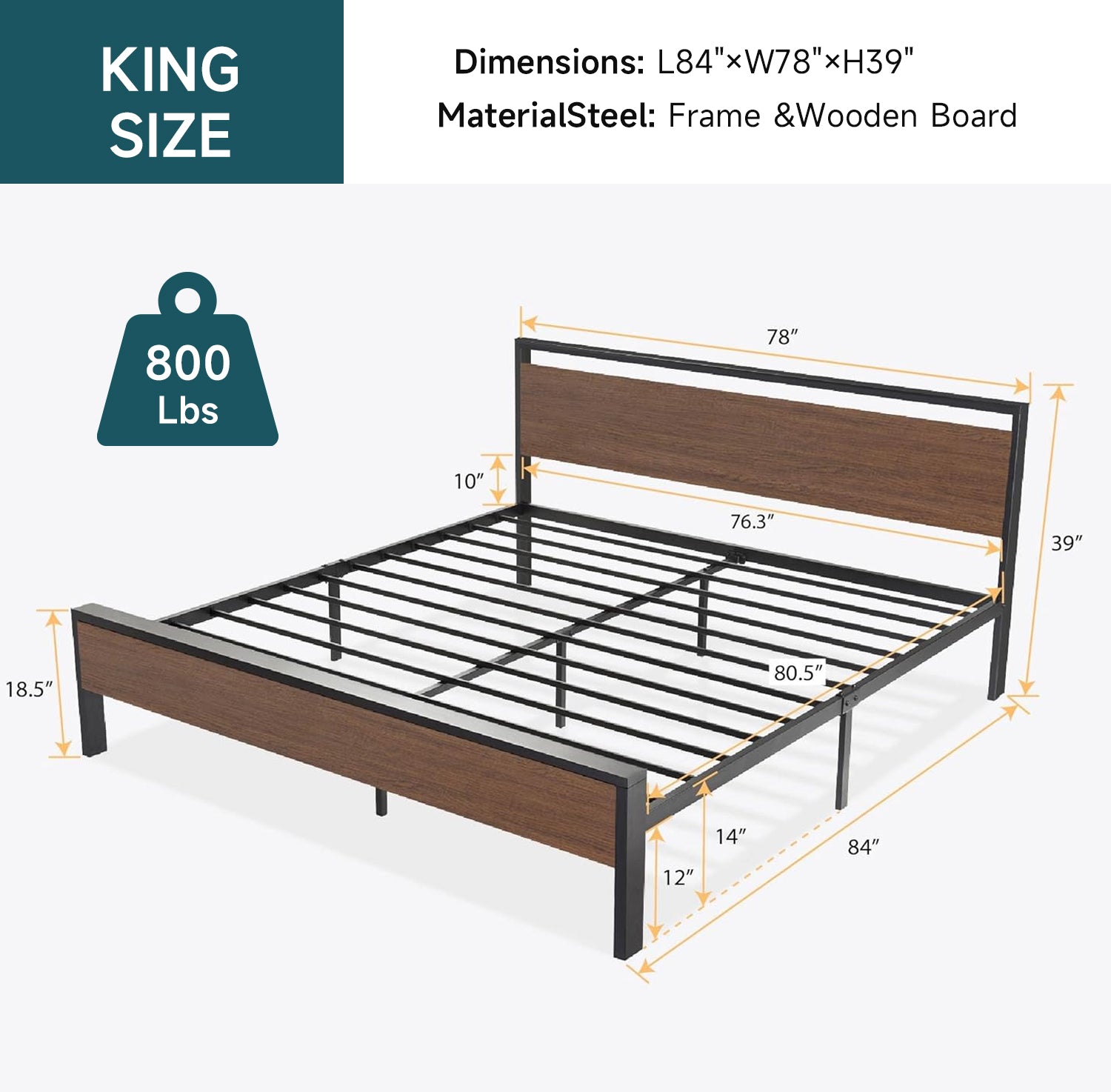 The metal platform bed frame combines a reinforced steel structure with a wooden headboard and footboard to deliver strong, reliable mattress support for everyday use. Its solid construction eliminates the need for a box spring while keeping your bedroom clean and streamlined. Its noise-free design features anti-slip slat holders and a rubber locking system that reduces movement and prevents squeaks. Even with frequent use, the bed frame stays stable and quiet, creating a more restful sleep environment. The elevated platform design provides ample under-bed storage space, perfect for organizing bedding, storage bins, or seasonal items. This space-saving feature makes the bed frame especially ideal for apartments, guest rooms, or smaller bedrooms. Its heavy-duty metal slats and multiple independent support legs evenly distribute weight, ensuring long-lasting durability and dependable performance night after night. The sturdy platform offers peace of mind for daily sleeping without sagging or shifting. The industrial farmhouse aesthetic blends frosted metal details with a rustic wood-look headboard, adding character and warmth to modern, industrial, or country-style interiors. Designed with easy assembly in mind, this platform bed frame delivers strength, storage, and style in one practical solution.
