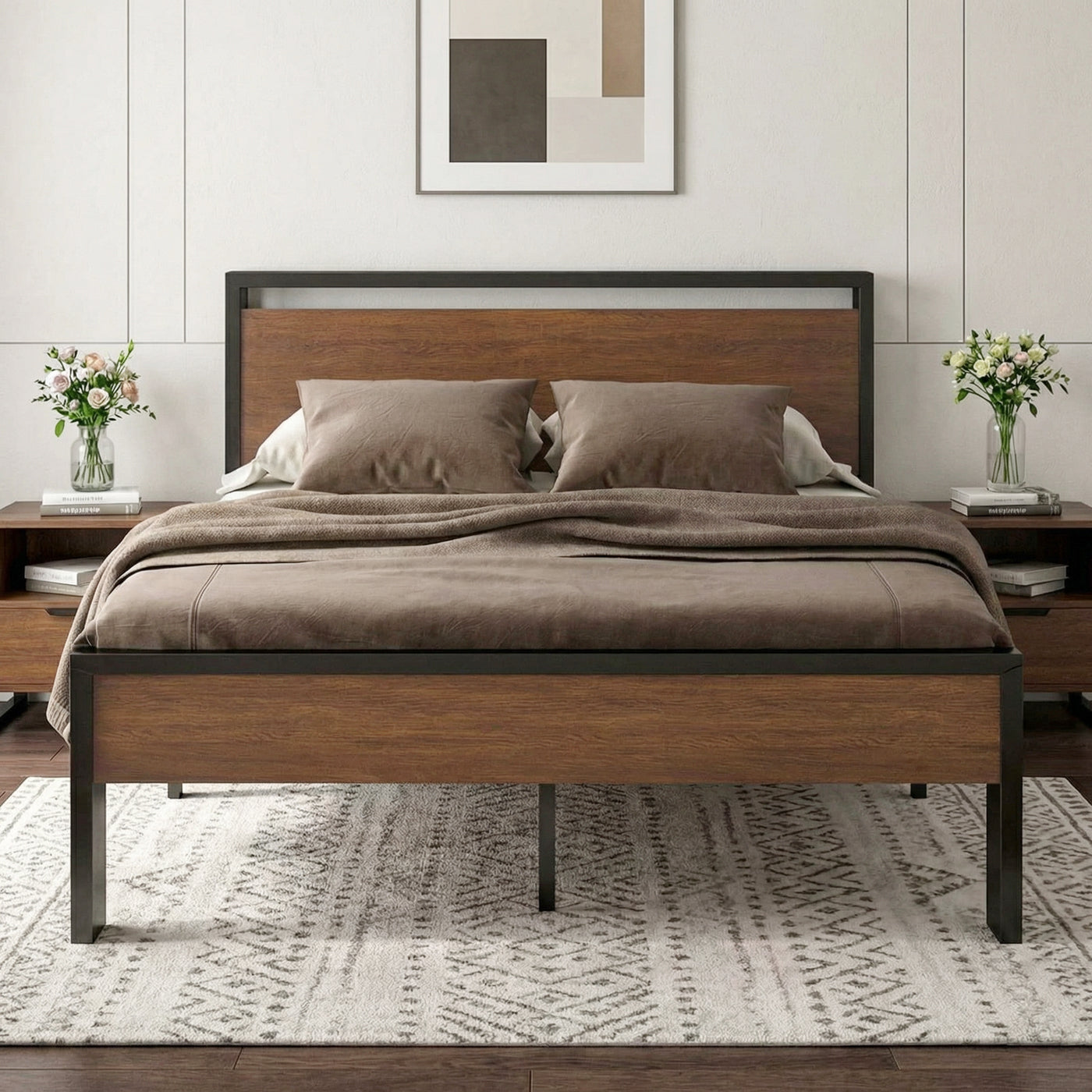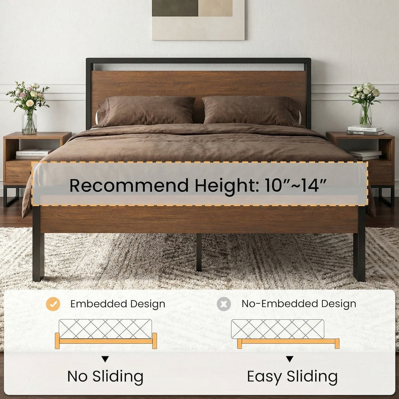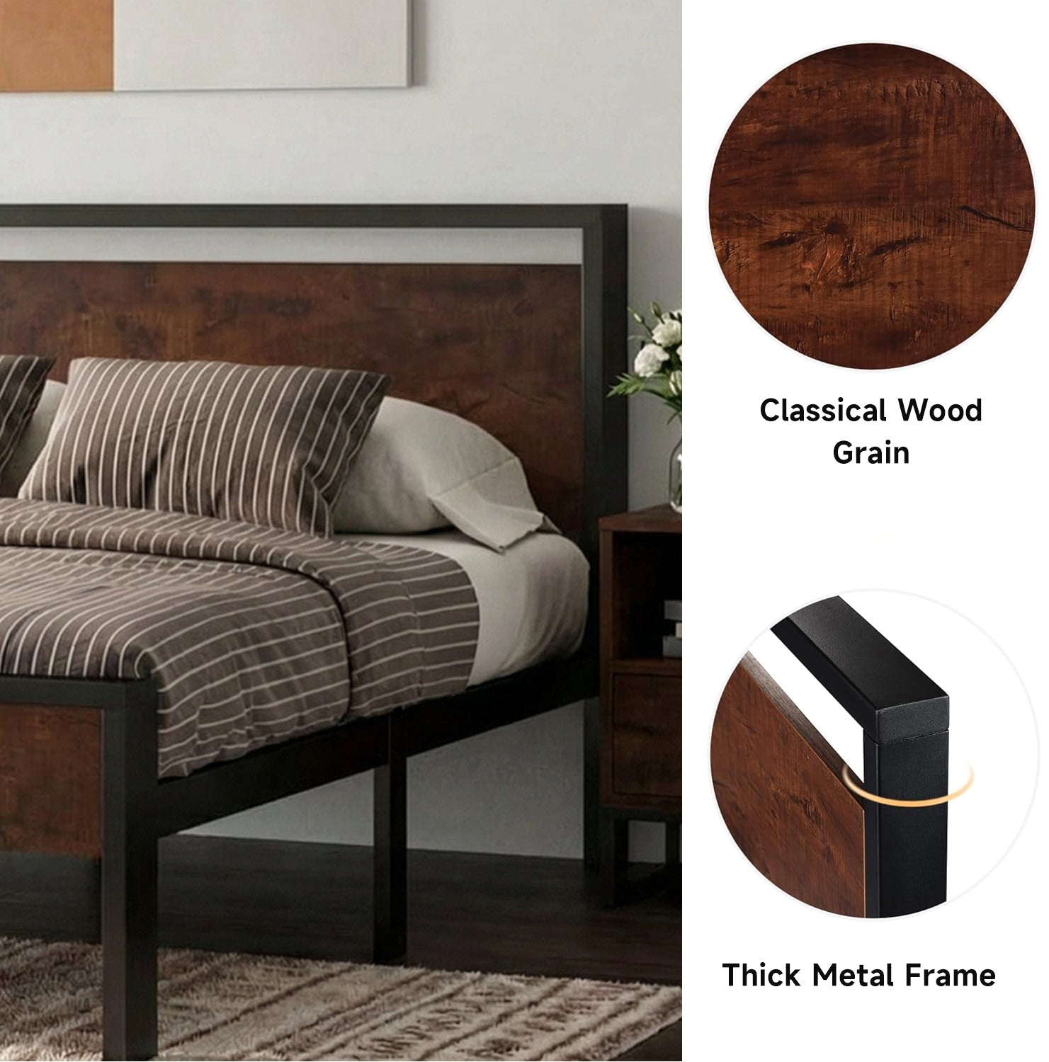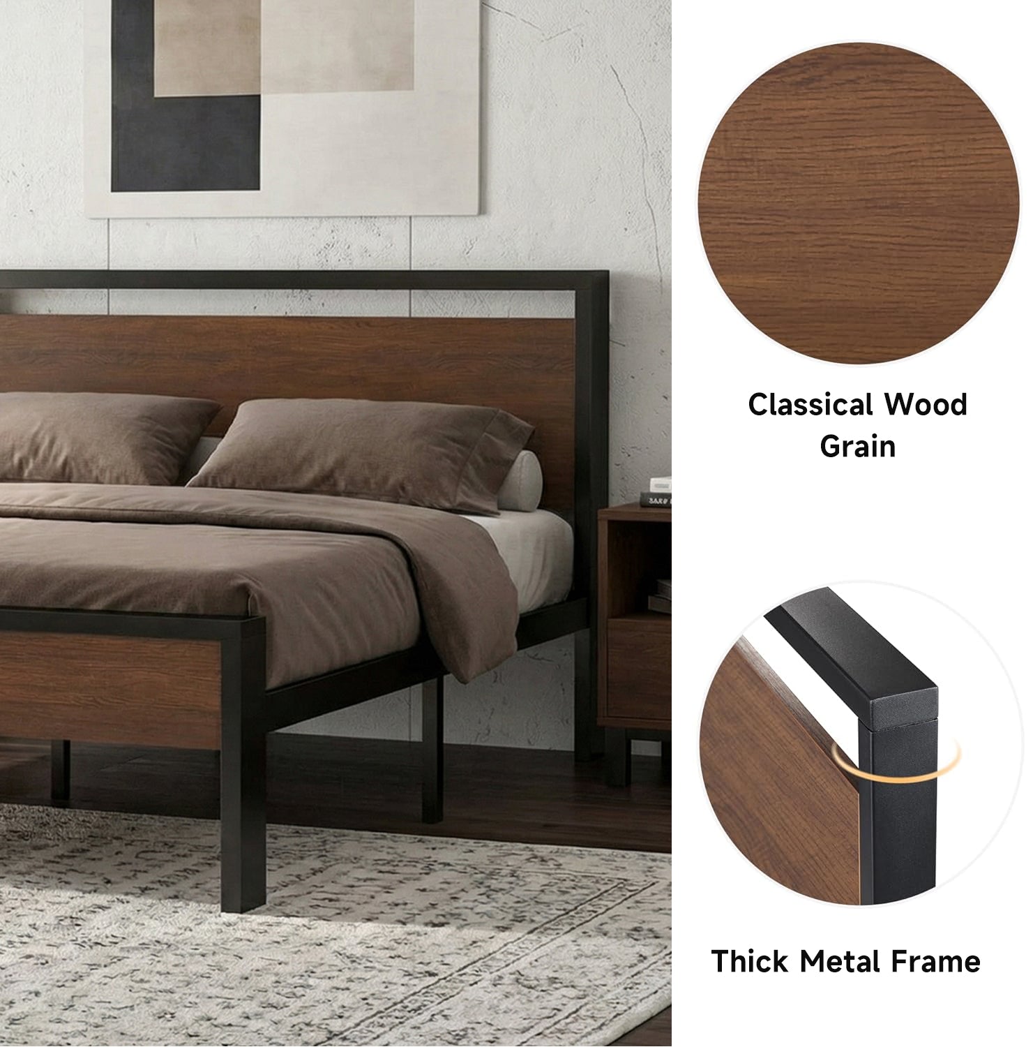 Metal Platform Bed Frame with Wooden Headboard & Footboard, Quiet No-Slip Design, No Box Spring Needed