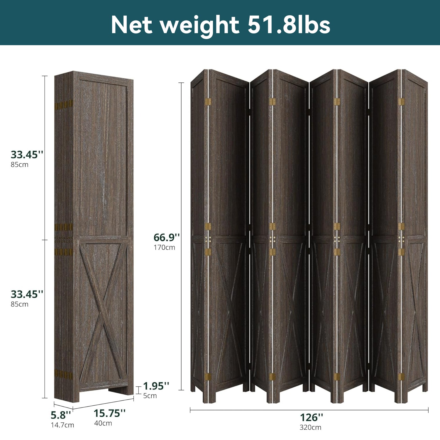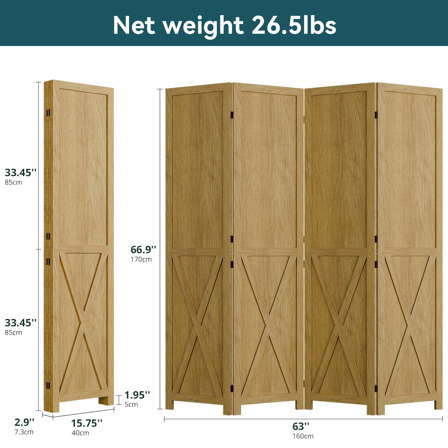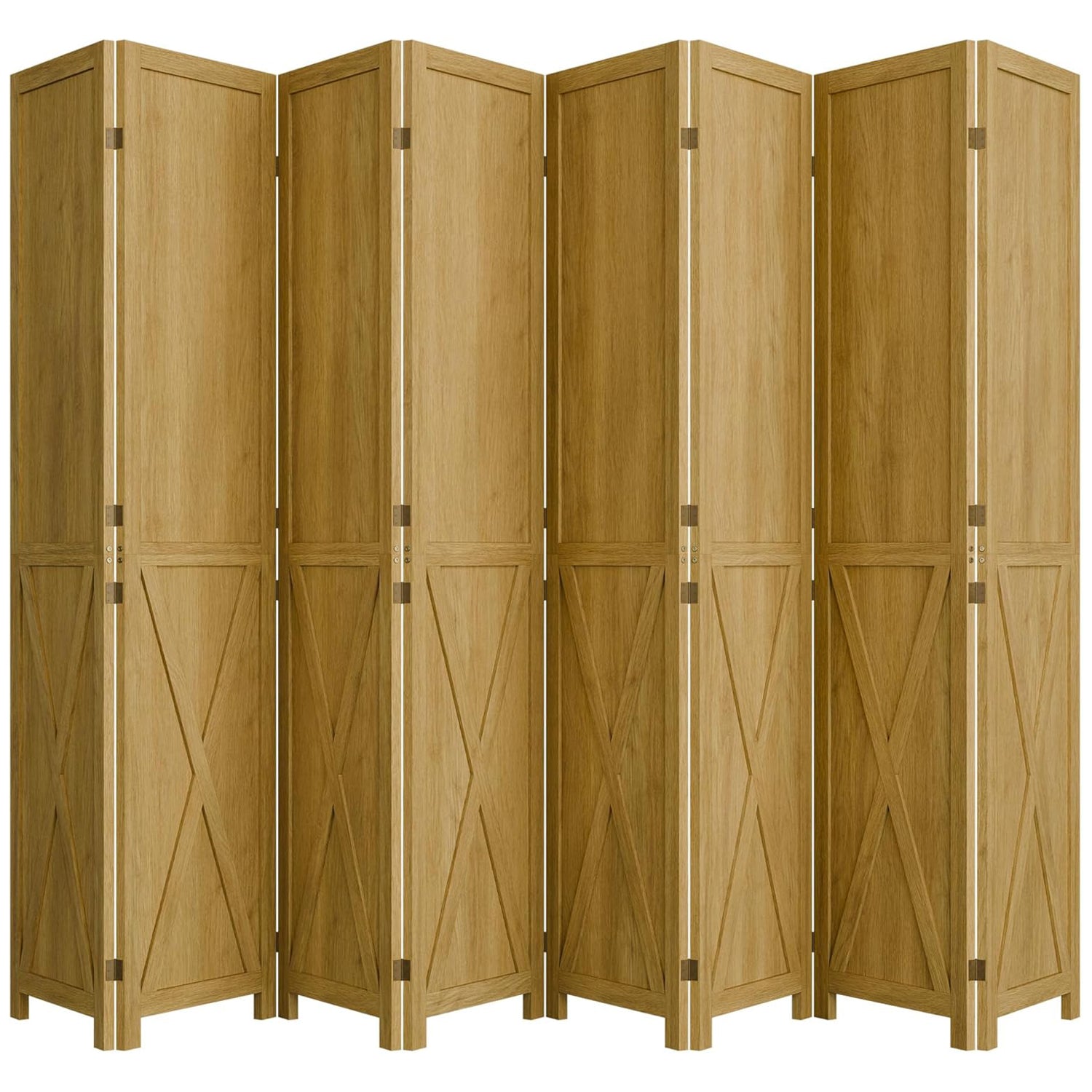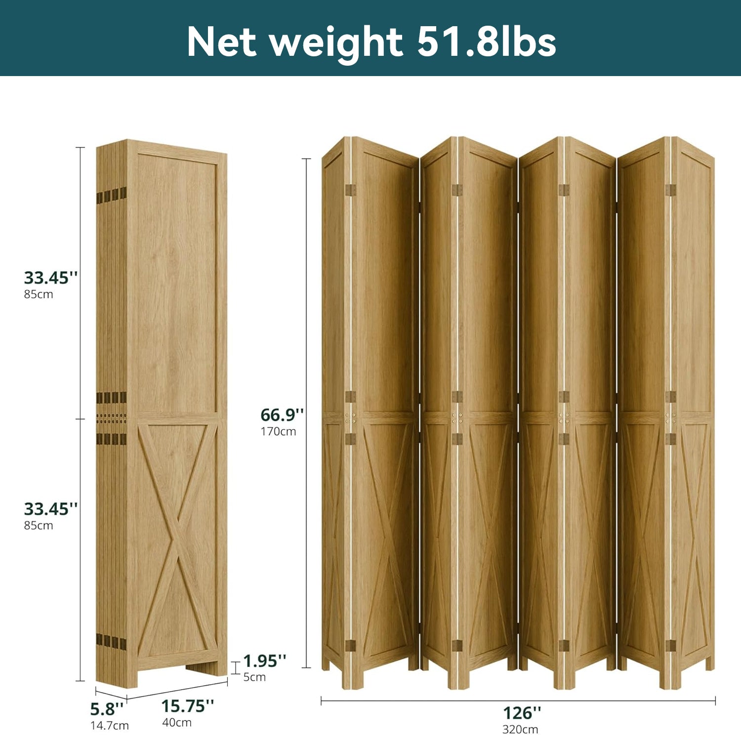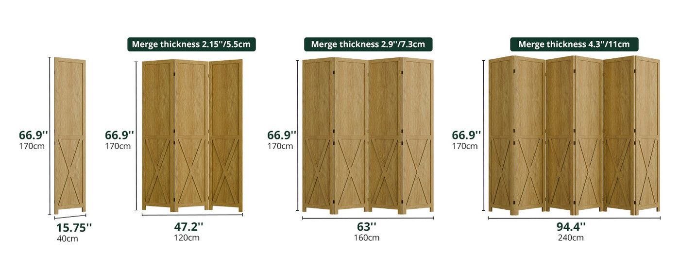 This folding room divider uses solid wood panels connected by metal hinges, which allows it to open, bend, and fold naturally. Each panel measures 66.9" H x 15.75" W. You can choose the number of panels based on how much space you want to separate.