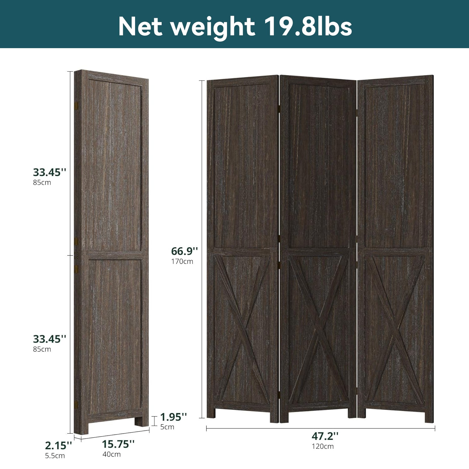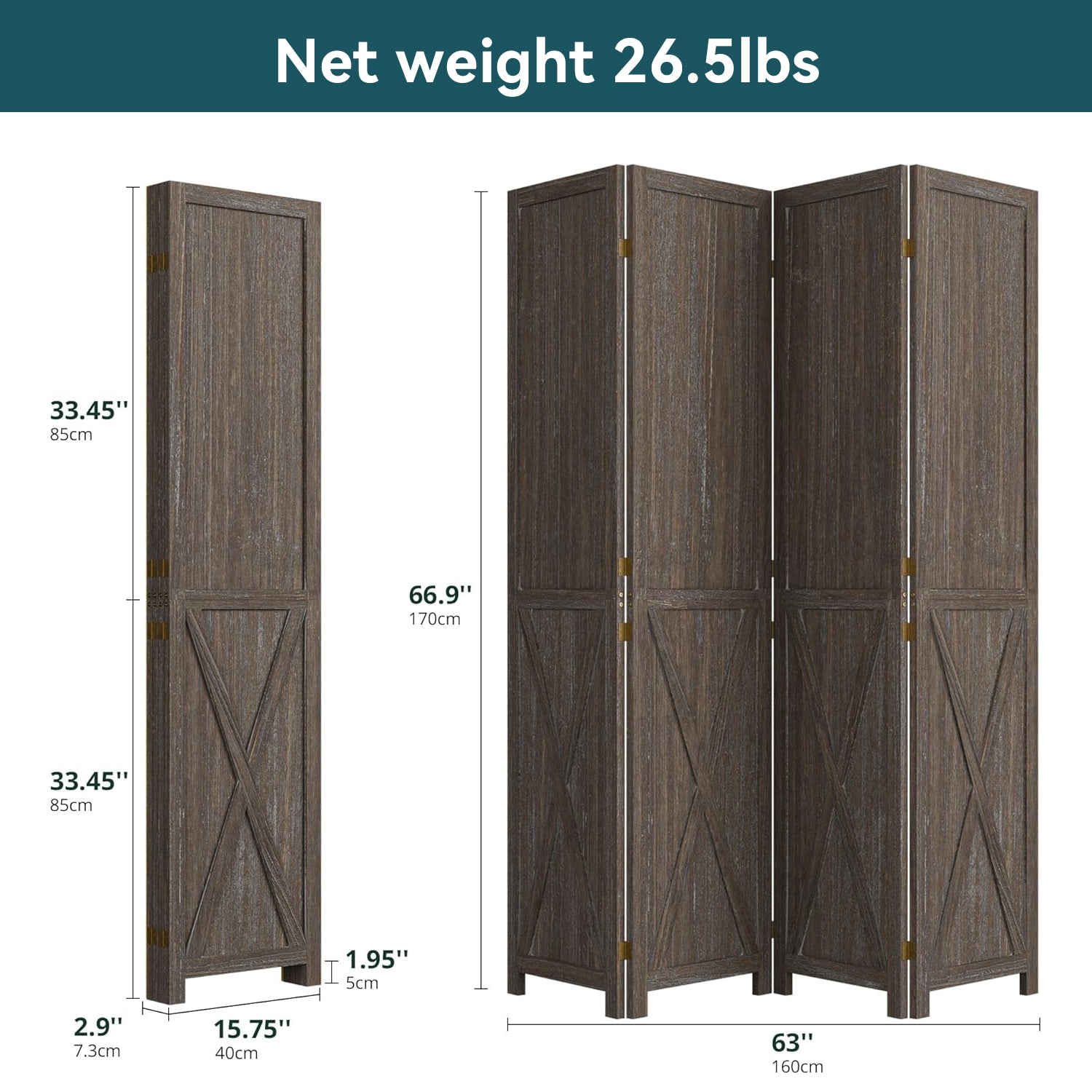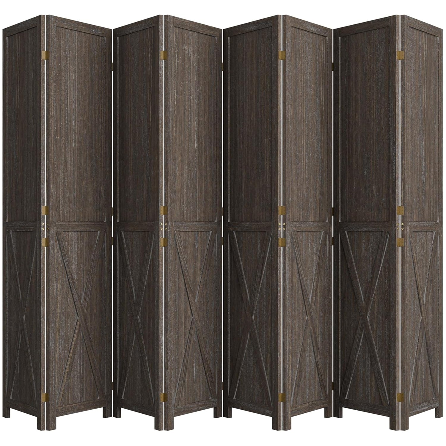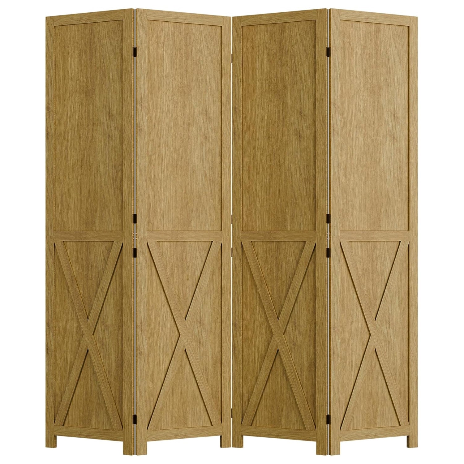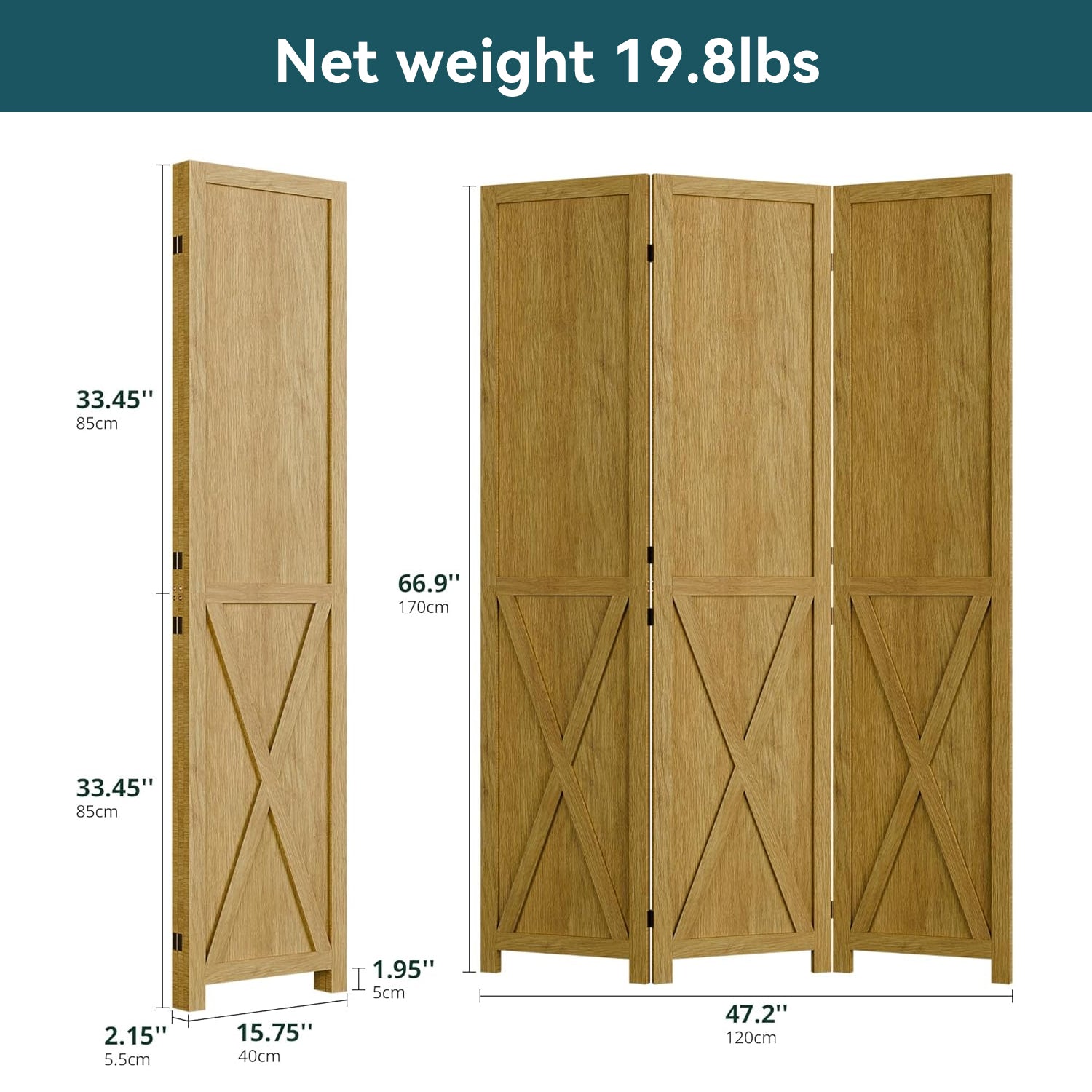This folding room divider uses solid wood panels connected by metal hinges, which allows it to open, bend, and fold naturally. Each panel measures 66.9" H x 15.75" W. You can choose the number of panels based on how much space you want to separate.
