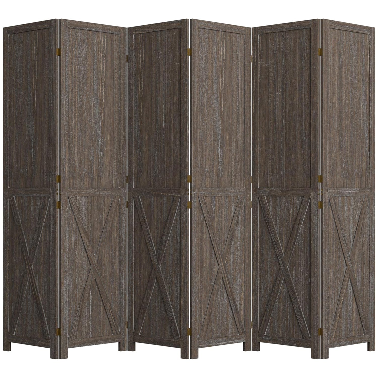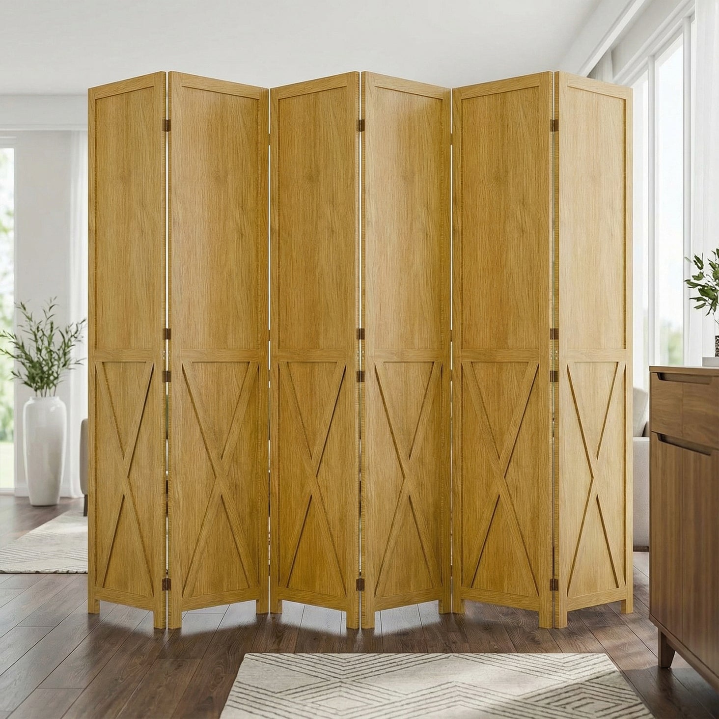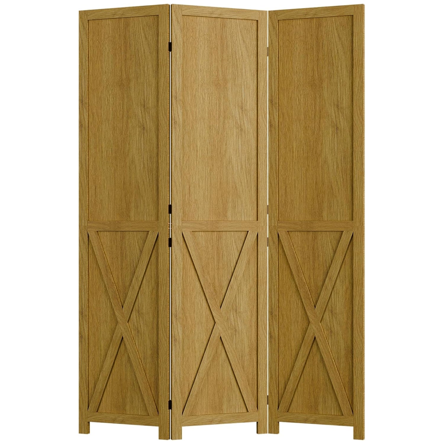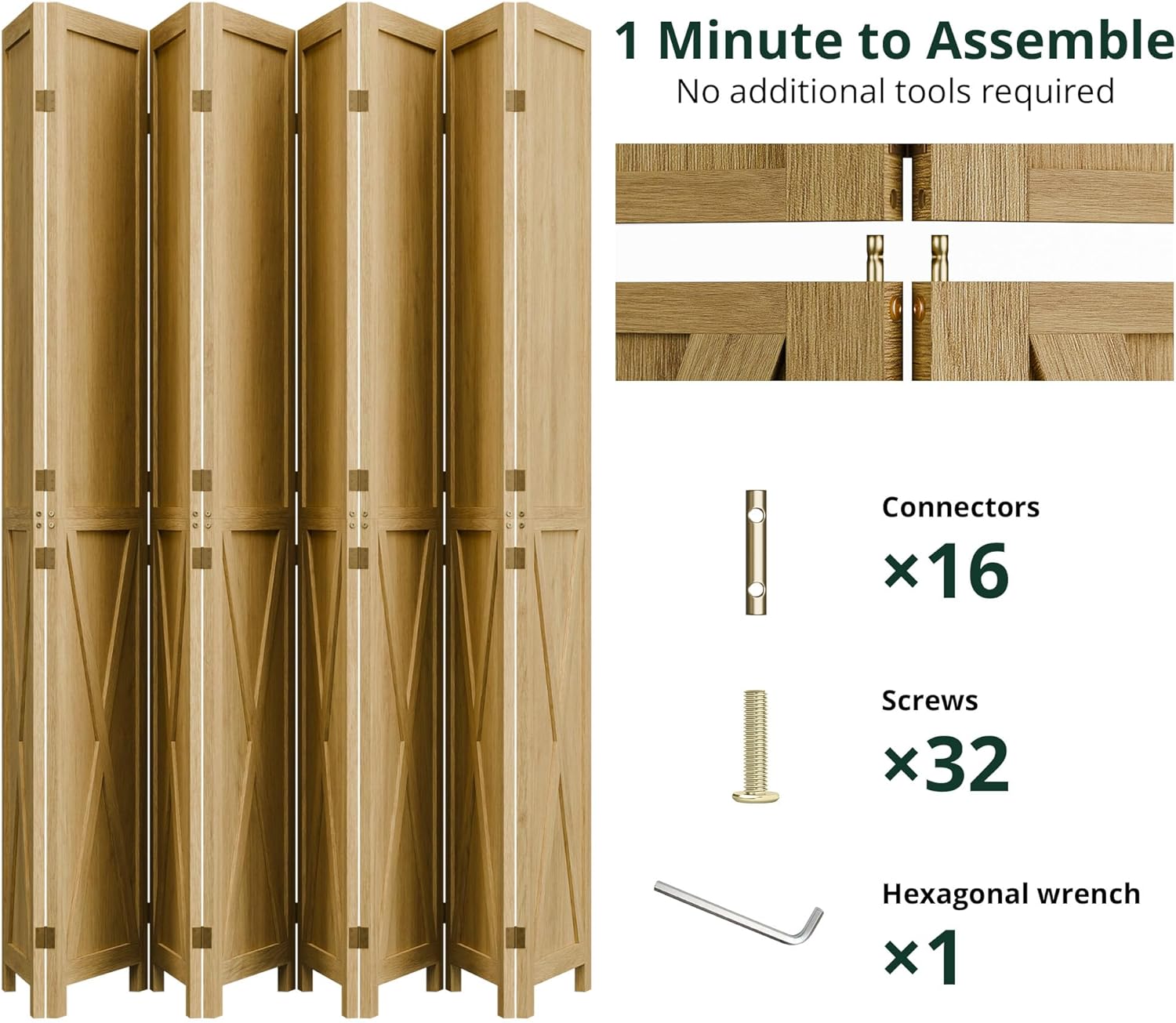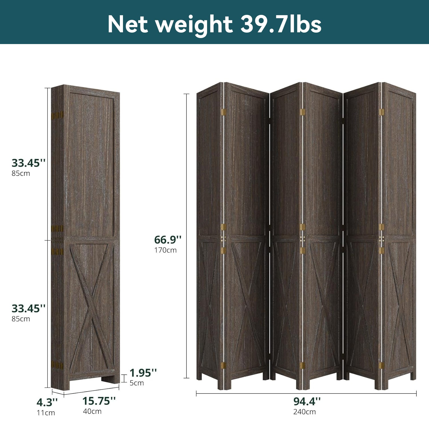 This folding room divider uses solid wood panels connected by metal hinges, which allows it to open, bend, and fold naturally. Each panel measures 66.9" H x 15.75" W. You can choose the number of panels based on how much space you want to separate.