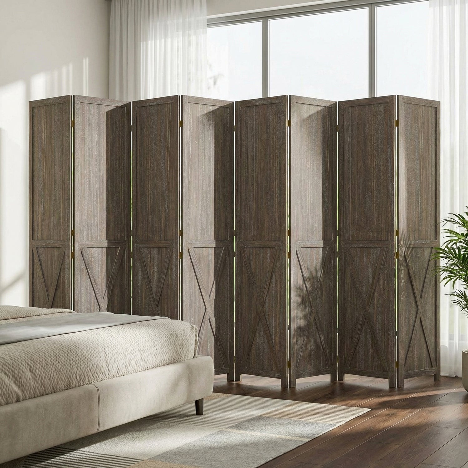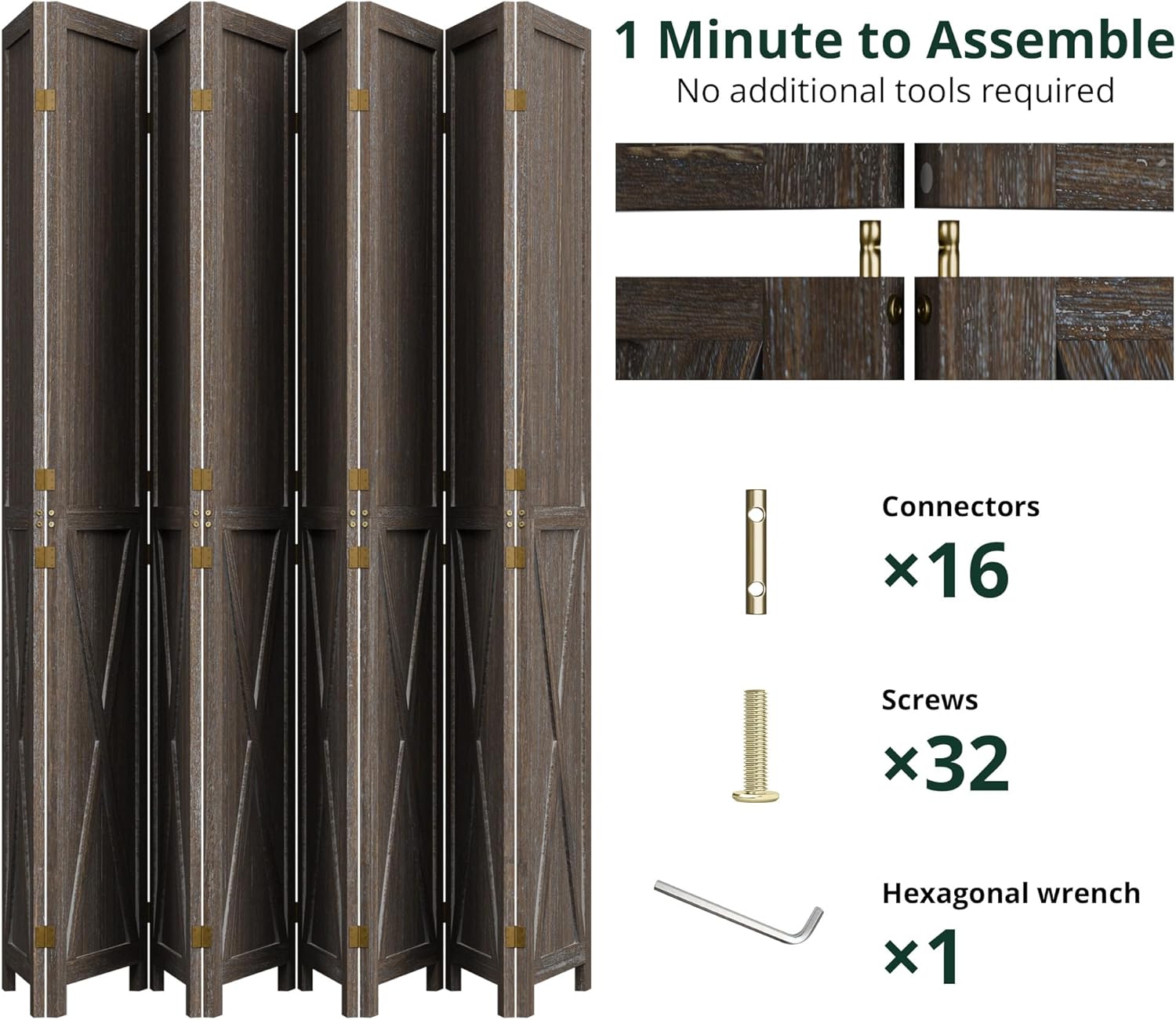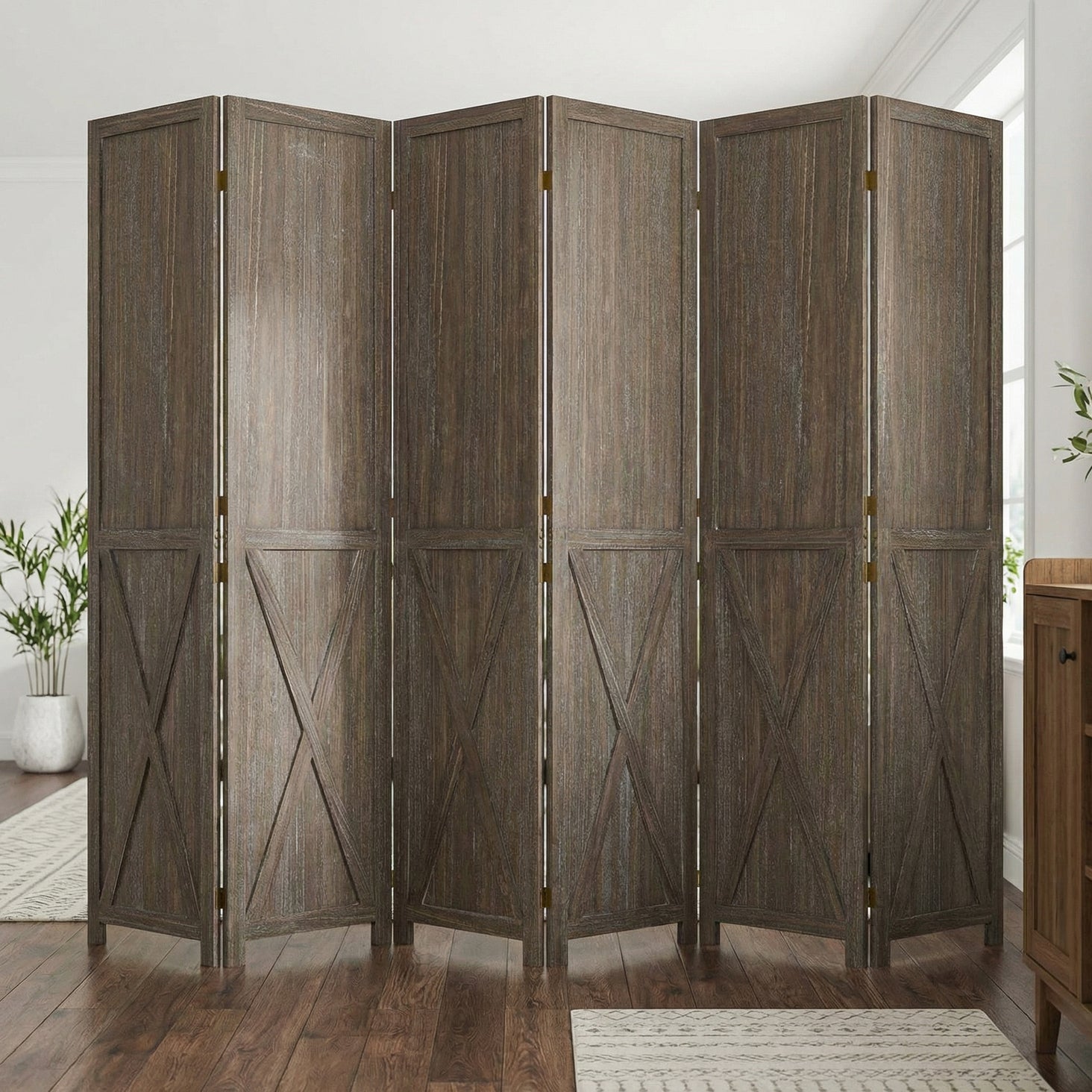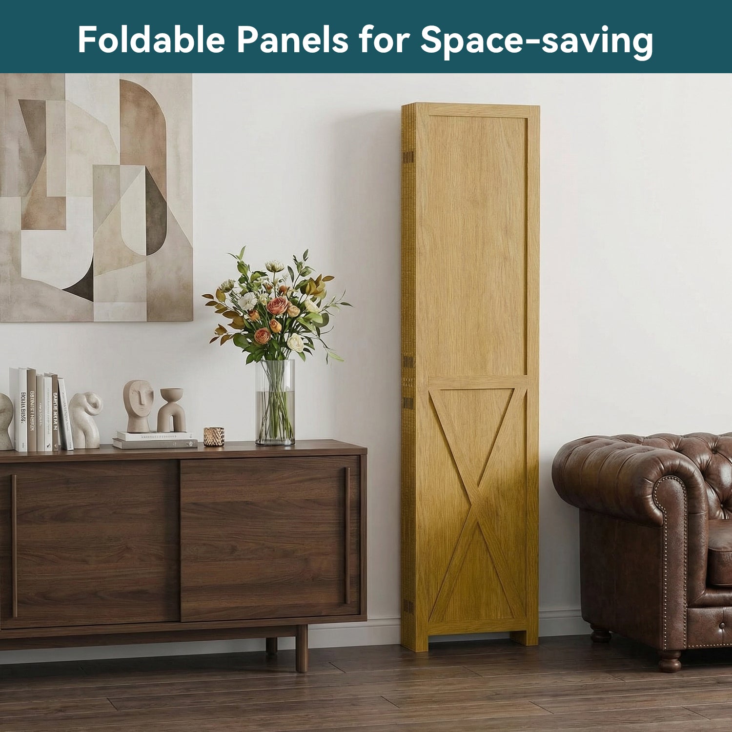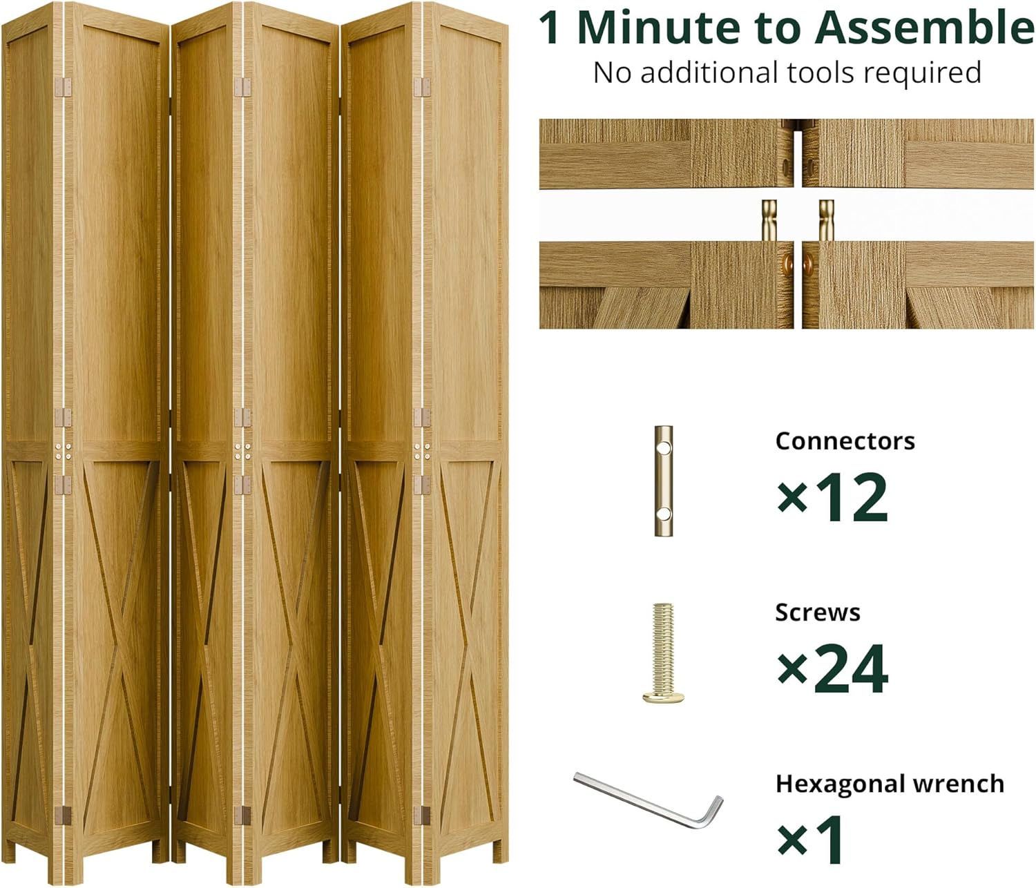 This folding room divider uses solid wood panels connected by metal hinges, which allows it to open, bend, and fold naturally. Each panel measures 66.9" H x 15.75" W. You can choose the number of panels based on how much space you want to separate.