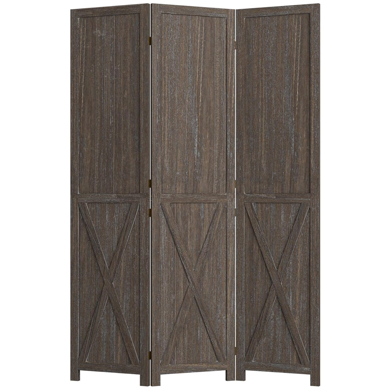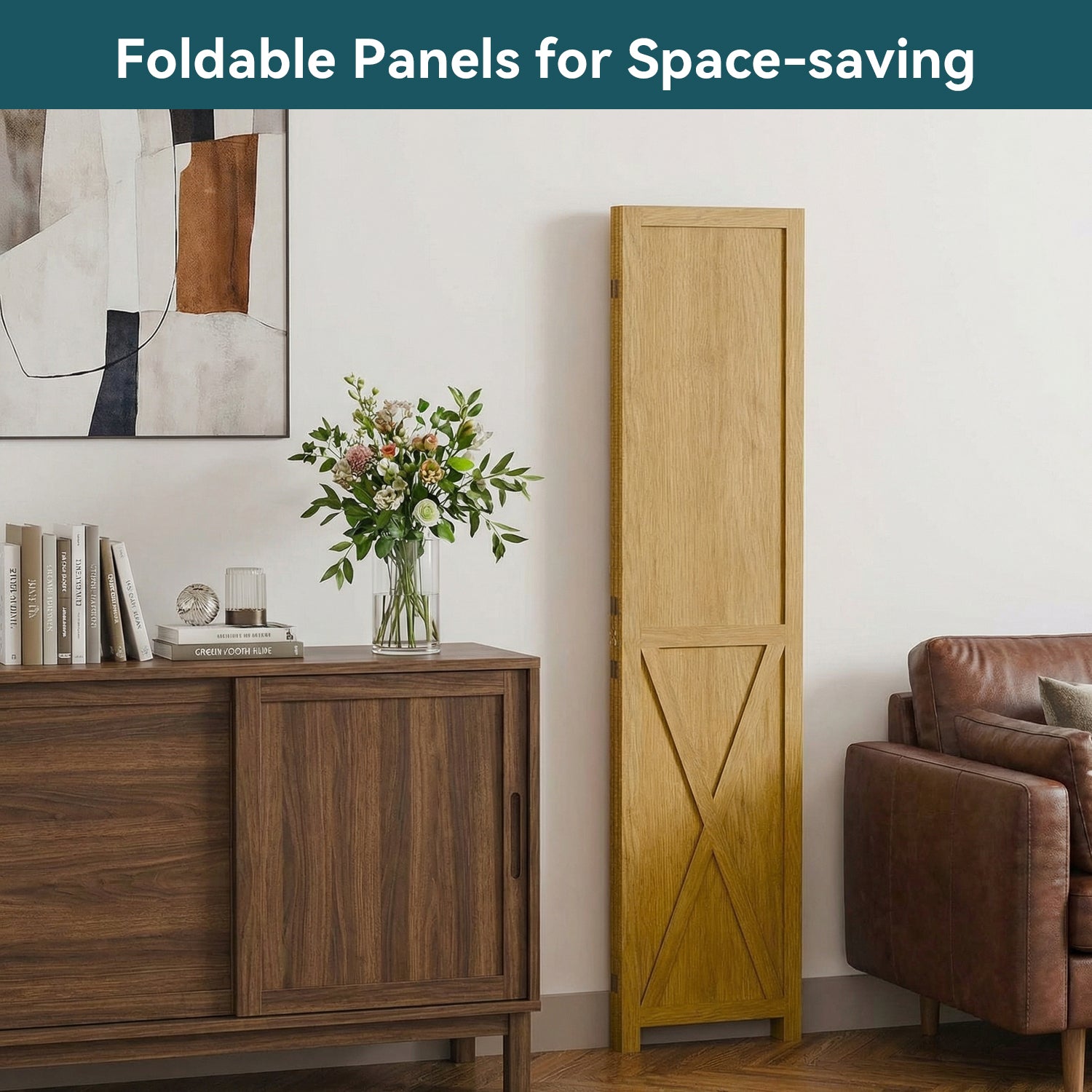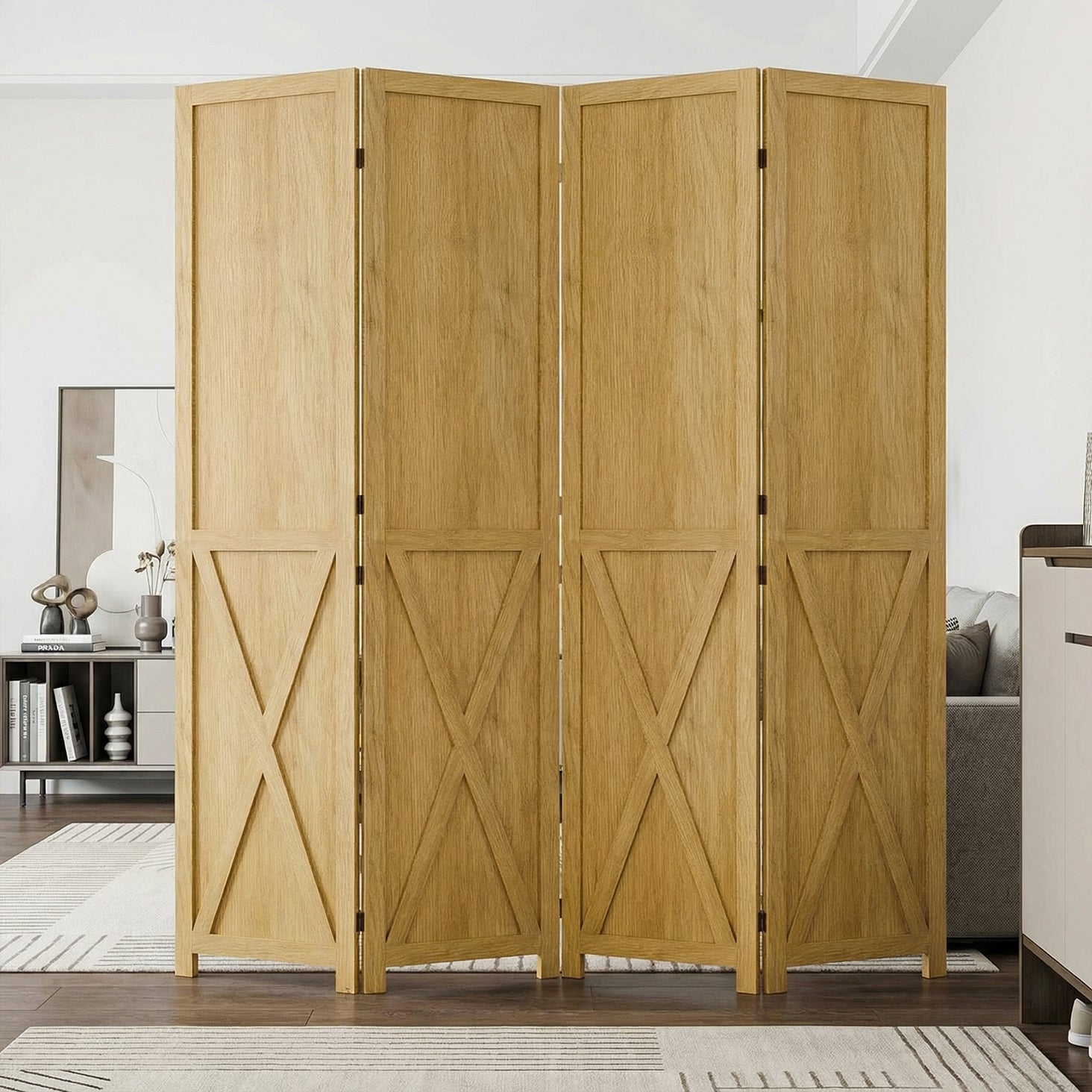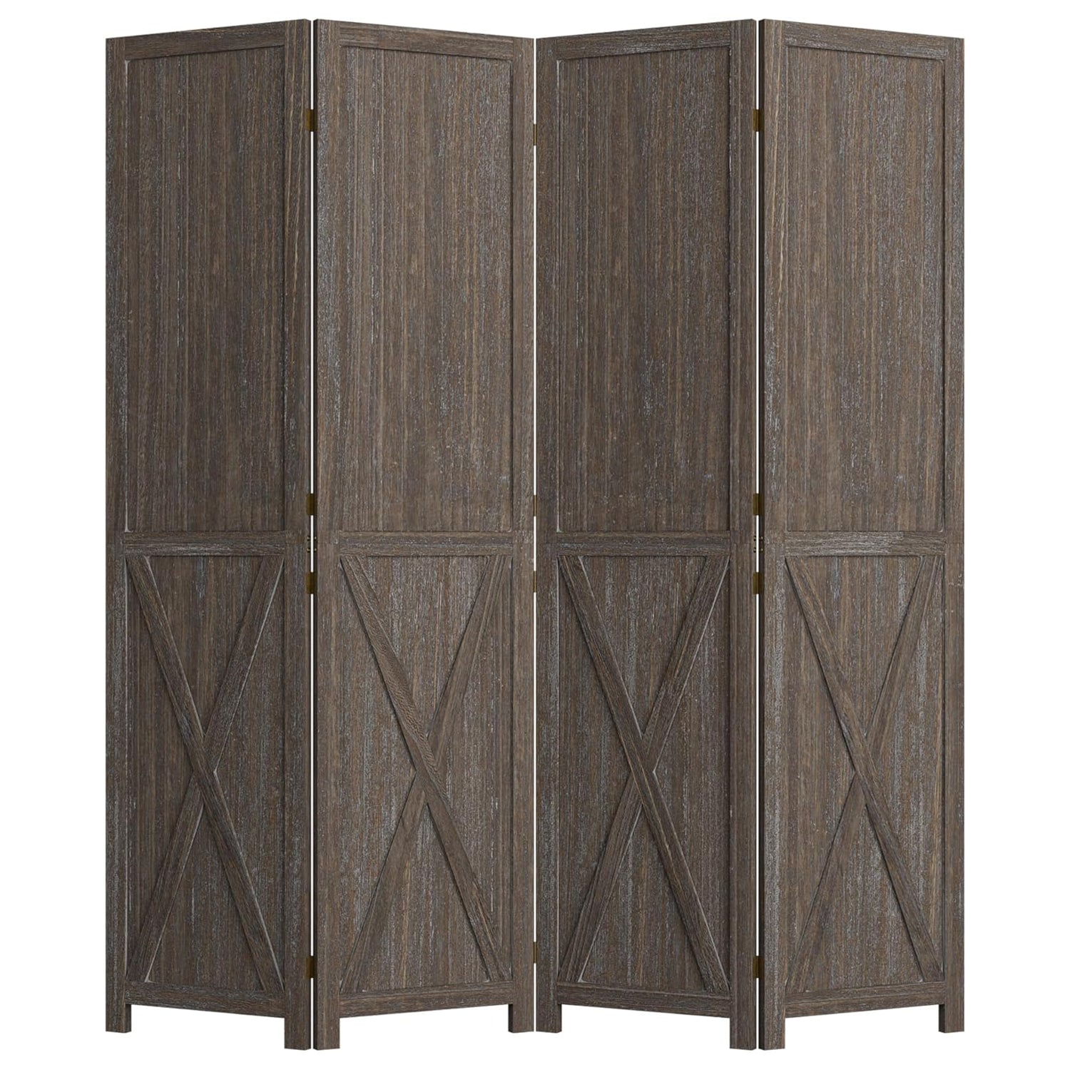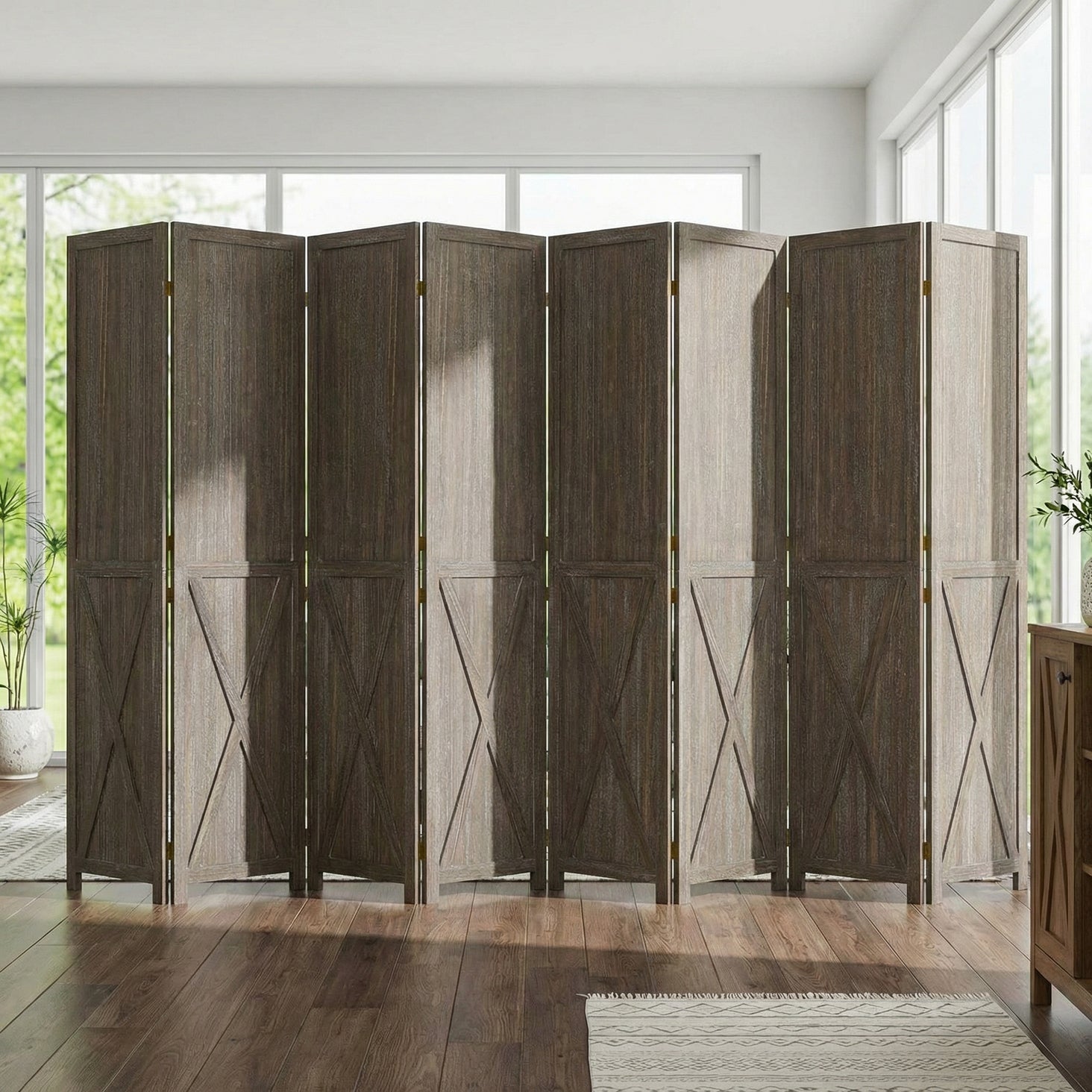 This folding room divider uses solid wood panels connected by metal hinges, which allows it to open, bend, and fold naturally. Each panel measures 66.9" H x 15.75" W. You can choose the number of panels based on how much space you want to separate.