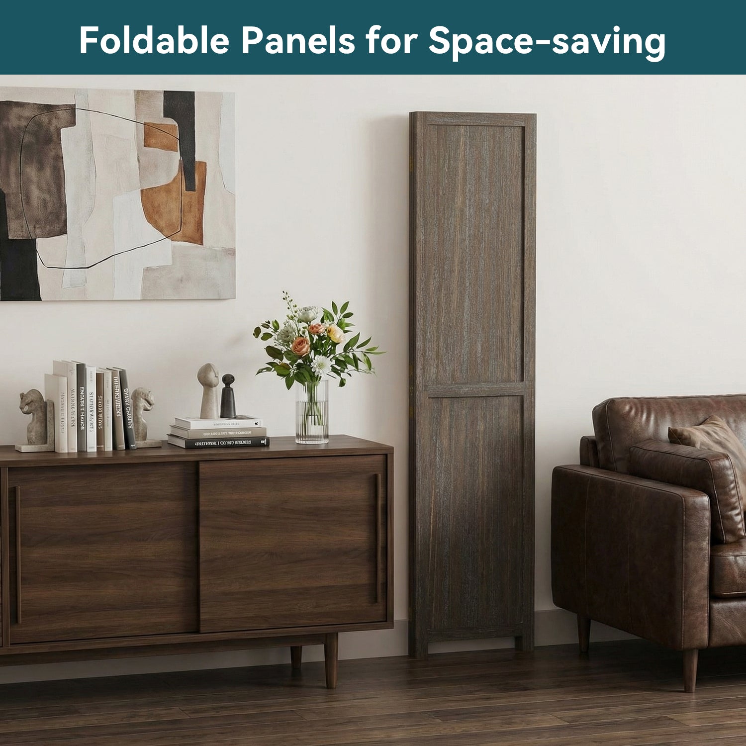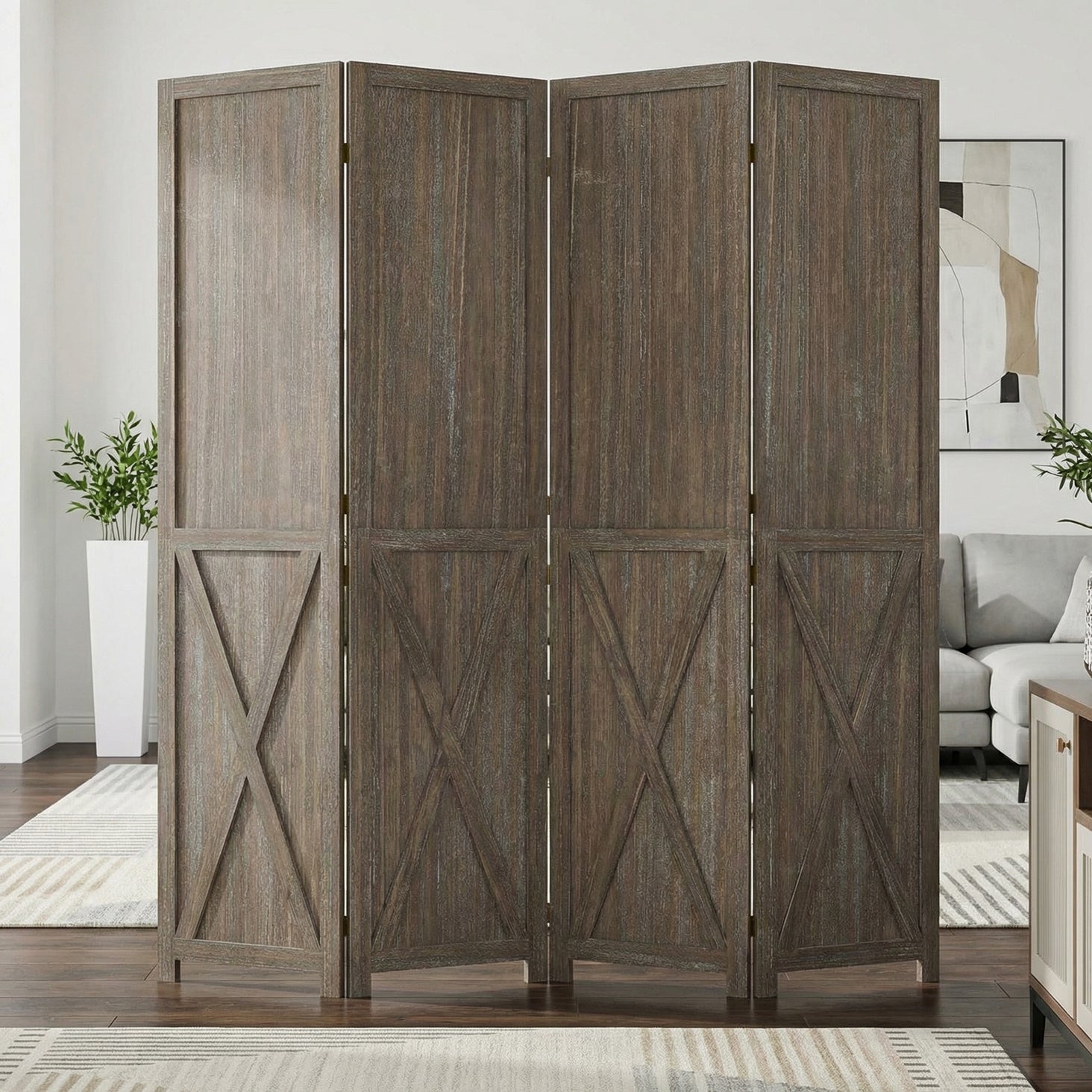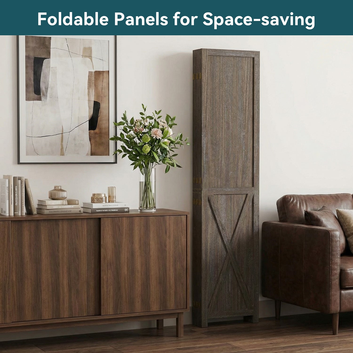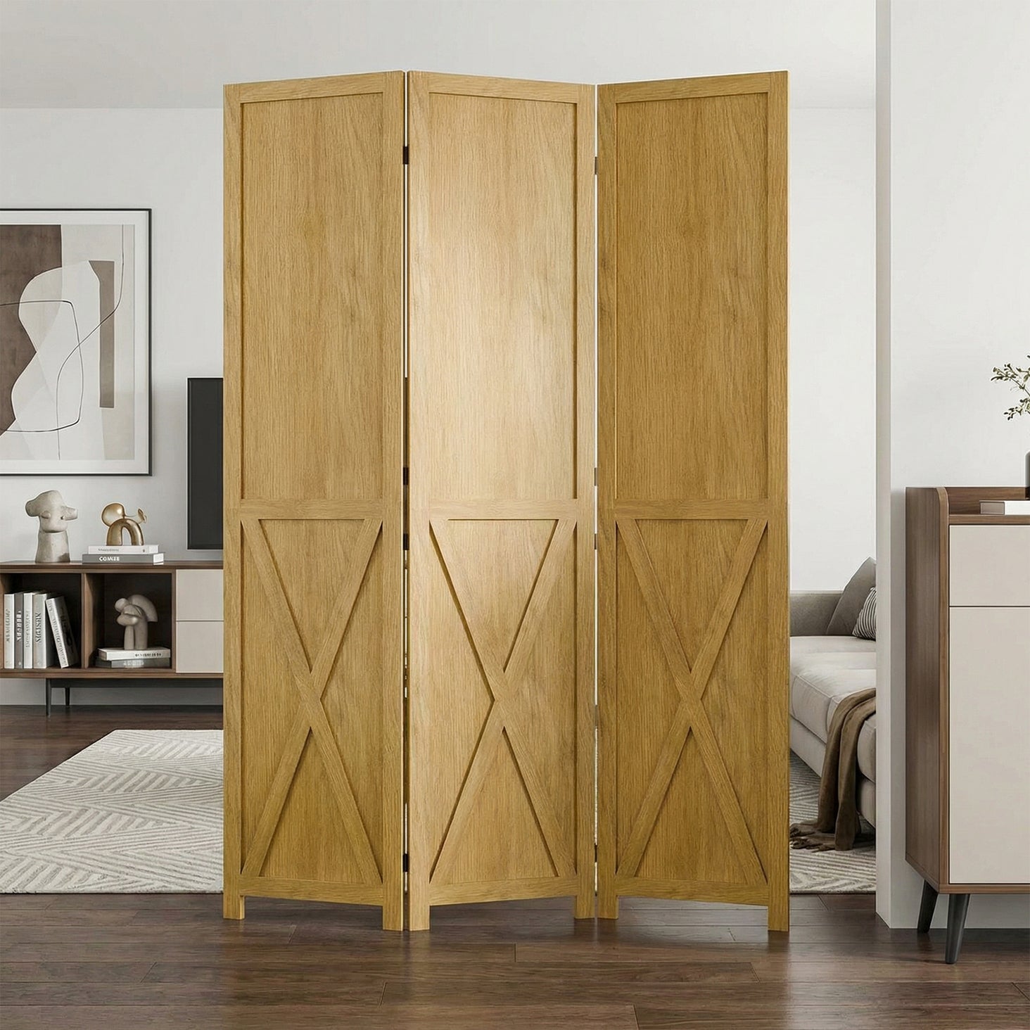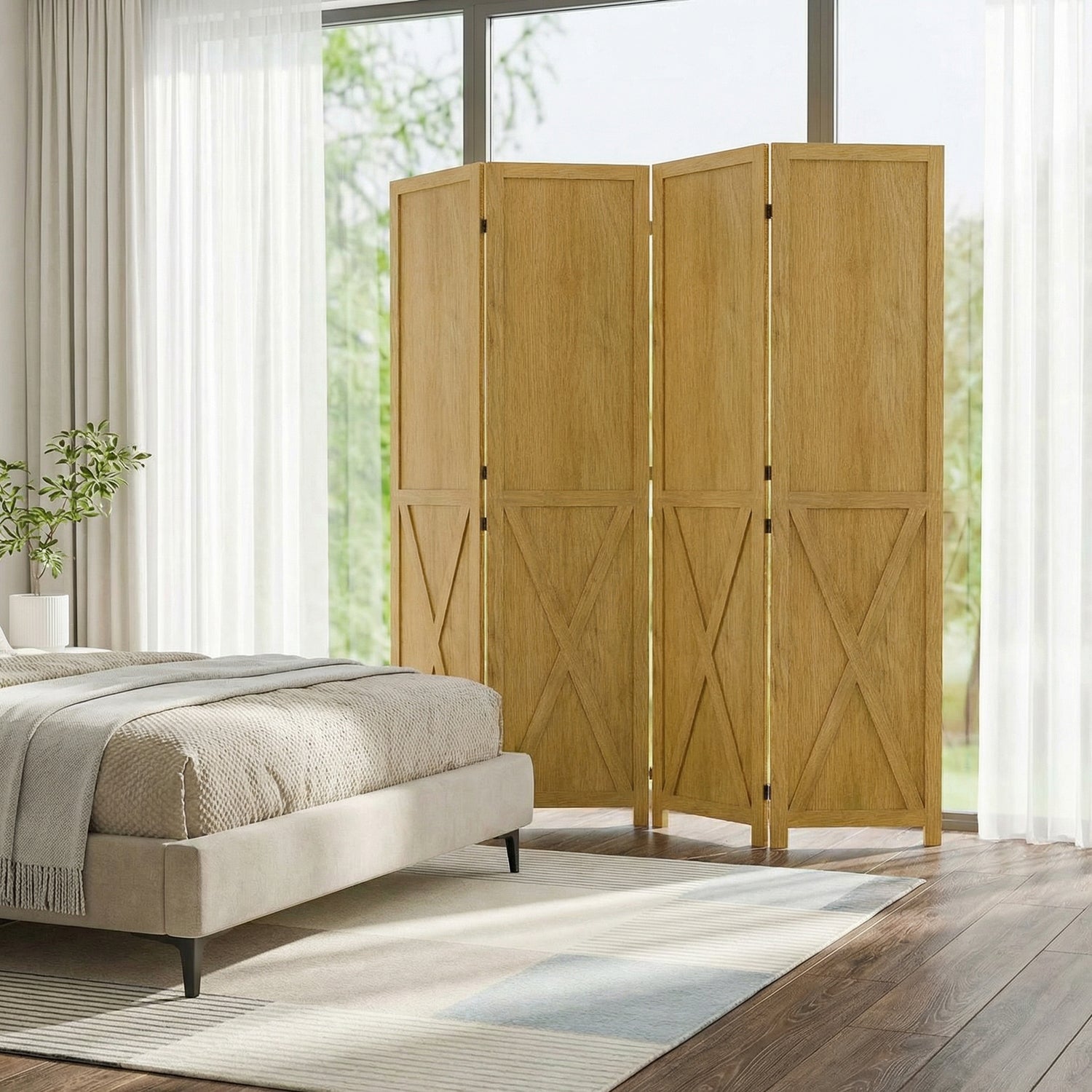This folding room divider uses solid wood panels connected by metal hinges, which allows it to open, bend, and fold naturally. Each panel measures 66.9" H x 15.75" W. You can choose the number of panels based on how much space you want to separate.