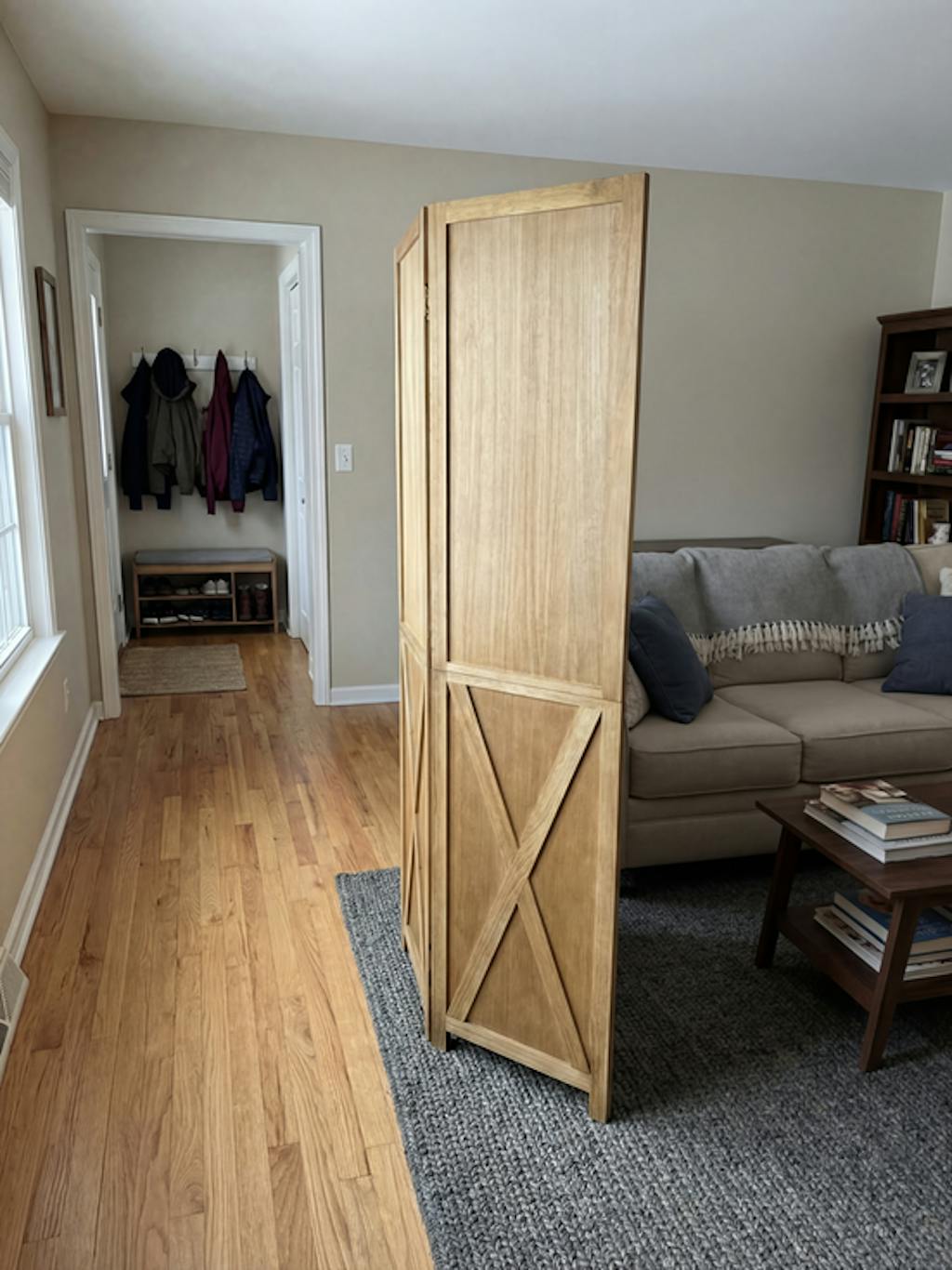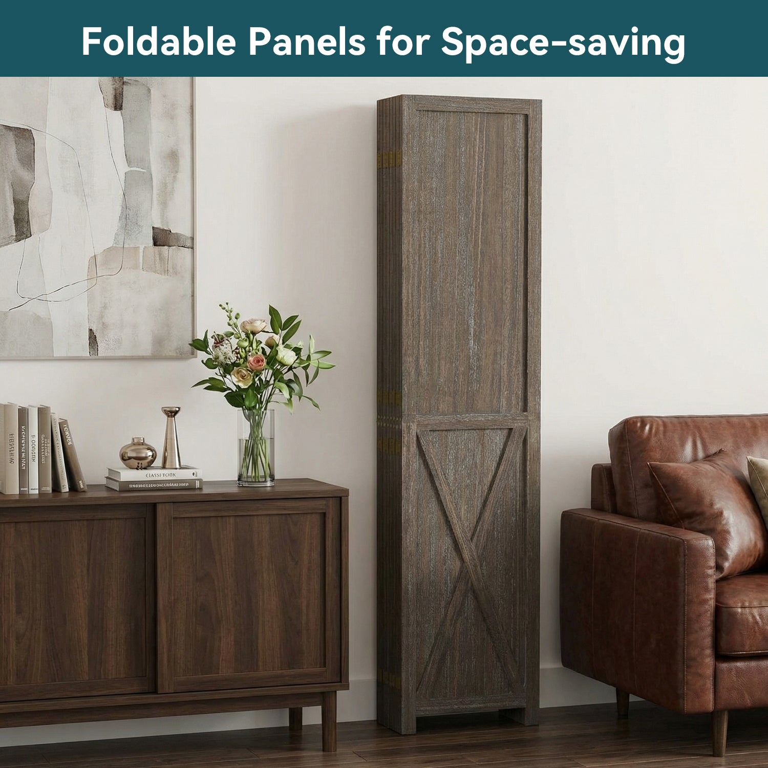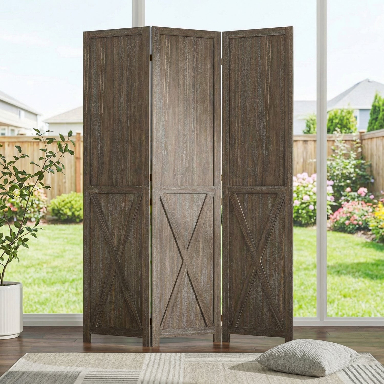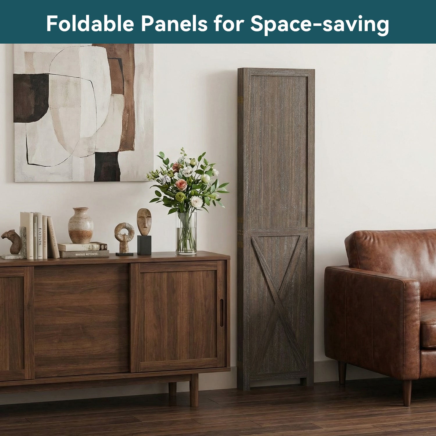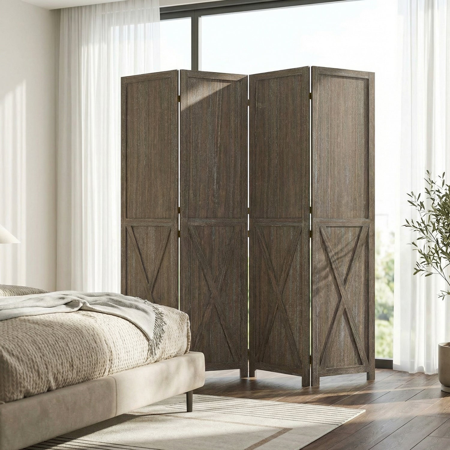 This folding room divider uses solid wood panels connected by metal hinges, which allows it to open, bend, and fold naturally. Each panel measures 66.9" H x 15.75" W. You can choose the number of panels based on how much space you want to separate.