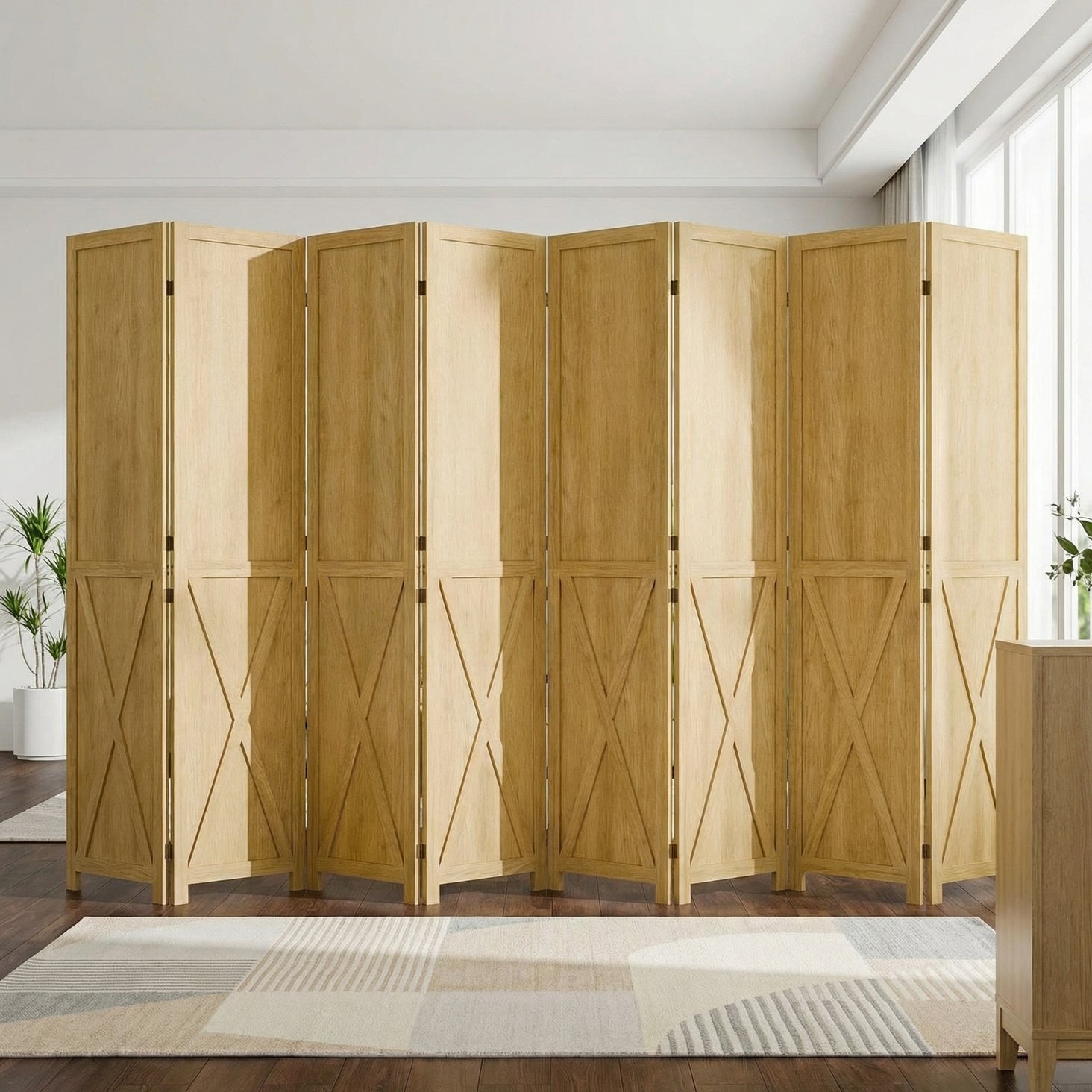 To keep the divider standing securely, it’s best to set the angle between panels at 135 degrees or less. When the joints are slightly V-shaped, the weight is spread more evenly. This setup works well on thick carpet, hardwood floors, tile, and more.