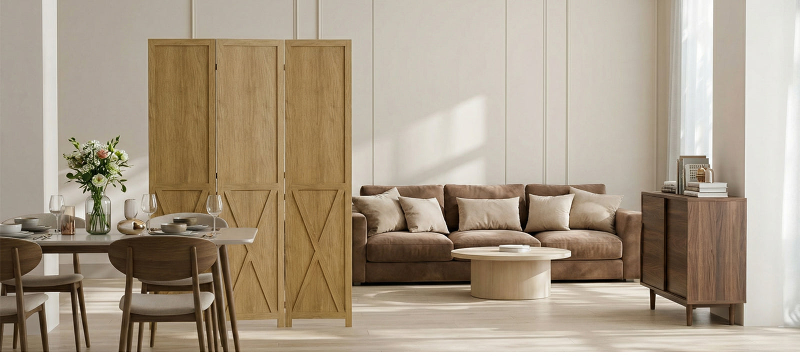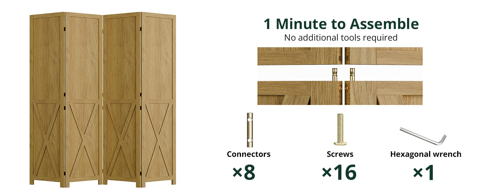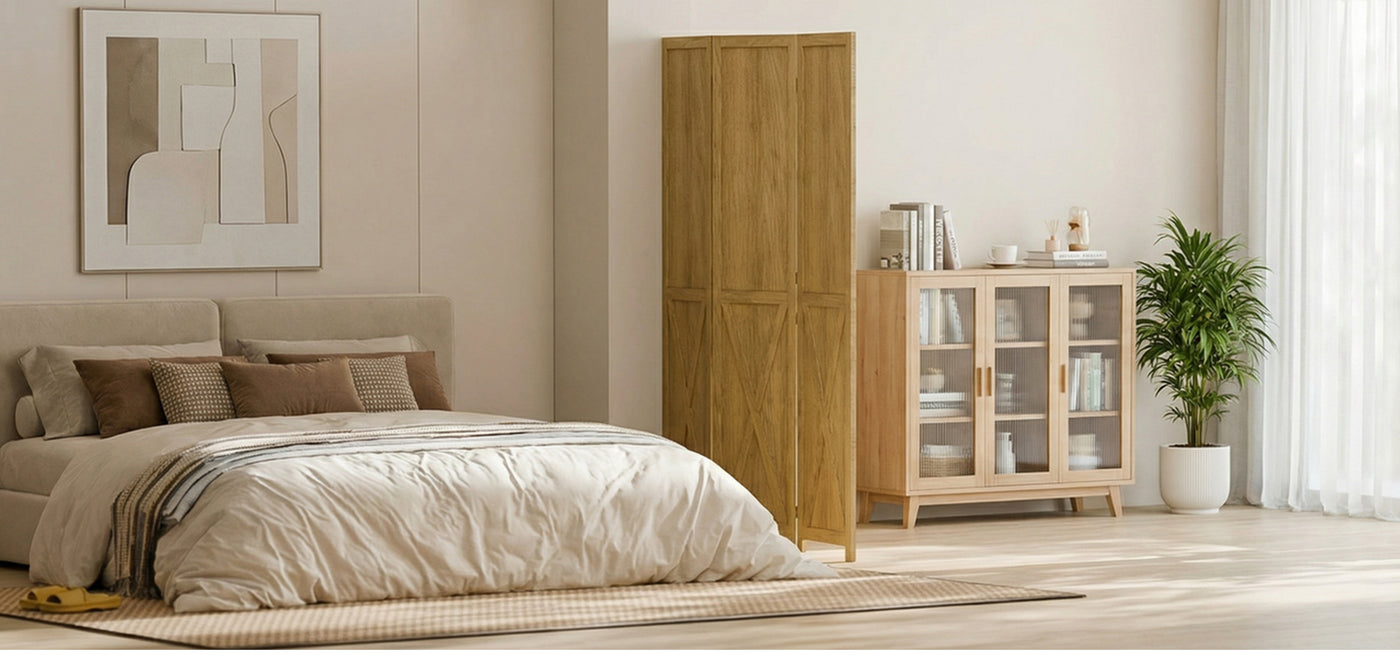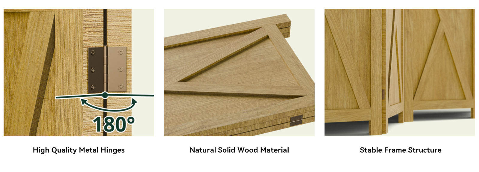 All panels are made from natural solid wood, and the frame is reinforced for everyday use. The wood is polished, so the surface feels smooth and clean. This finish also makes the panels easier to wipe down and helps the wood hold up better over time.