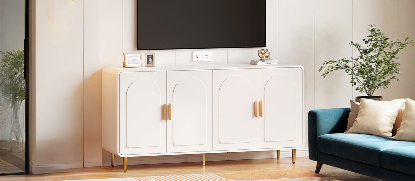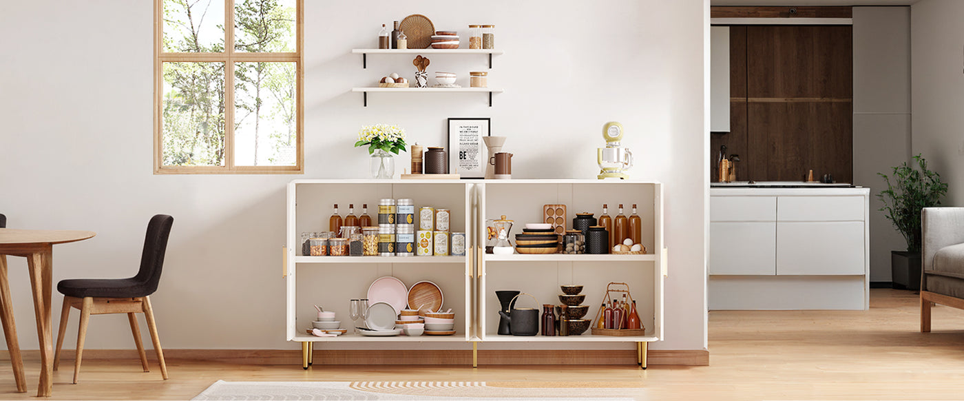 This white sideboard cabinet is made of the metal reinforcement strip added at the bottom to make it more durable and prevent deformation. With 4 drawers and 2 adjustable shelves, the cabinet allows you to customise your storage as needed and free up more space. The dimensions of the buffet cabinet are 15.7 ‘D x 60 “W x 31.1” H.