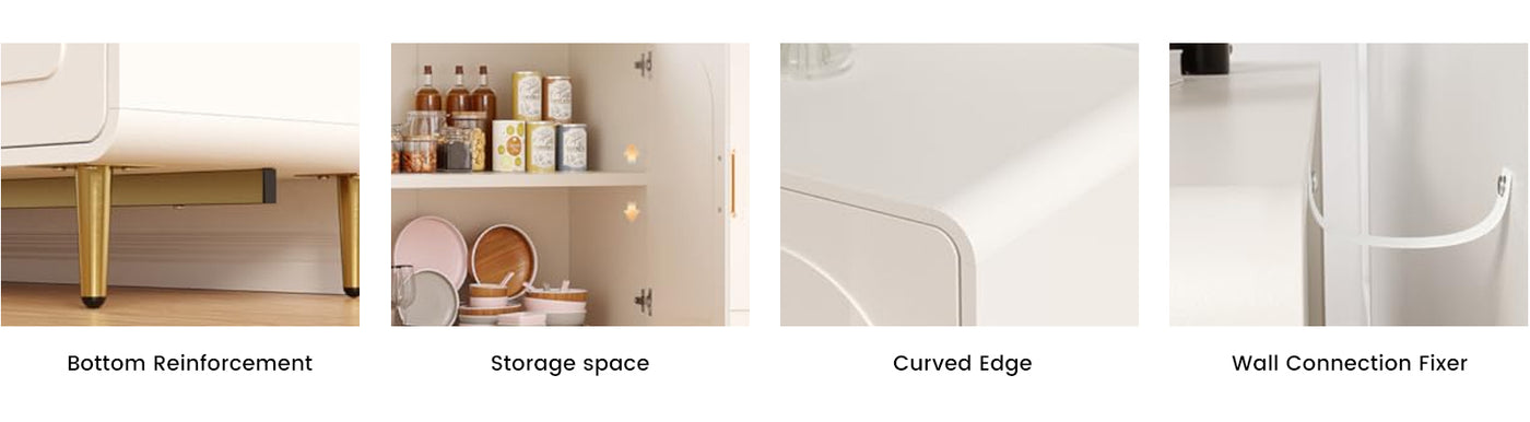 In addition, the four edges of this cabinet feature a modern curved design that adds to its aesthetics and adapts perfectly to a variety of usage scenarios. The curved edge design of the table is safer than the sharp right-angle design. This sideboard is suitable for dining rooms, living rooms, kitchens, hallways, bedrooms, and other scenes, and its simple design can match various home styles.