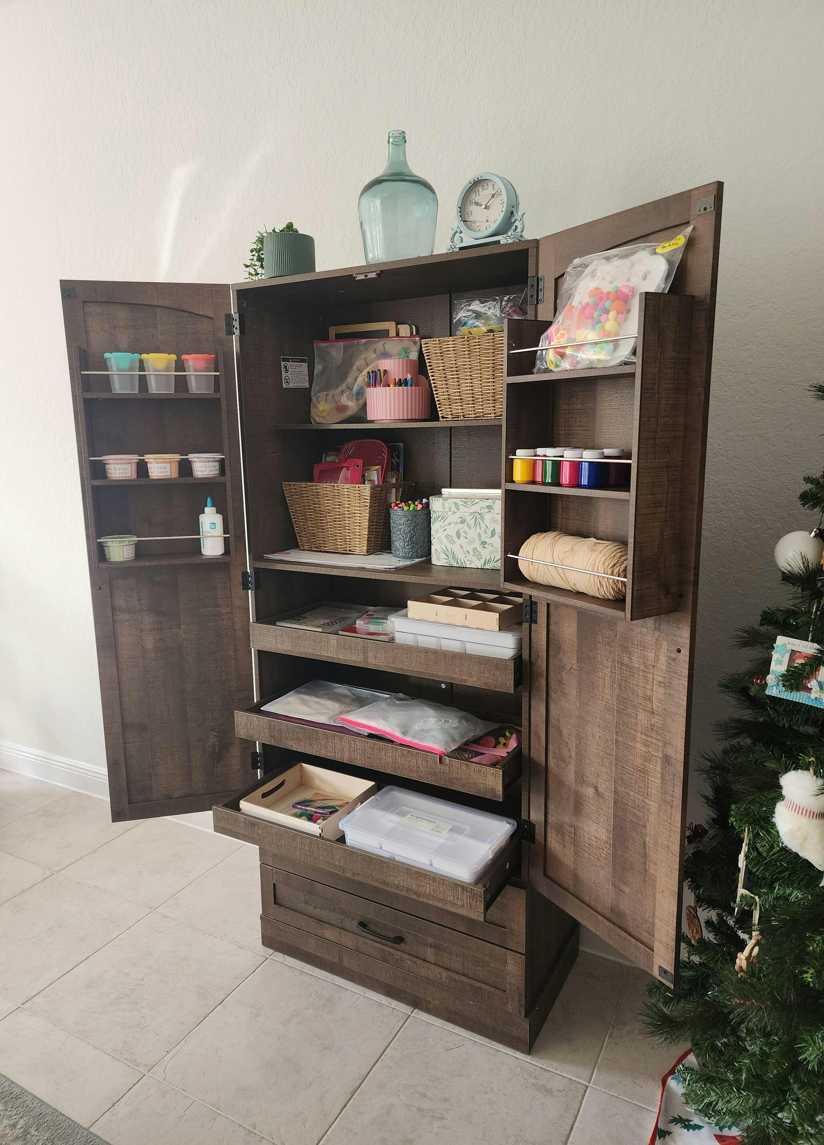 The upper shelves of this pantry organizer are height-adjustable. This feature is very convenient when storing food or bottles that need to be at a height. This farmhouse pantry storage cabinet is made of high-quality engineered wood and a sturdy base. The surface of this pantry storage cabinet is watertight and easy to maintain.
