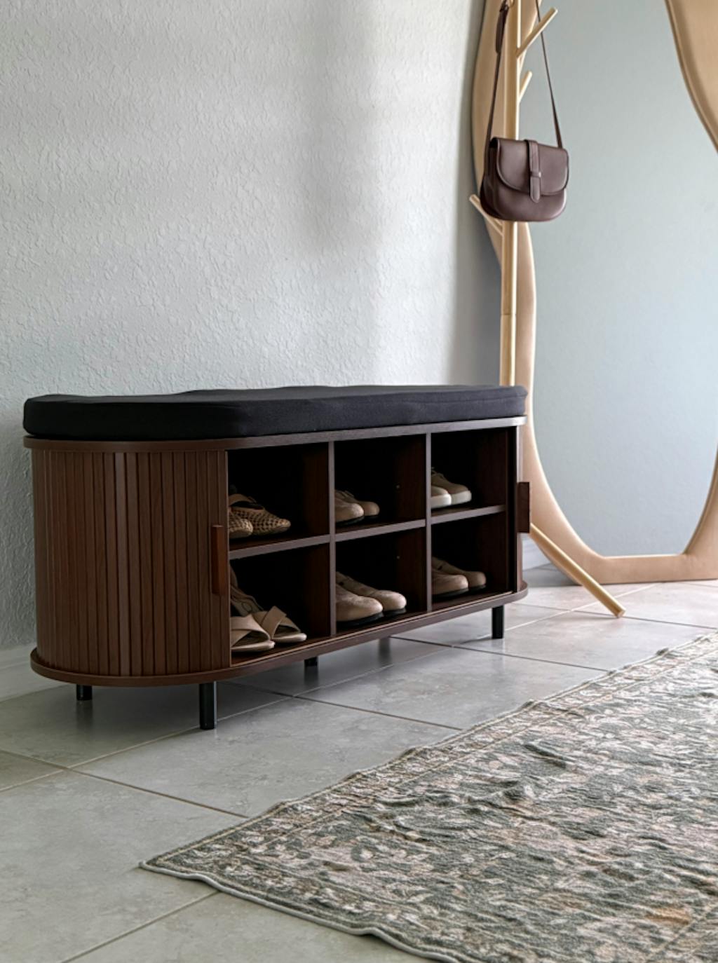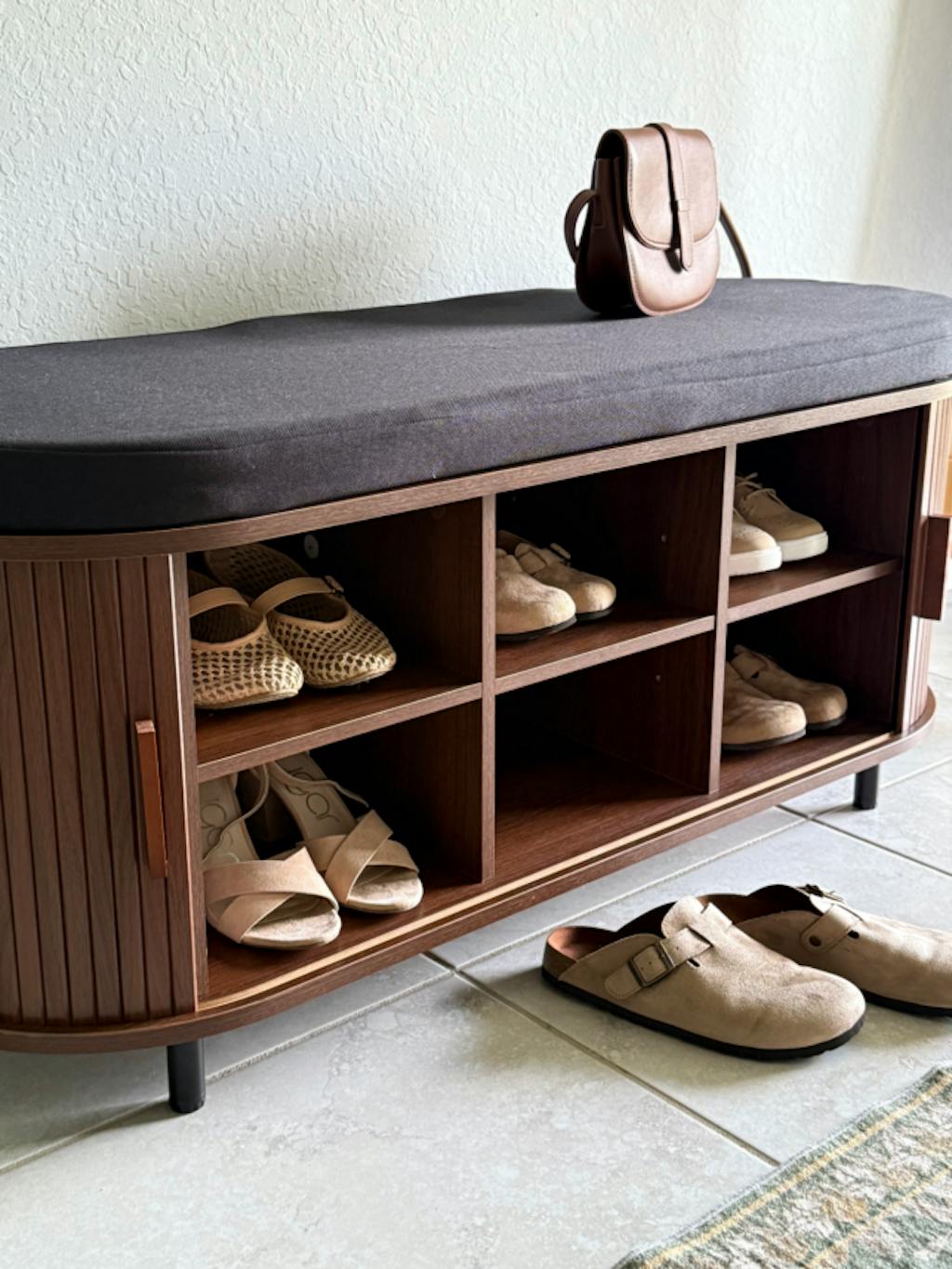 This shoe bench is part of the OHWILL furniture family's sliding door collection. This entryway bench features a special design with curved edges and sliding doors. Although the sliding doors are complex, they are both practical and beautiful. Opening and closing the storage door is like opening and closing a scroll painting.