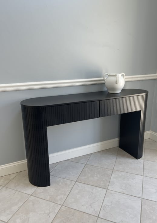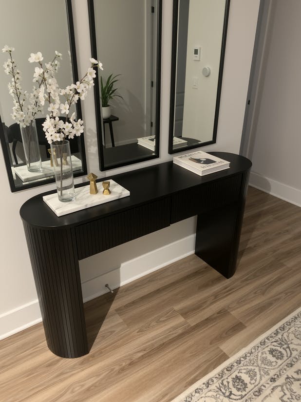 The entry table is crafted with a thicker tabletop and reinforced legs for stability. Rounded corners and fluted panels give it a soft, modern look, so it works well no matter if your home is more classic or contemporary. There are also small details like anti-tip hardware and pads under the legs that add to its safety and durability.