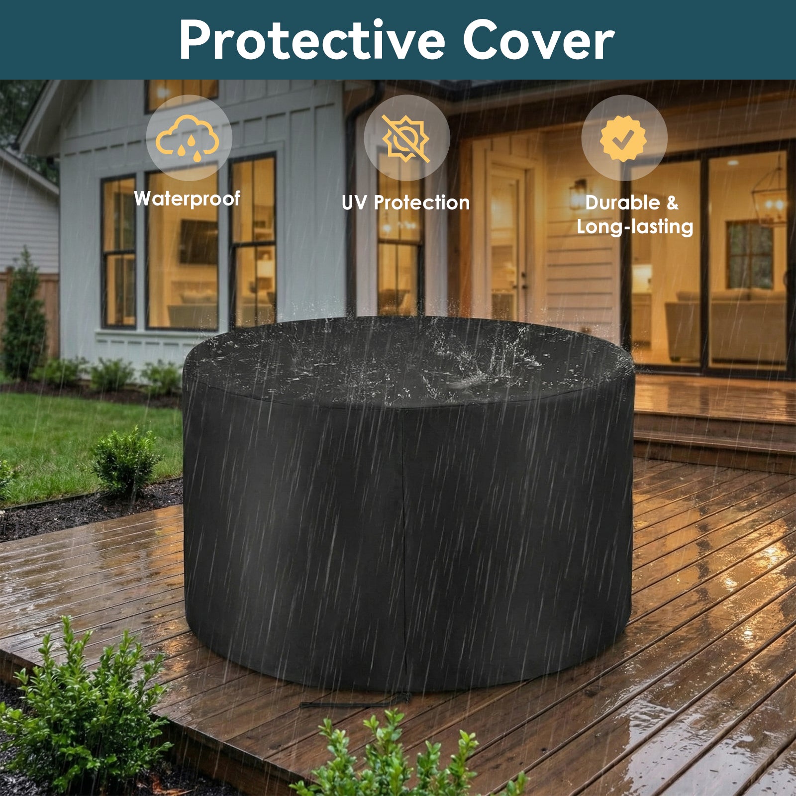 The package includes a propane fire table, round cover, blue fire-resistant glass, a waterproof fire pit cover, screw accessories, and a user manual.