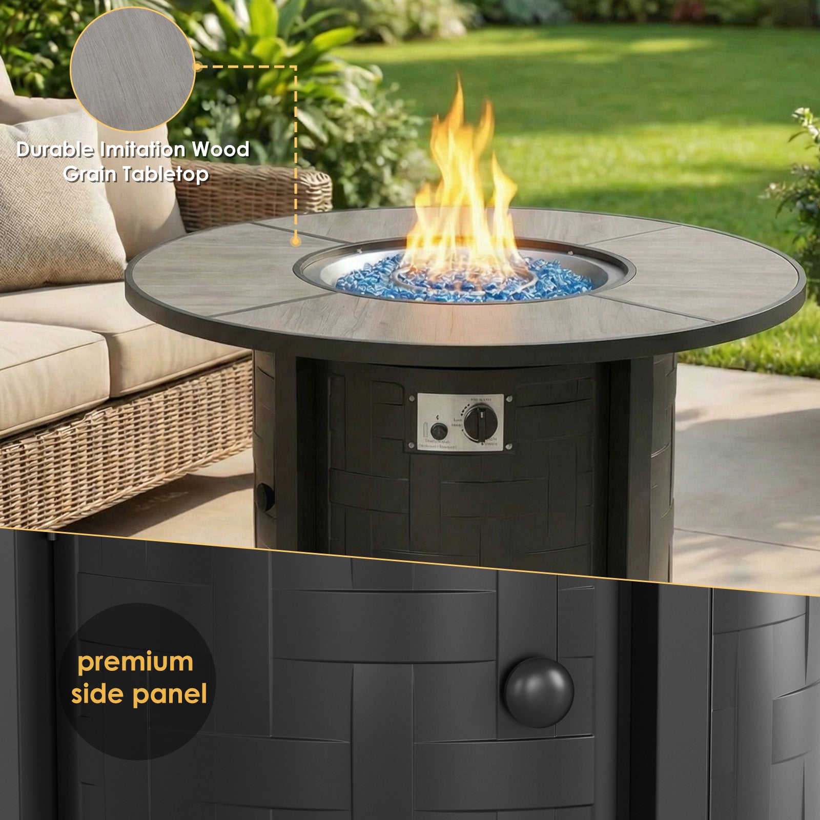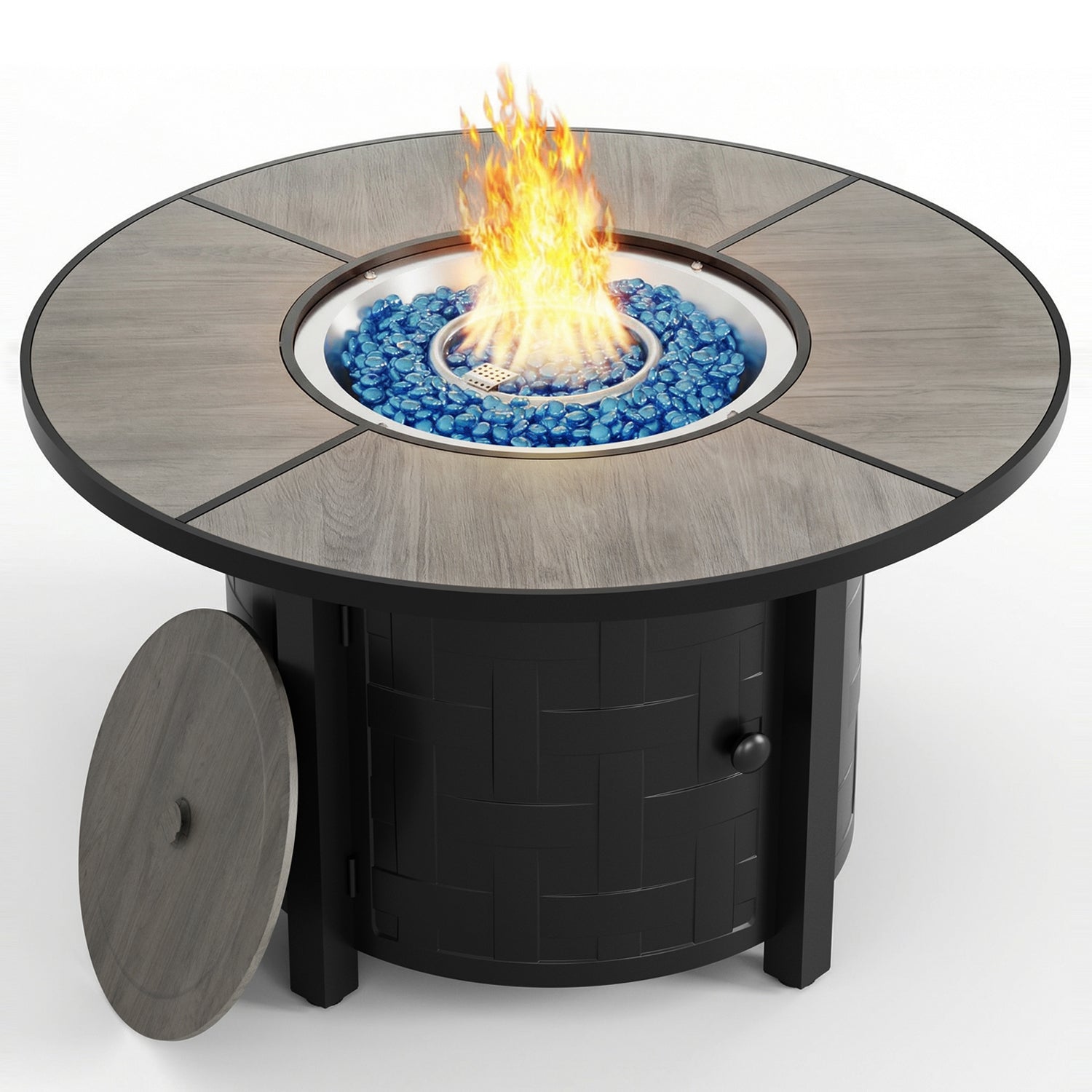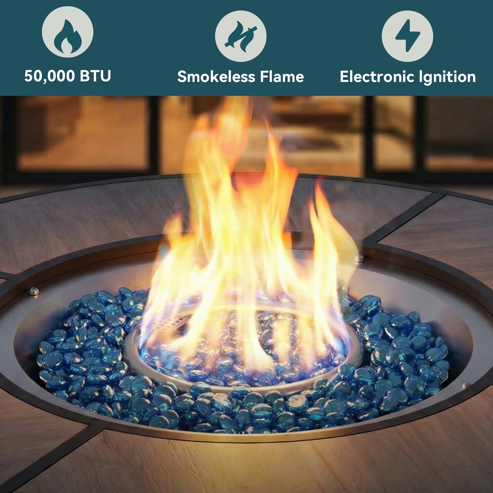 50,000 BTU of heat. Just use the knob to turn it on or off for warmth. The gas fire pit possesses CSA certification and burns fully after electronic ignition. Secure the propane tank bracket to hide the propane tank and make filling easier.