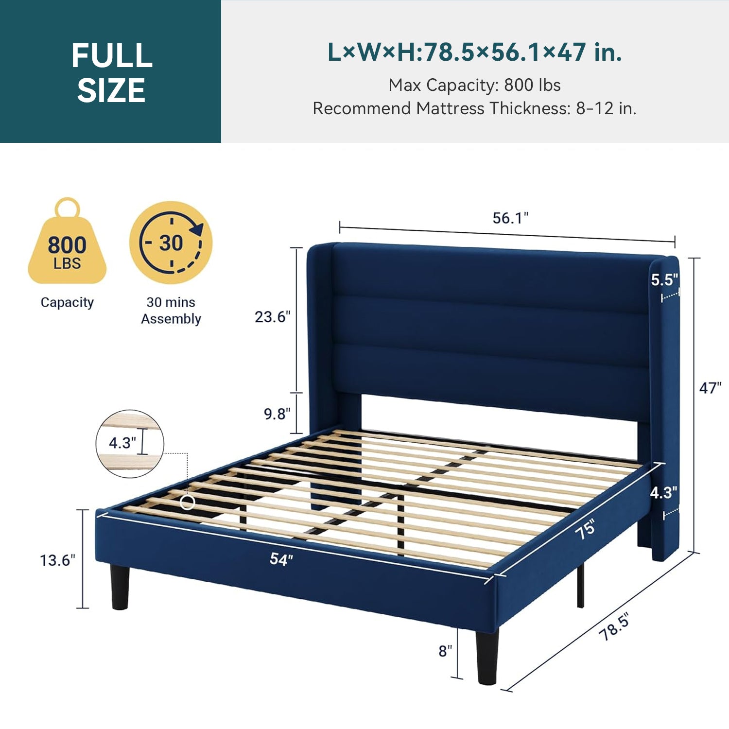 Full-Size Bed Frame 78.5"L x 56.1"W x 47"H
