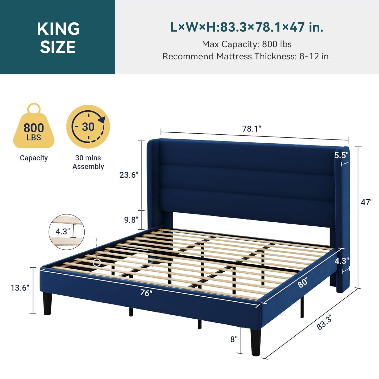 King Size Bed Frame 83.3"L x 78.1"W x 47"H