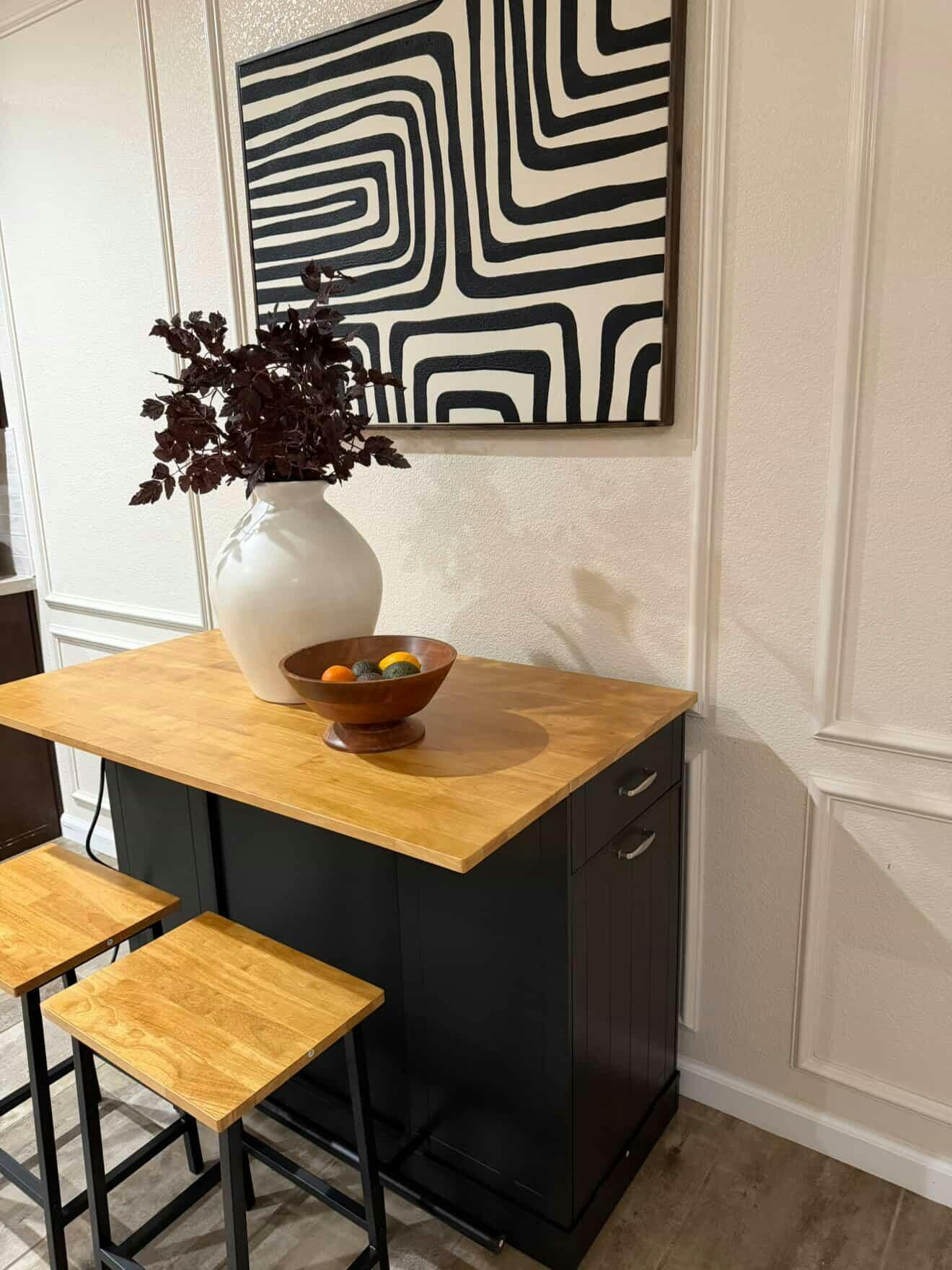 The kitchen island is equipped with an adjustable footrest and an innovative floor-adaptive knob that accommodates a variety of flooring materials such as tile, wood and self-levelling floors. In addition, the bar stools are designed with a support bar that effectively distributes 30% to 40% of the weight pressure on the thighs, greatly enhancing convenience and comfort at mealtimes. The countertop of the kitchen island is made of wood to ensure durability and resistance to bending, splitting and cracking. The finish adds an extra layer of protection, making it very easy to clean and maintain. You can tackle kitchen tasks without worrying about wear and tear.