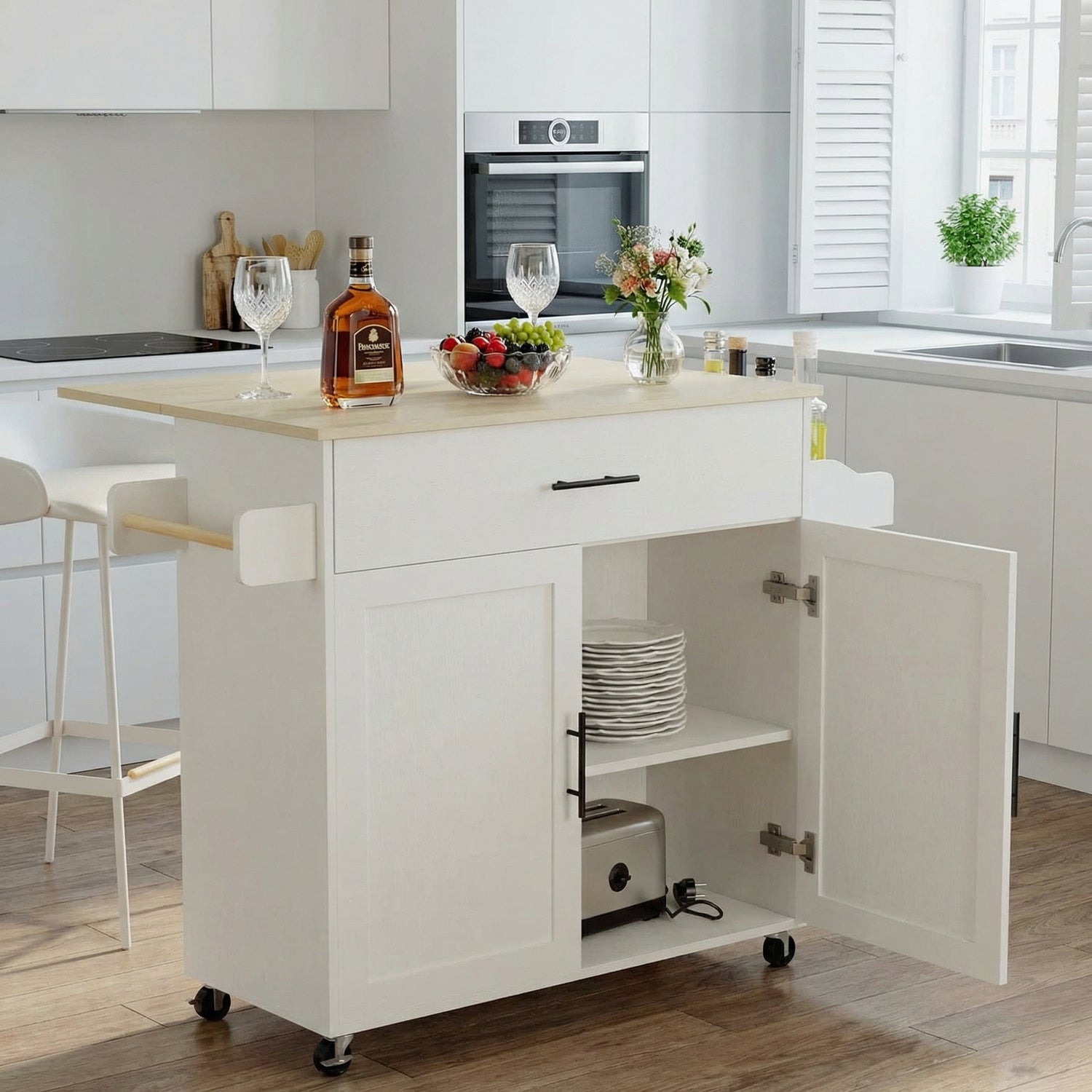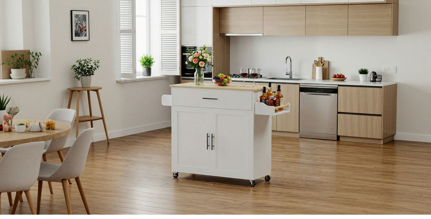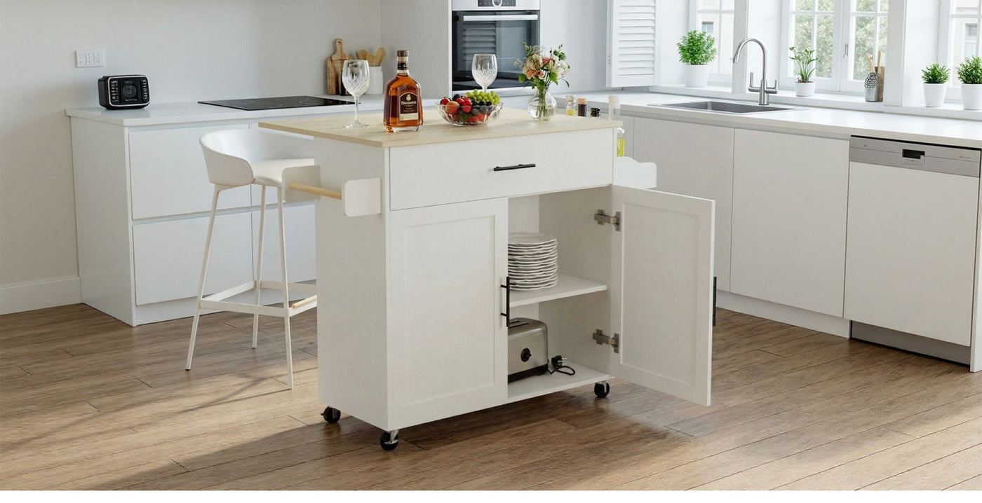 This rolling kitchen island cart adds flexible workspace and smart storage to your kitchen without the cost or hassle of a full remodel. Its clean, timeless design blends effortlessly with a variety of kitchen styles while enhancing everyday functionality.