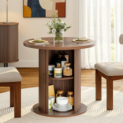 Round Dining Table for 2 with Built-In Storage, 31.5" Small Kitchen Table with Sliding Tambour Door and Wood Strip Base