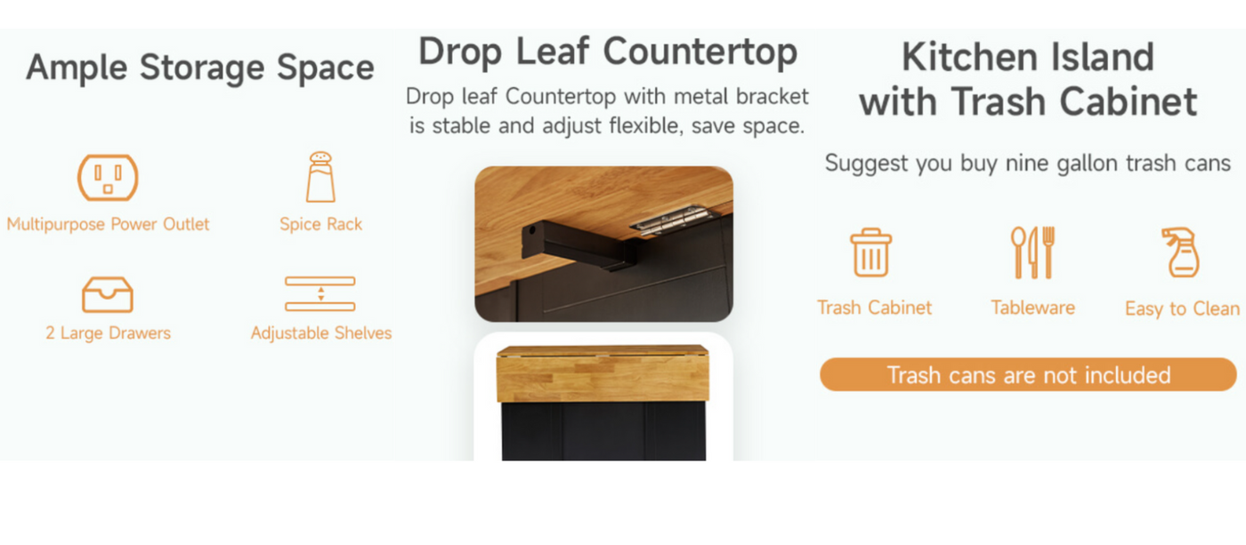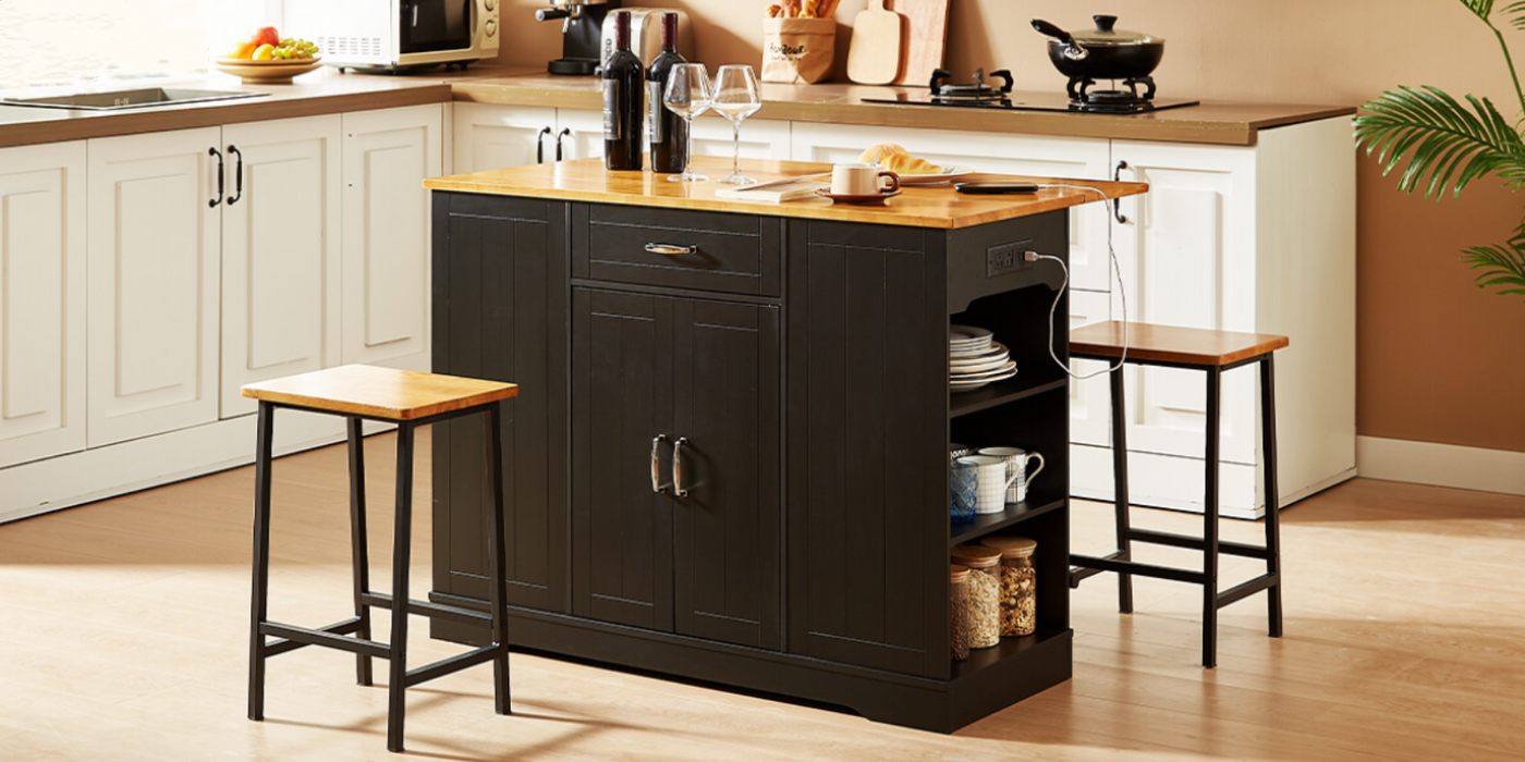Additionally, the kitchen island is equipped with a practical 1500W power outlet that includes 2 USB ports and 2 3-hole outlets, making it easy to charge your cell phone, tablet, or e-reader while using appliances such as a coffee maker, toaster, or microwave. Ideal for kitchens, dining rooms and more.