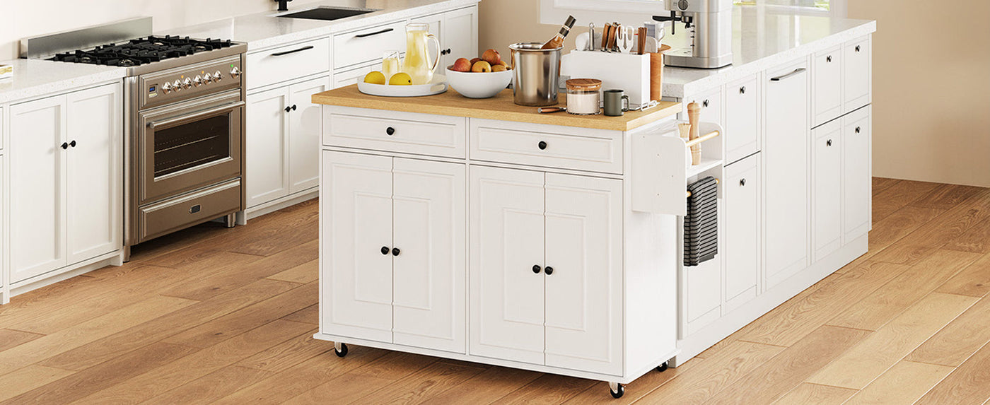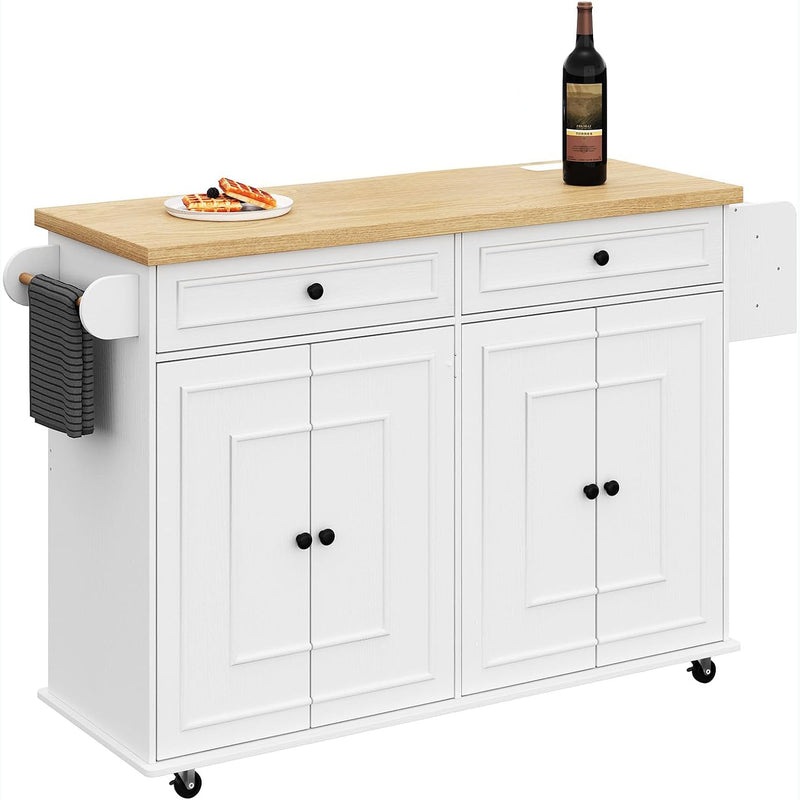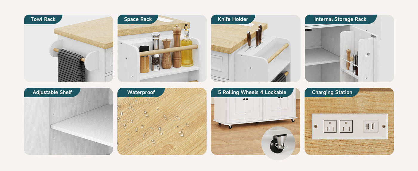 This kitchen cart is equipped with large-capacity storage cabinets and drawers. Built-in adjustable partitions can adjust the layout according to storage needs; shelves are provided on both sides of the cabinet for placing kitchen knives, seasonings, towels, etc.