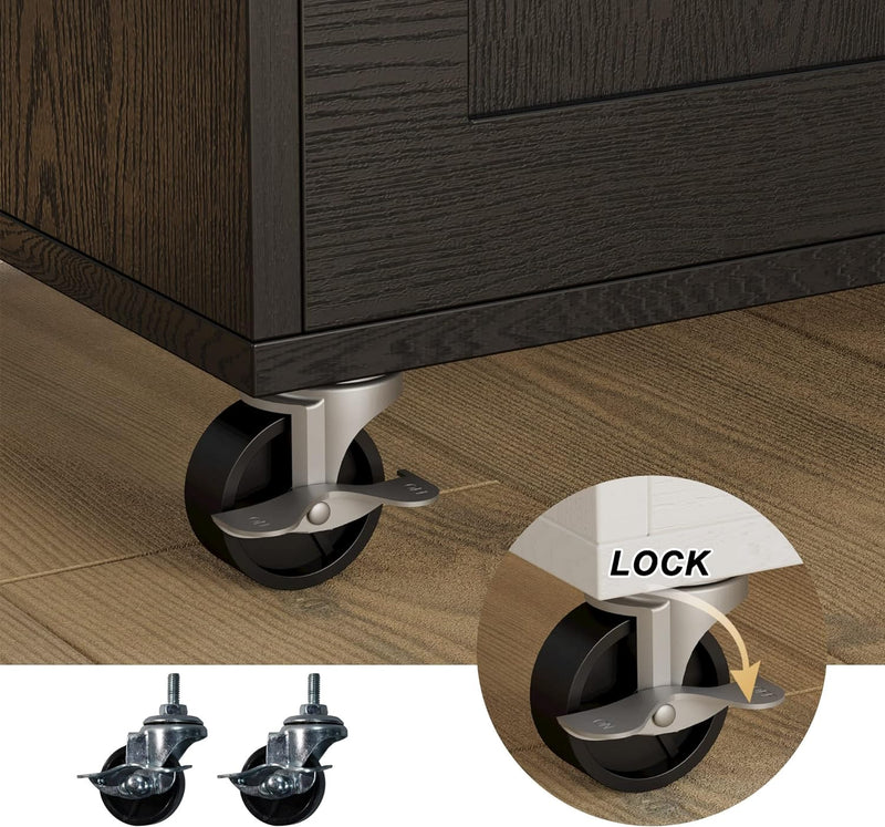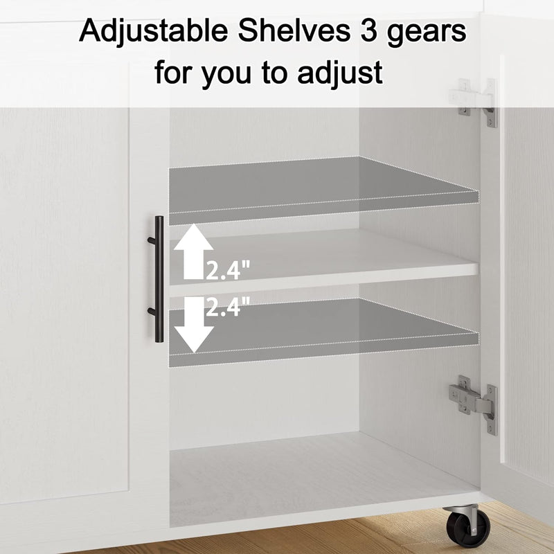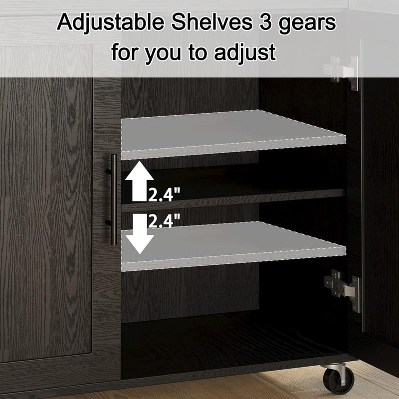 The interior shelves in the cabinet can be adjusted to 3 heights, suitable for wine bottles, kettles, and large pots. Features 4 smooth-rolling Durable industrial casters with 2 locking brakes.