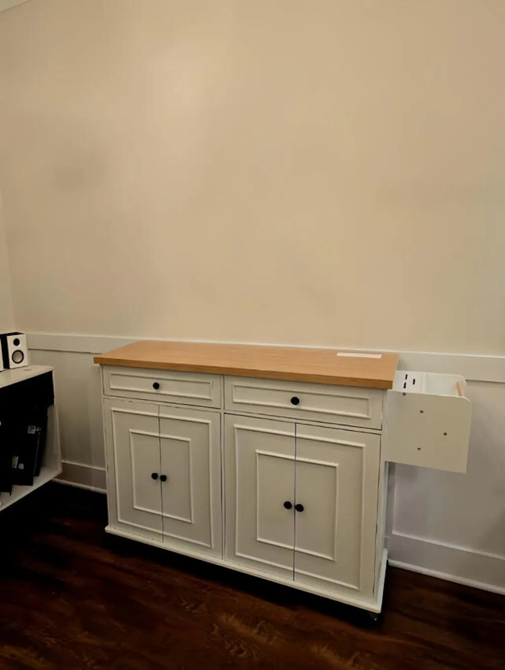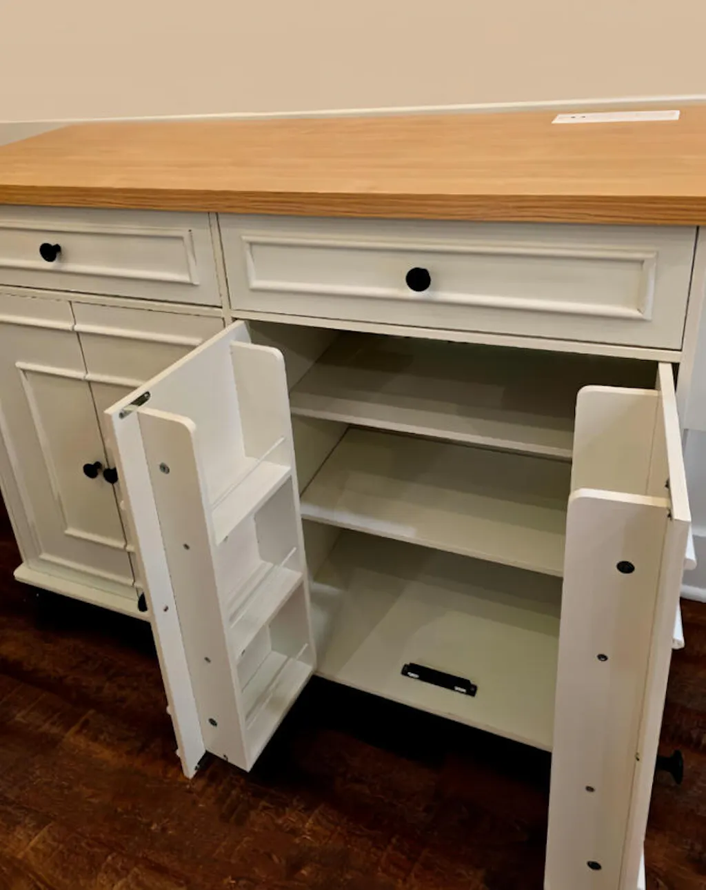 This kitchen cart is equipped with large-capacity storage cabinets and drawers. Built-in adjustable partitions can adjust the layout according to storage needs; shelves are provided on both sides of the cabinet for placing kitchen knives, seasonings, towels, etc.