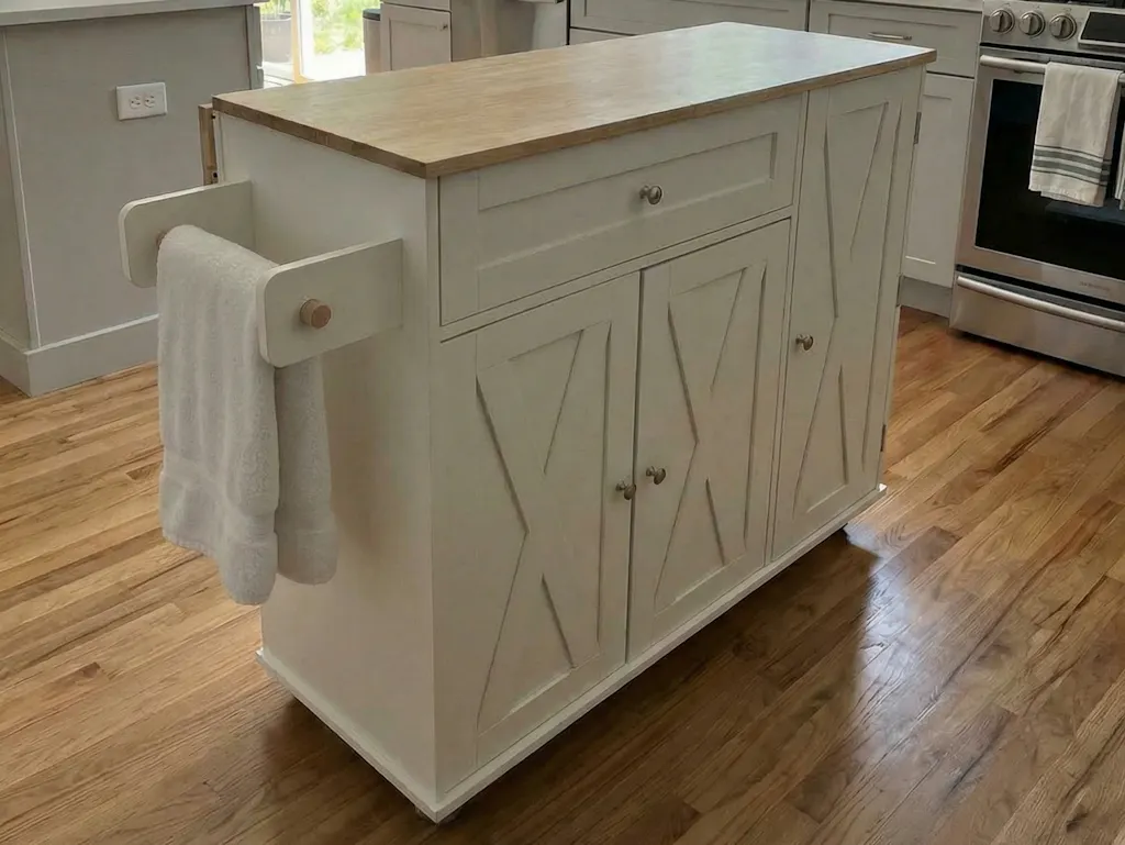 The kitchen island keeps essentials neatly organized with a spacious cabinet, drawer, 3-tier spice rack, and towel bar. Built-in compartments store tableware, ingredients, or cooking tools, keeping everything within easy reach.