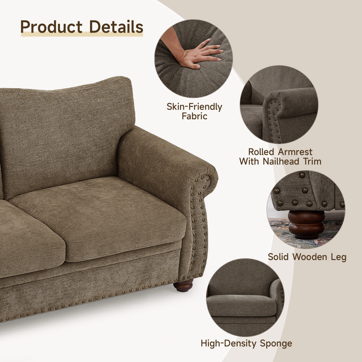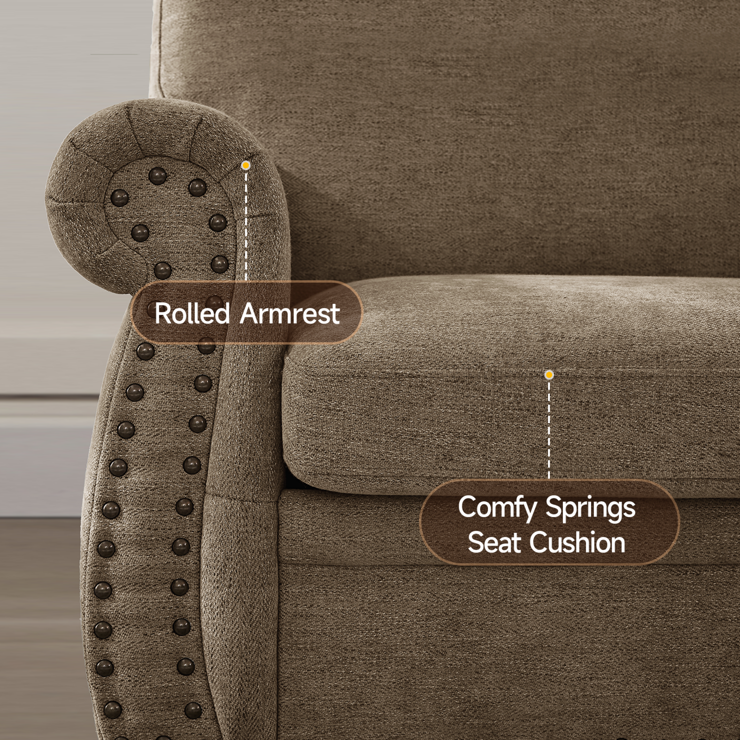 Additional Features  Removable Cushion, Nailhead, Spring Cushion, Rolled Arm