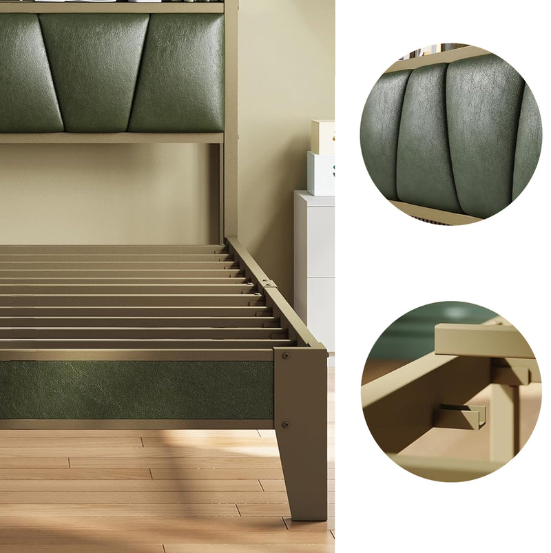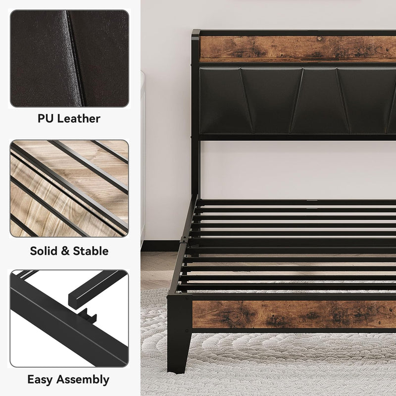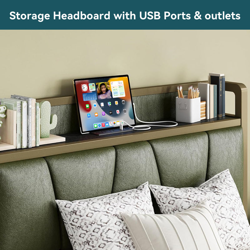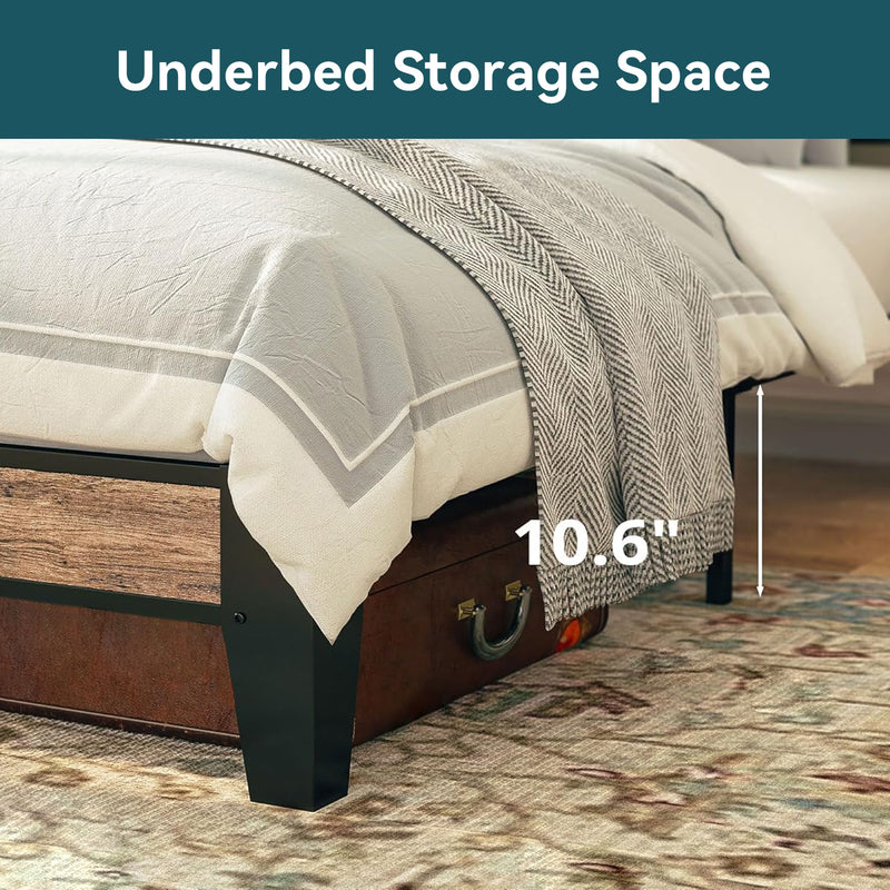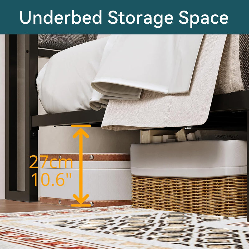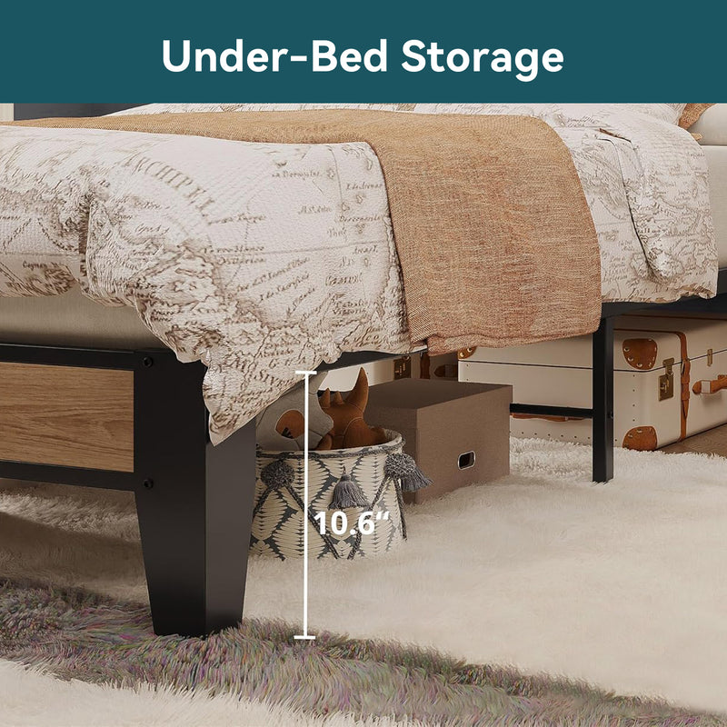 This storage headboard comes with a 4.9-foot power cord, two standard outlets, and a USB port for convenient charging of electronic devices, while keeping small items like phones, glasses, and books within easy reach. The bed frame is reinforced with heavy-duty metal slats to ensure structural stability and durability. Its design provides optimal support for all types of mattresses, eliminating the need for a spring mattress base. The bed legs feature a thick, wide angle iron design to enhance support, adding both aesthetic appeal and strength to the bedroom. Additionally, this platform bed features 10.6 inches of clearance underneath, providing extra storage space.
