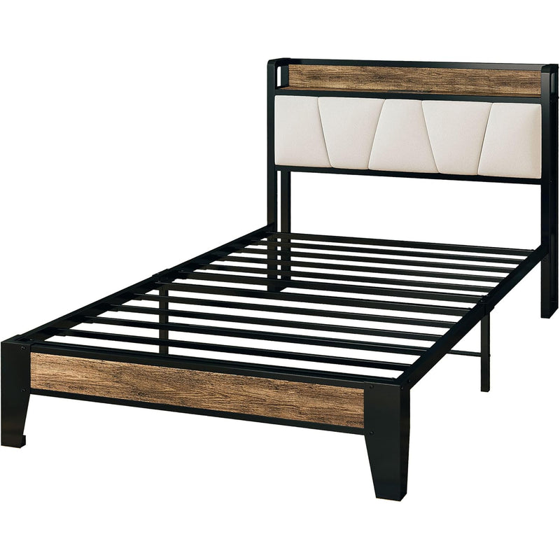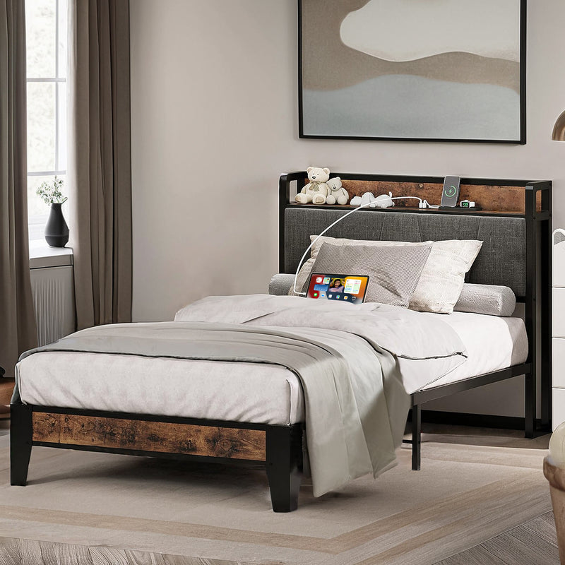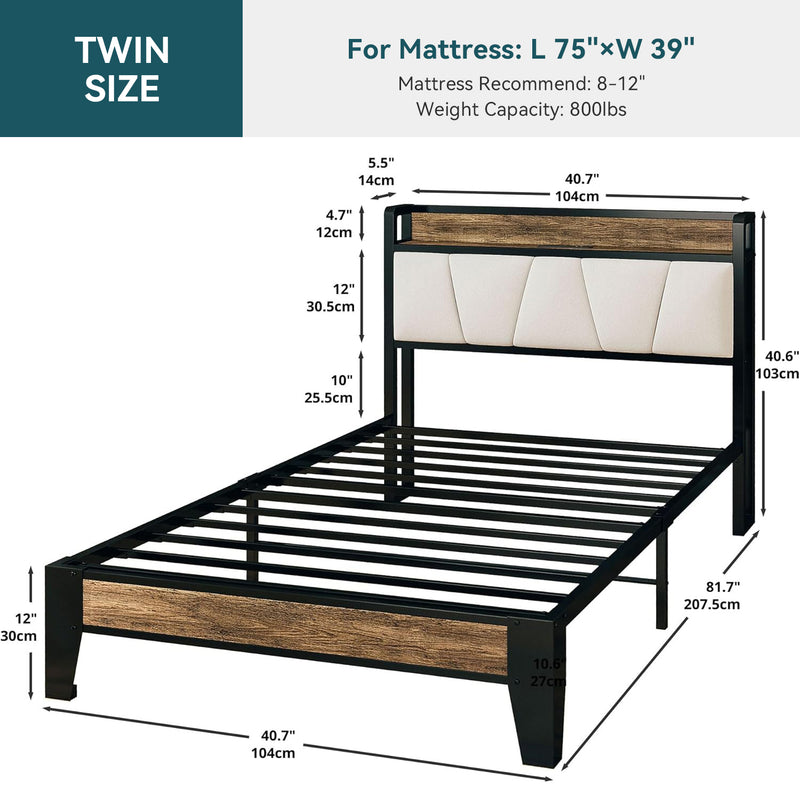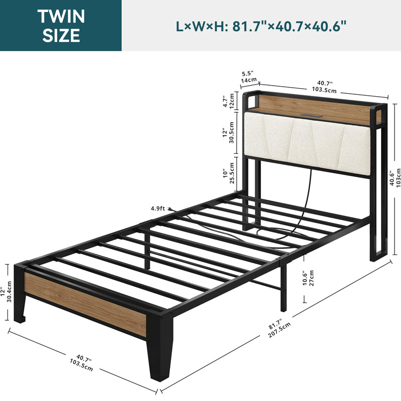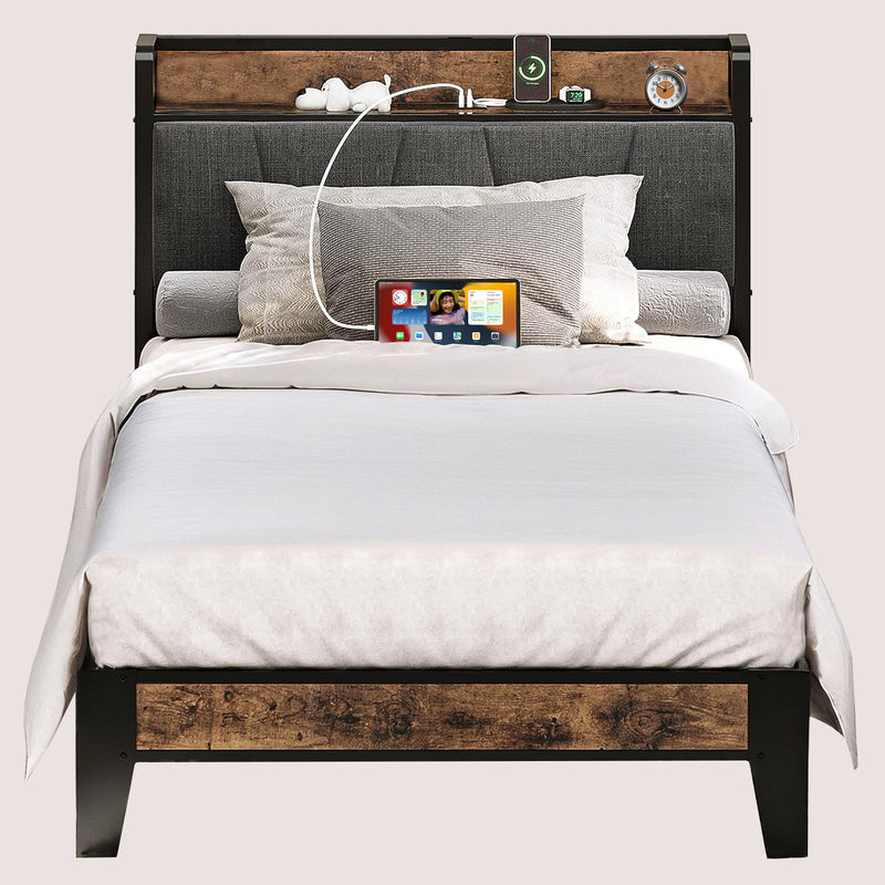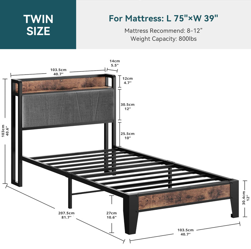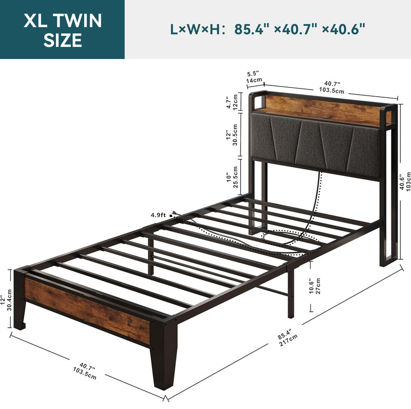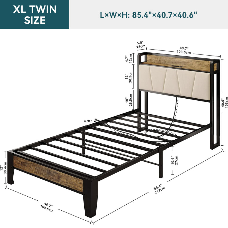 Upholstered Bed Frame, Twin/Twin XL Bed Frame with Storage Headboard Charging Station