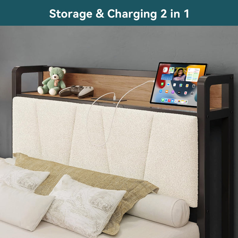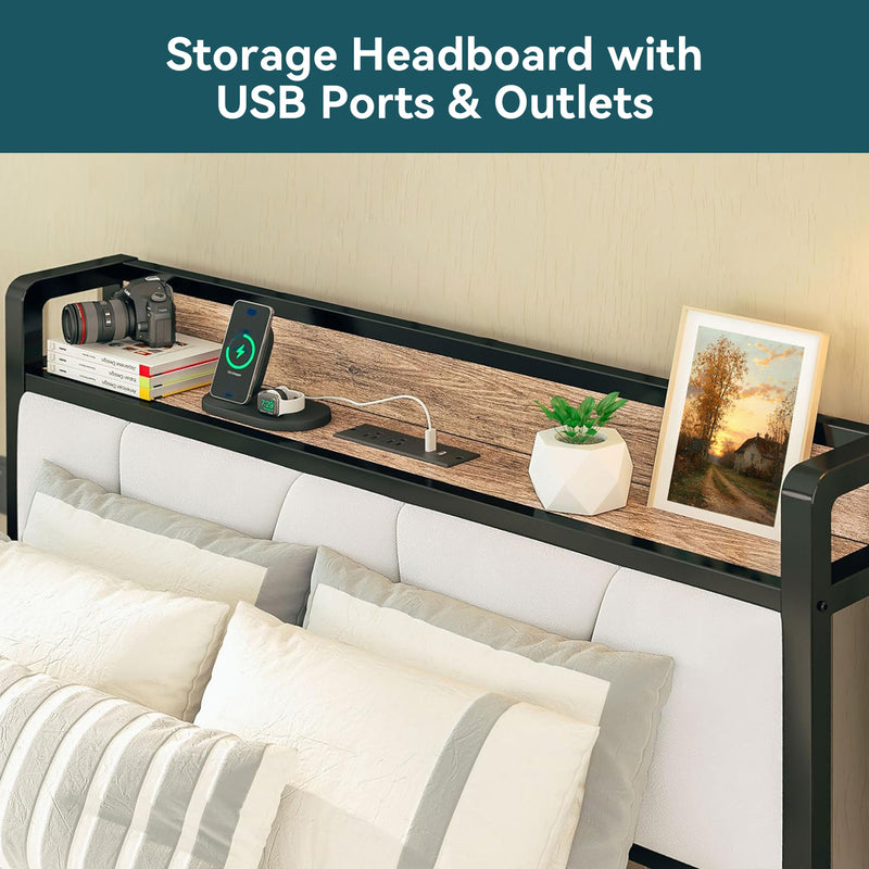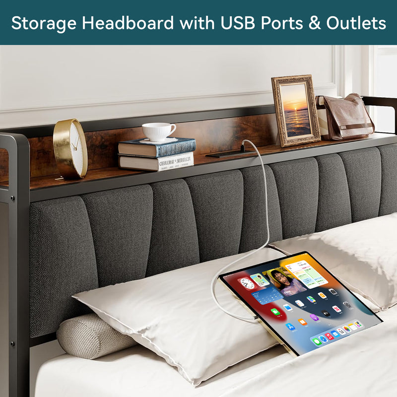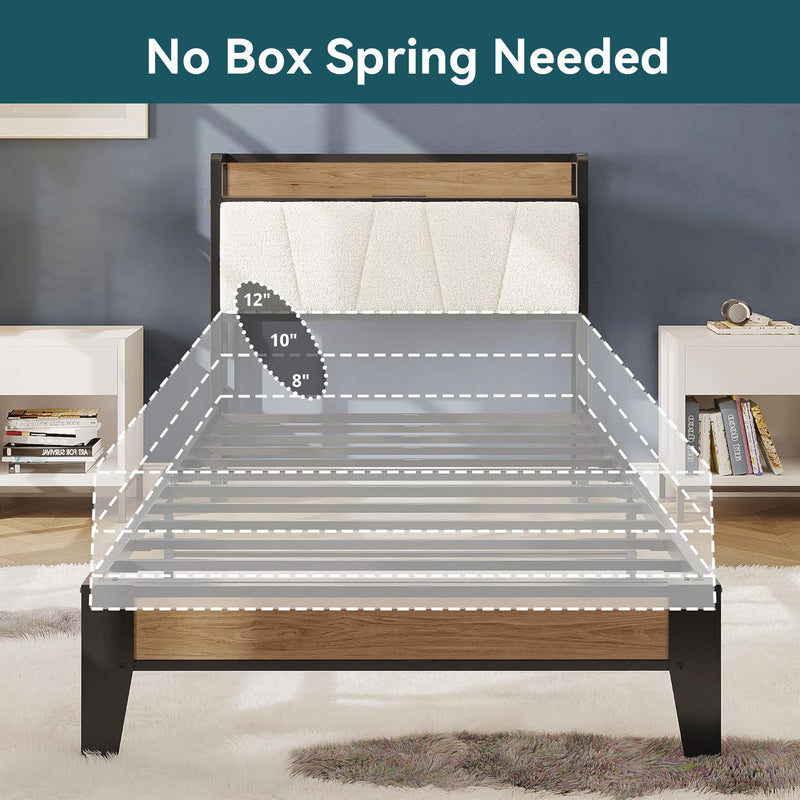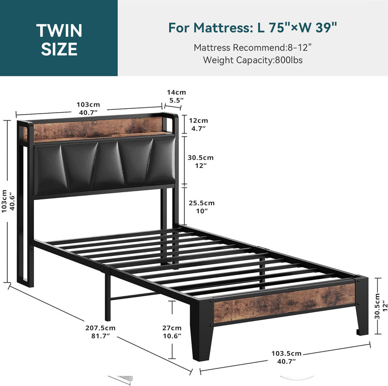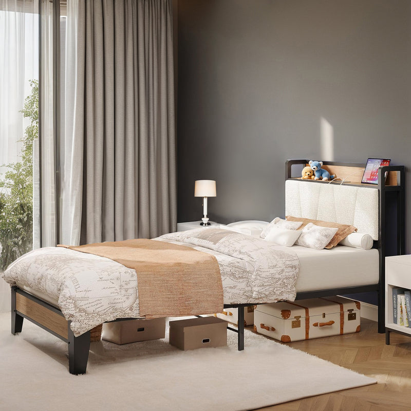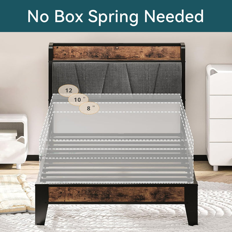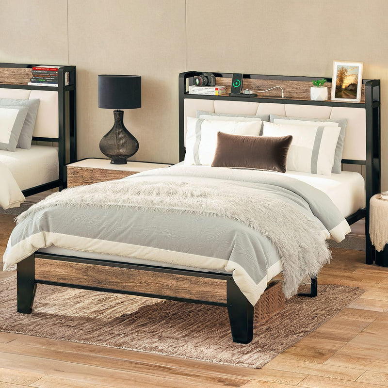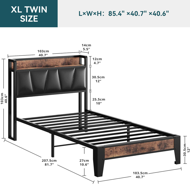 Upholstered Bed Frame, Twin/Twin XL Bed Frame with Storage Headboard Charging Station