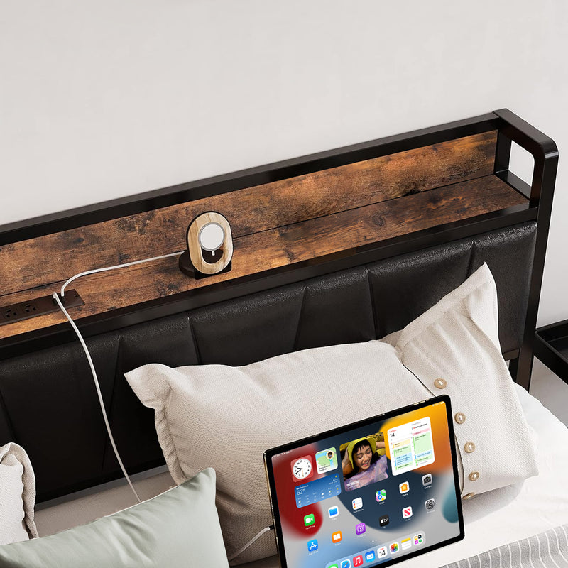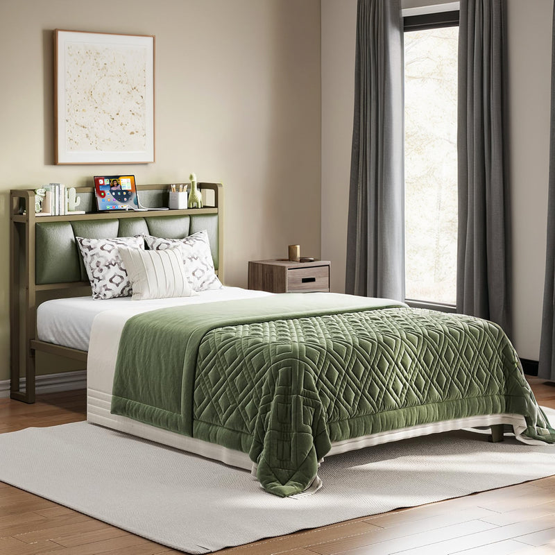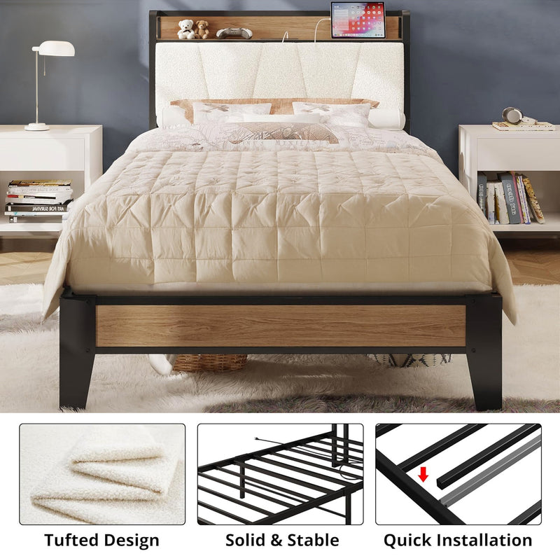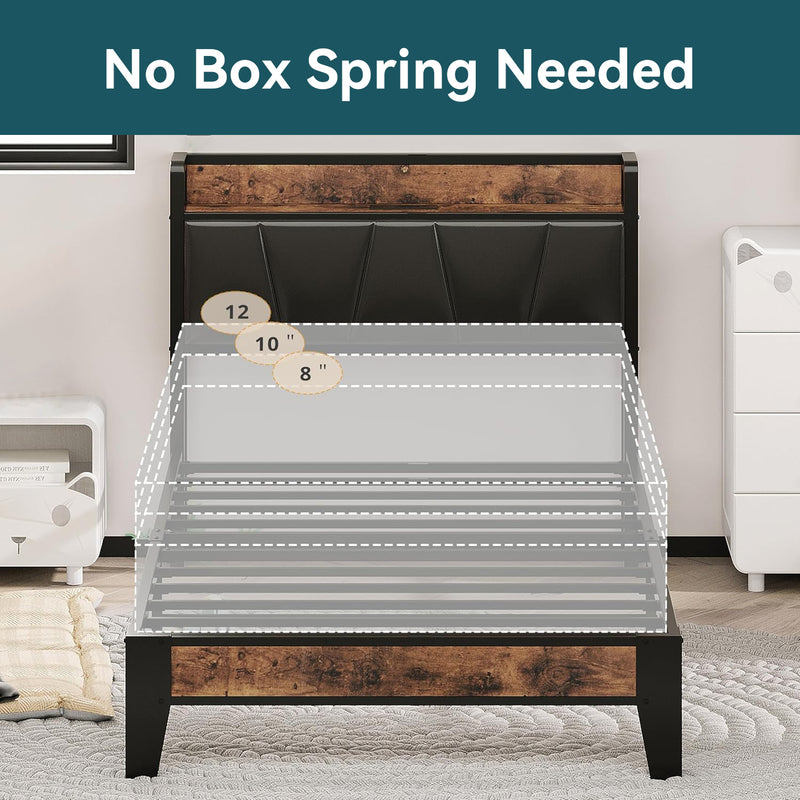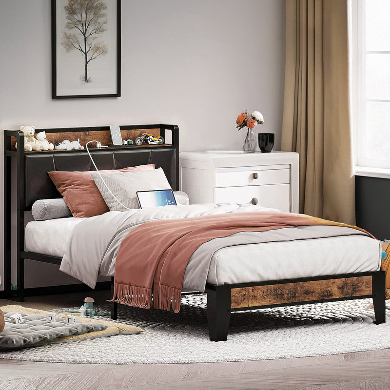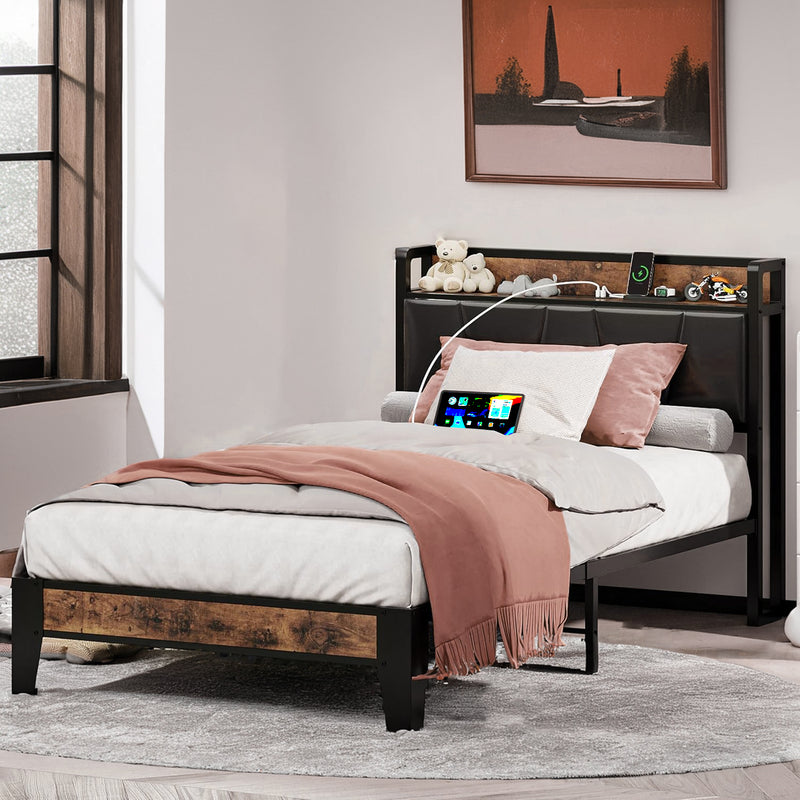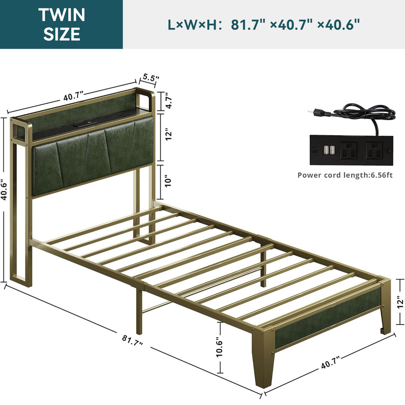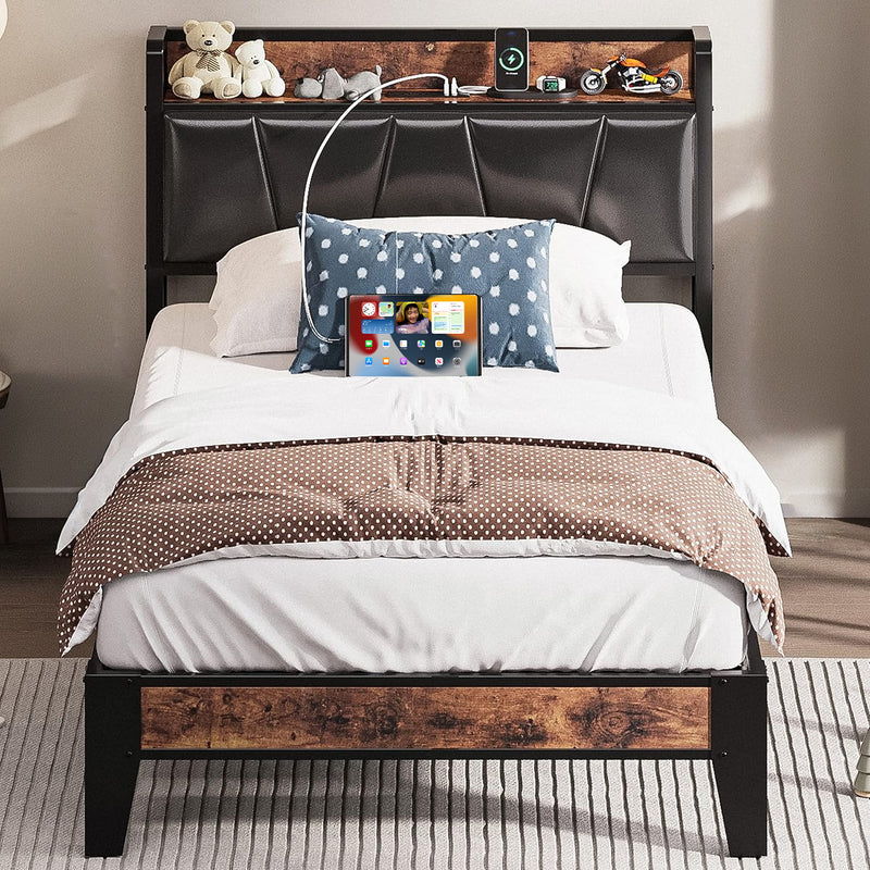 Upholstered Bed Frame, Twin/Twin XL Bed Frame with Storage Headboard Charging Station