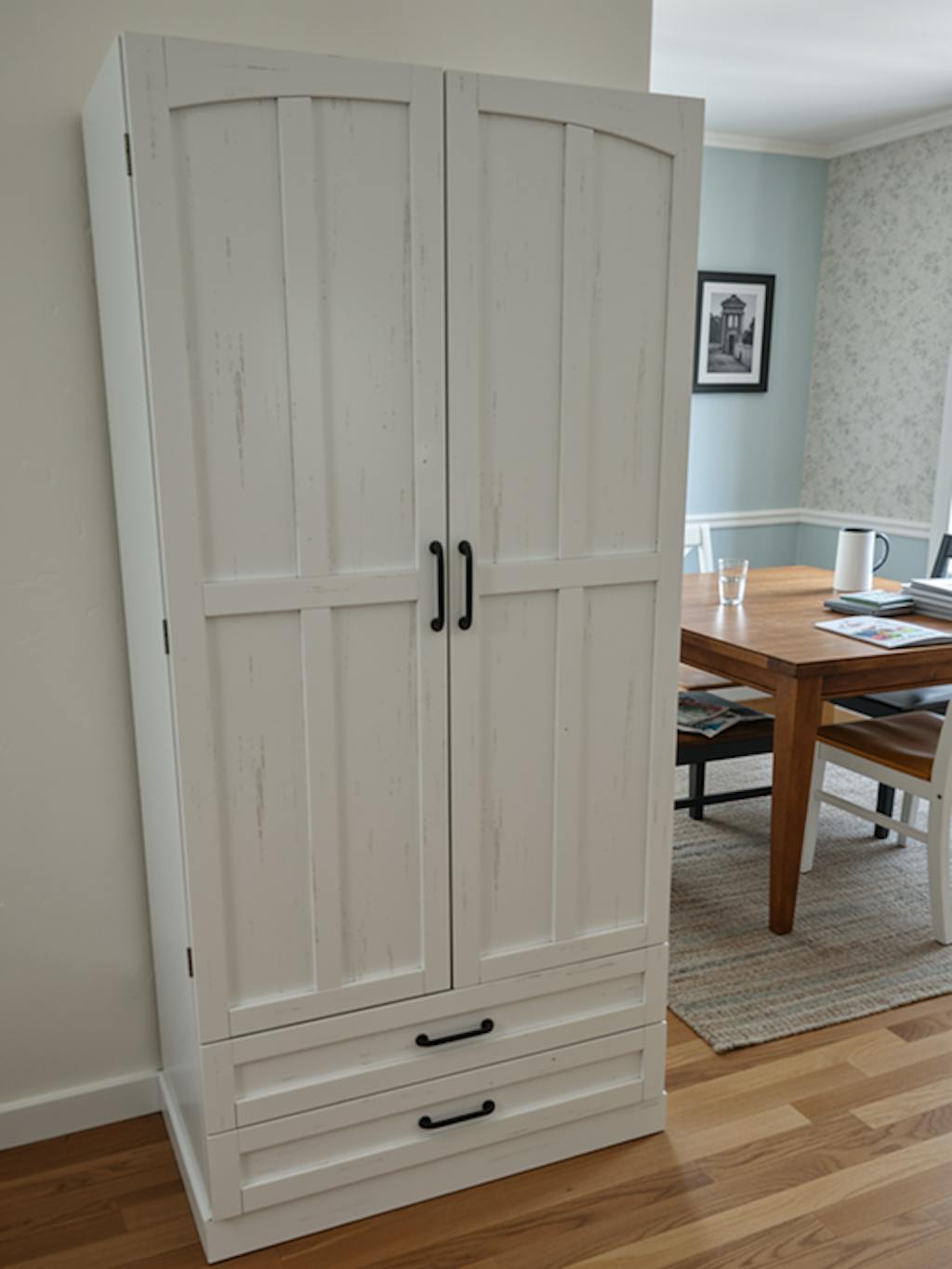 The upper shelves of this pantry organizer are height-adjustable. This feature is very convenient when storing food or bottles that need to be at a height. This farmhouse pantry storage cabinet is made of high-quality engineered wood and a sturdy base. The surface of this pantry storage cabinet is watertight and easy to maintain.