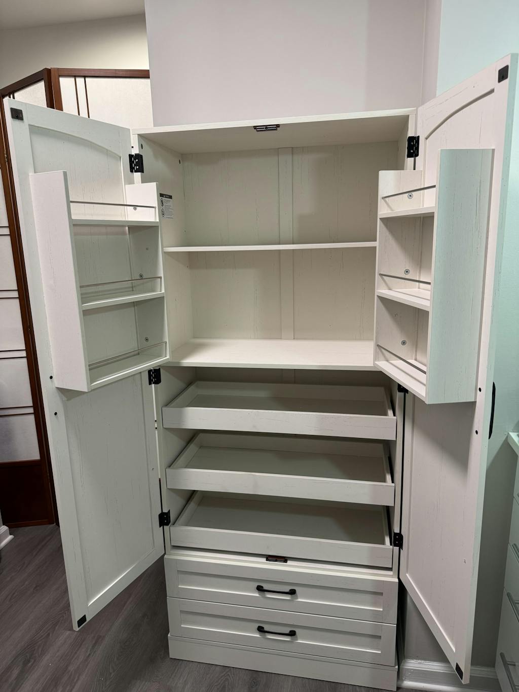 This pantry storage cabinet has a large capacity. It features three pull-out shelves and two larger drawers. The smooth-glide drawers store small condiments and provide easy access to cutlery, forks, spoons, and other utensils. The upper sections of the cabinet's two doors are designed to resemble refrigerator doors, making it suitable for storing snacks, condiments, and other items.