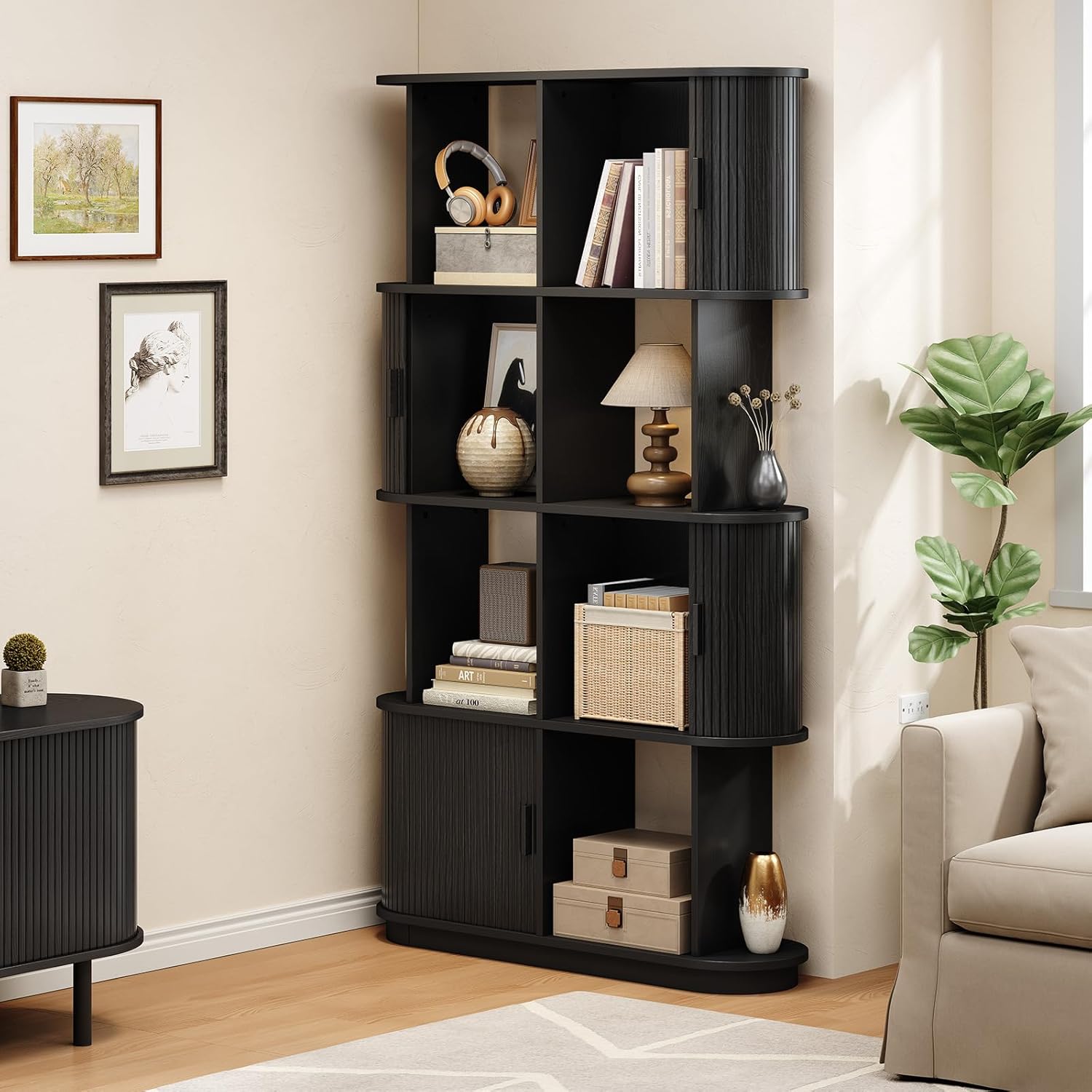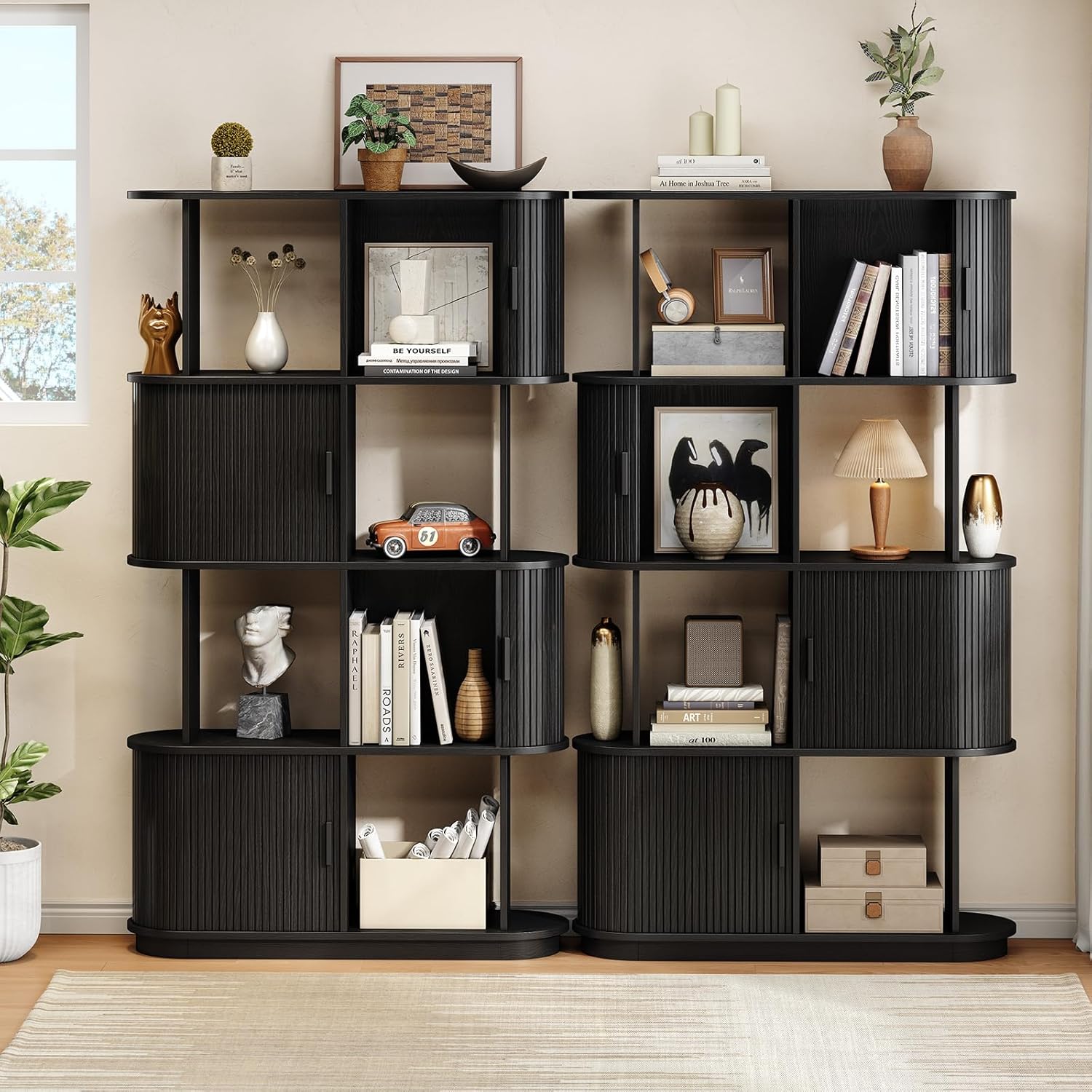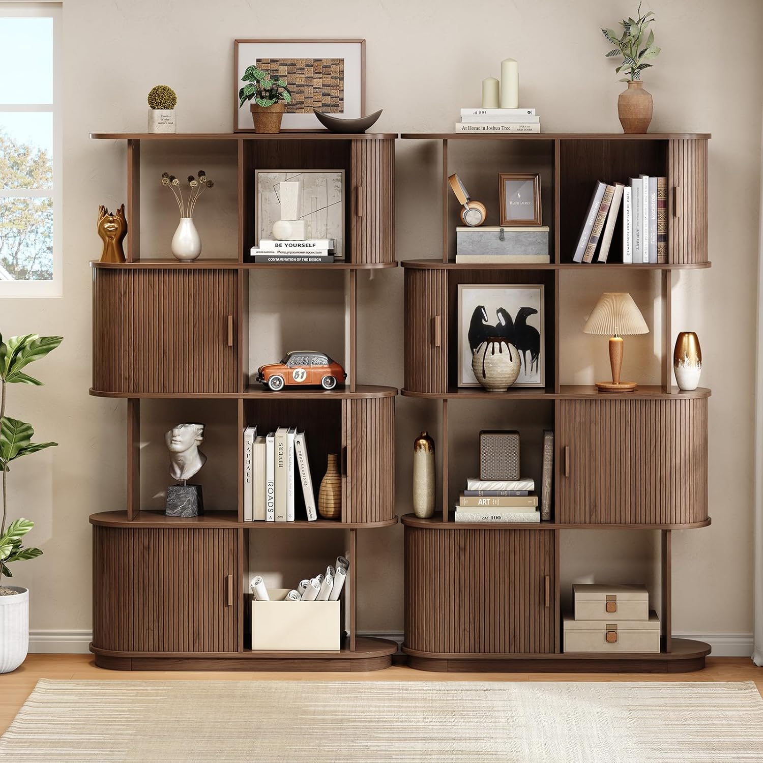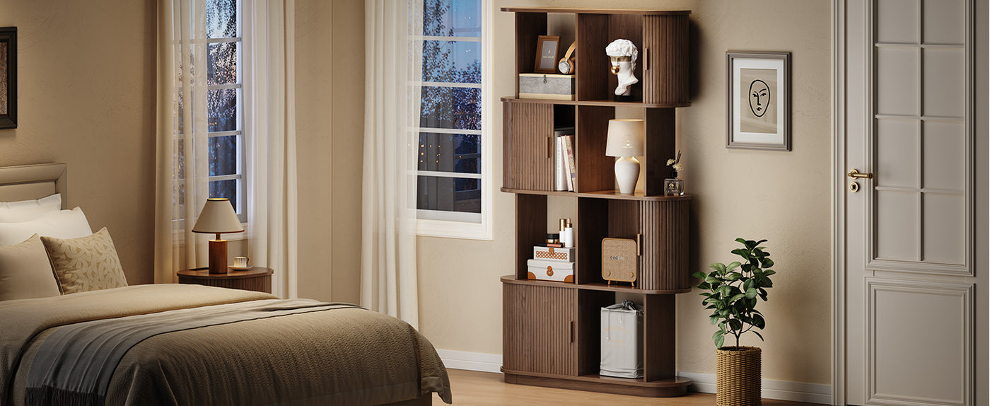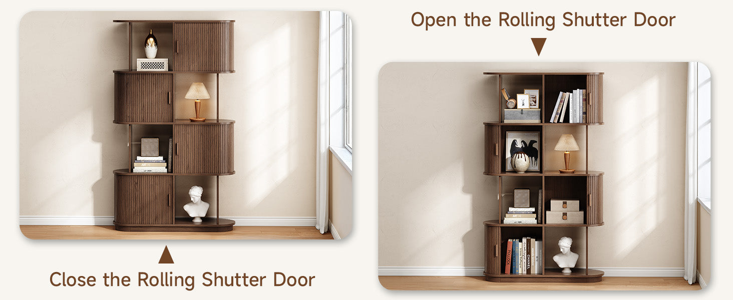 This bookcase stands out with its retro charm. The staggered roller shutter doors not only add a unique aesthetic to your home, but also provide flexible storage space—they can hide clutter or display your favorite decorations.