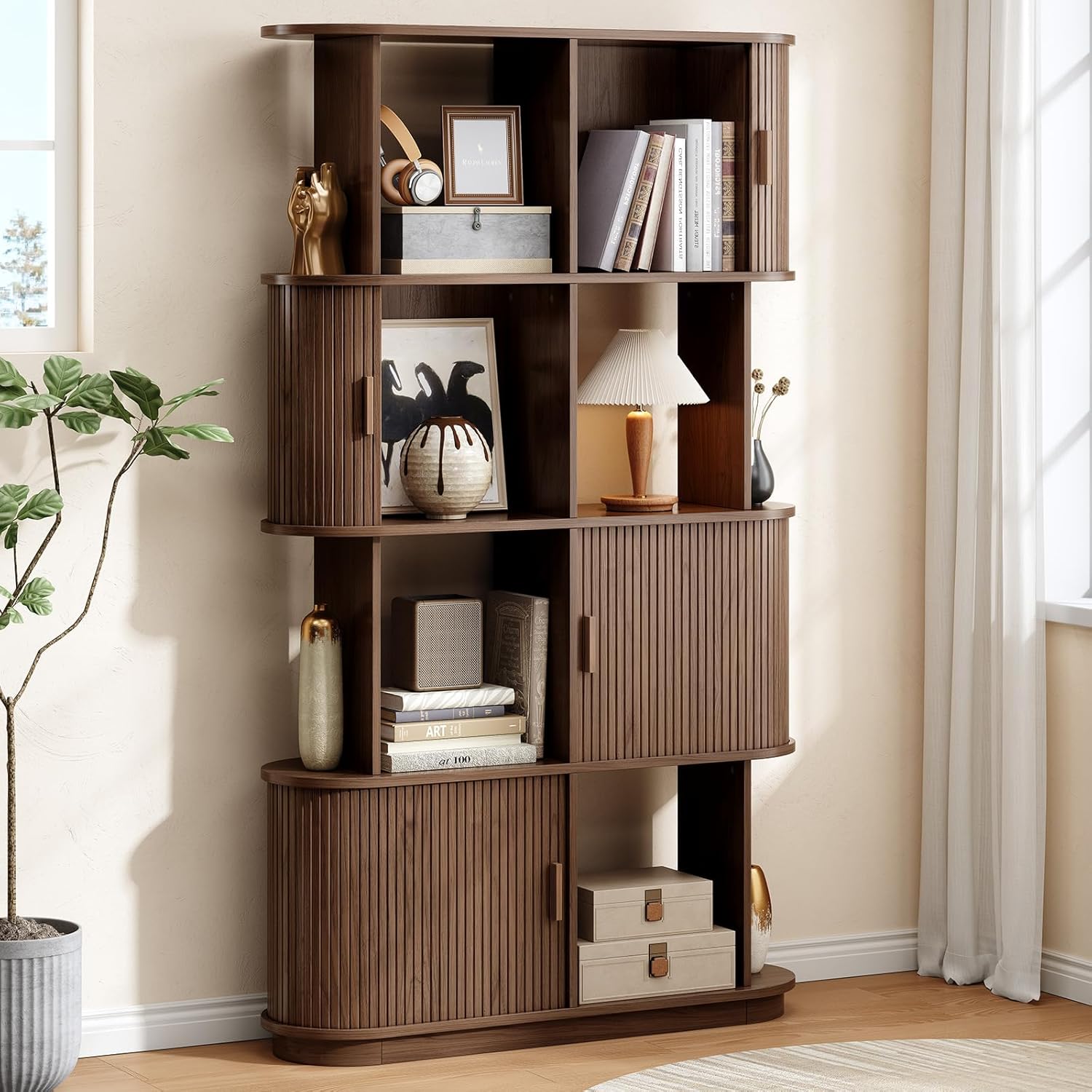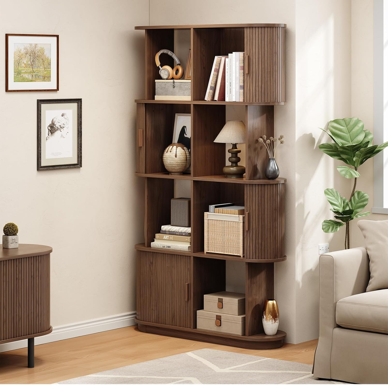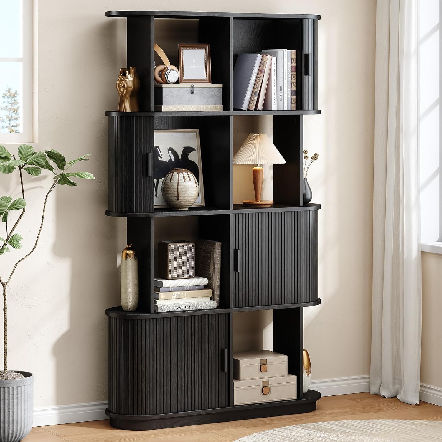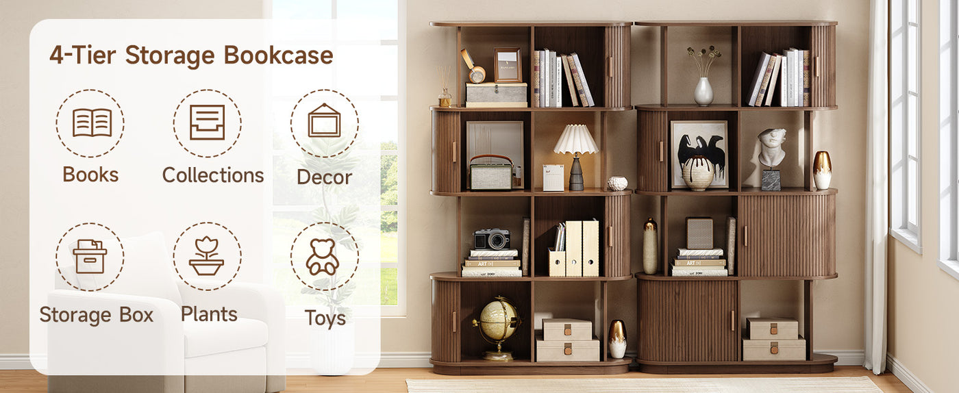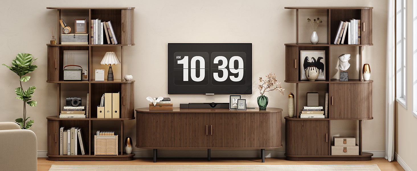 This bookcase stands out with its retro charm. The staggered roller shutter doors not only add a unique aesthetic to your home, but also provide flexible storage space—they can hide clutter or display your favorite decorations.