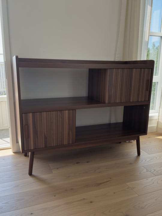The storage cabinet has two open shelves and two enclosed compartments with sliding doors. The open shelves are convenient for storing or displaying items that you use often, while the enclosed sections provide space to hide clutter. Inside each enclosed compartment, there is an adjustable shelf with three height settings, allowing you to accommodate various item sizes.