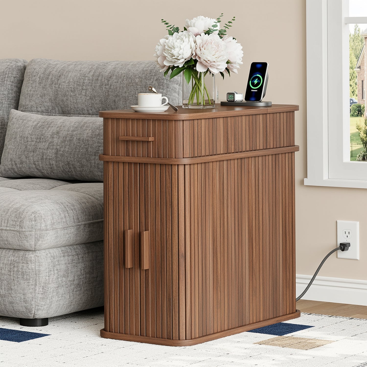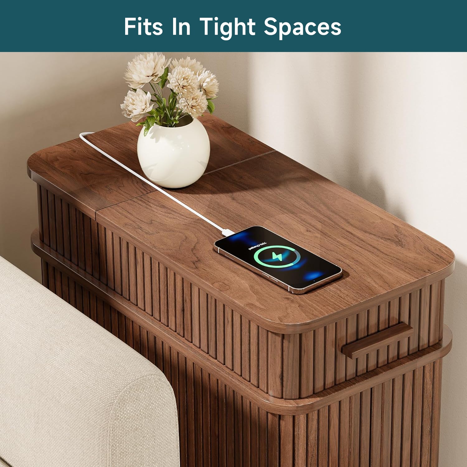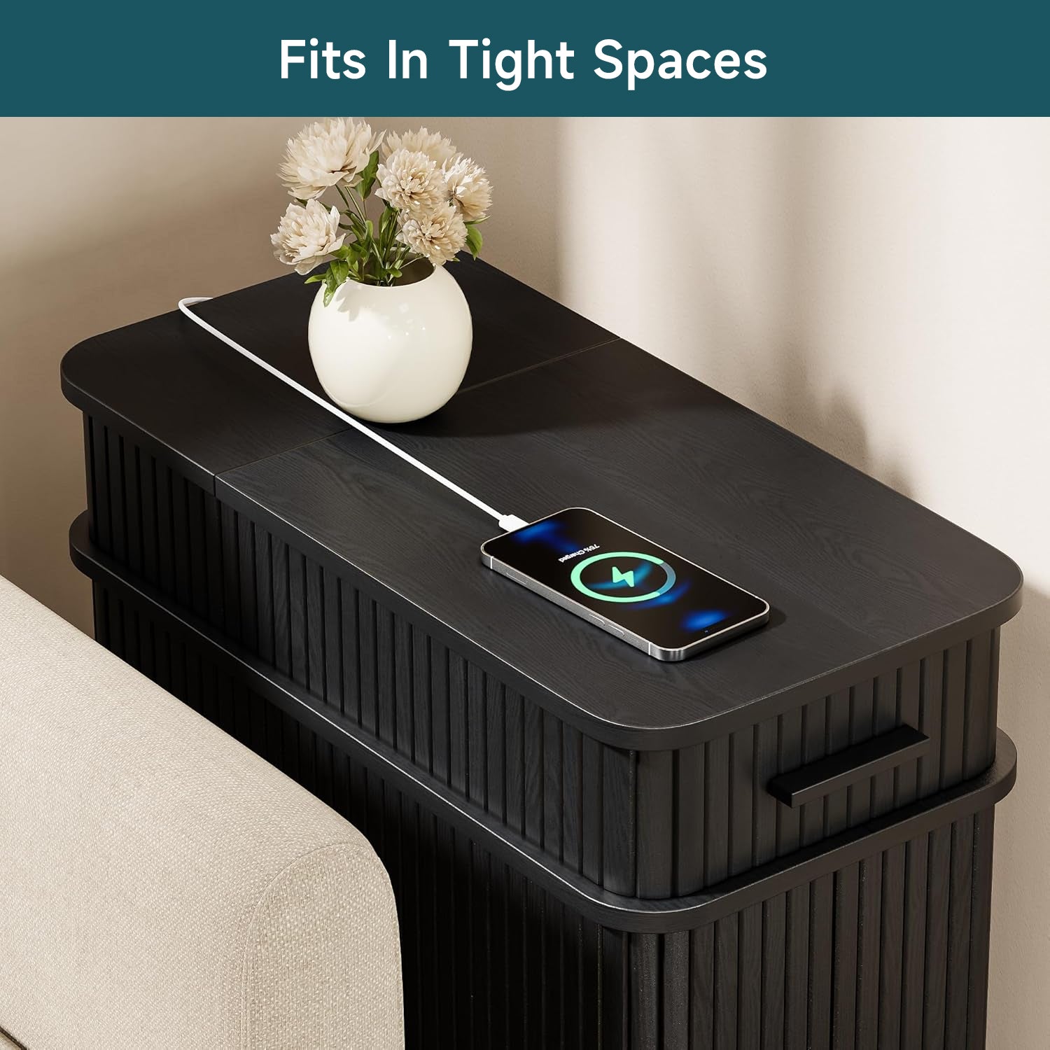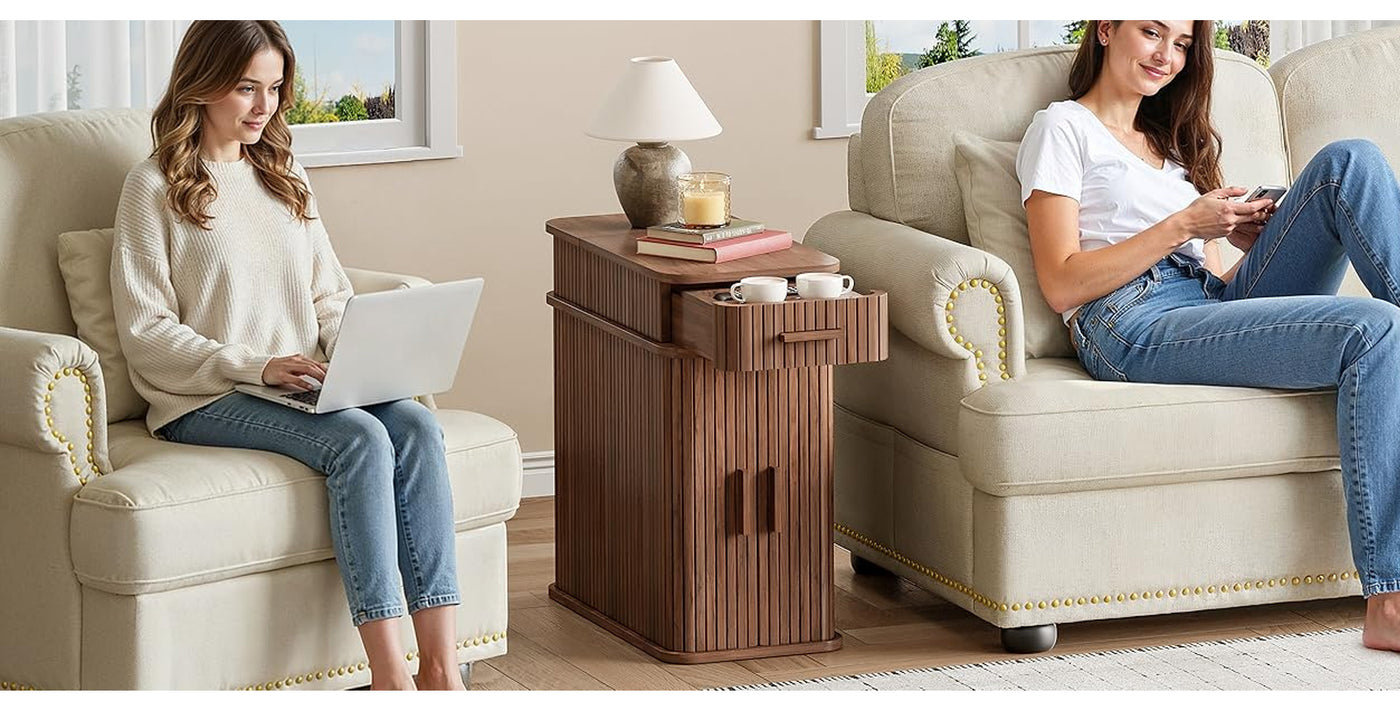 With compact dimensions of 23.62"D × 11.81"W × 23.62"H, this narrow table fits naturally beside a bed, sofa, or reading chair. It works just as well as a bedside table, a side table, or a small coffee corner, keeping power, storage, and daily essentials together without taking over the room.