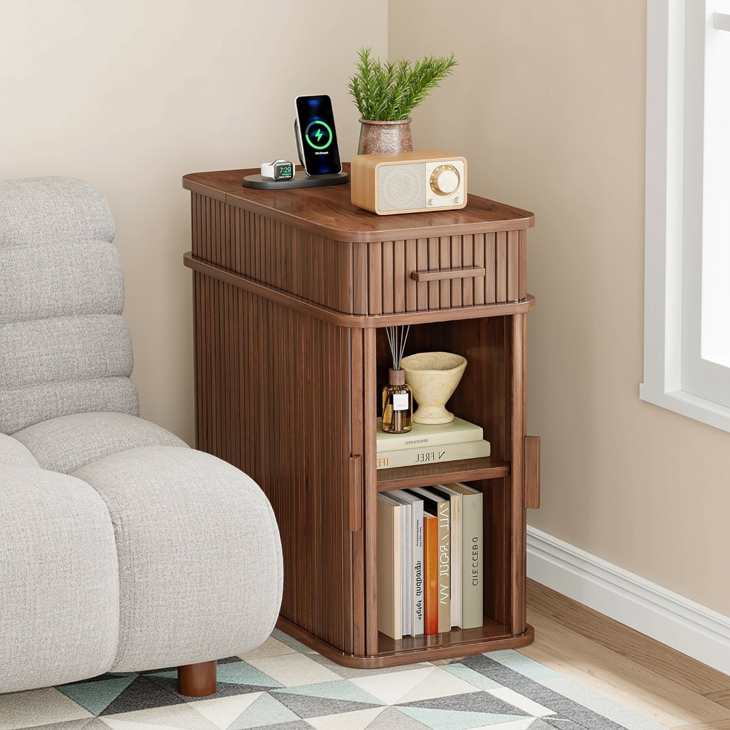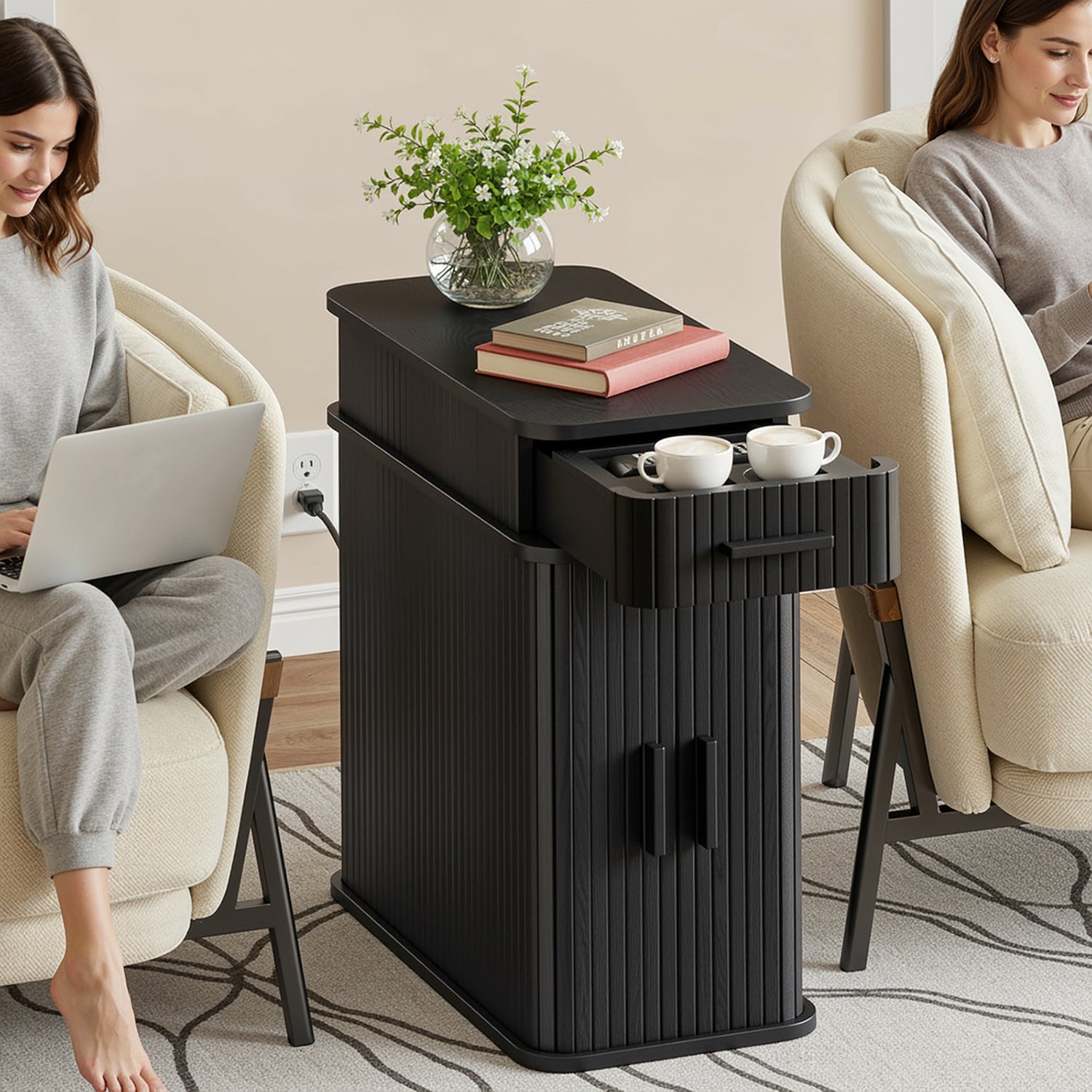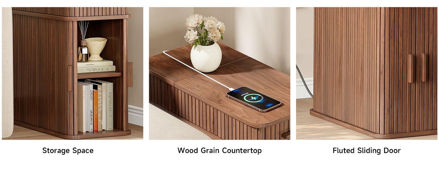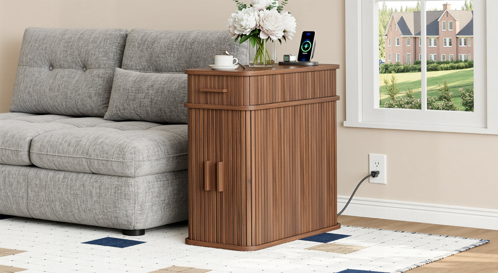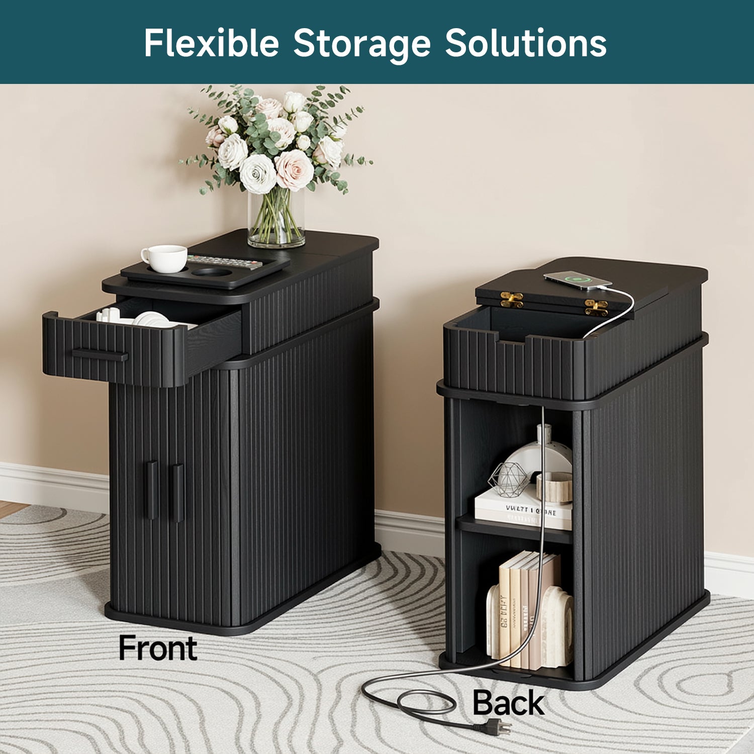 With compact dimensions of 23.62"D × 11.81"W × 23.62"H, this narrow table fits naturally beside a bed, sofa, or reading chair. It works just as well as a bedside table, a side table, or a small coffee corner, keeping power, storage, and daily essentials together without taking over the room.