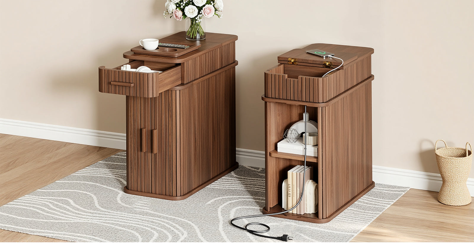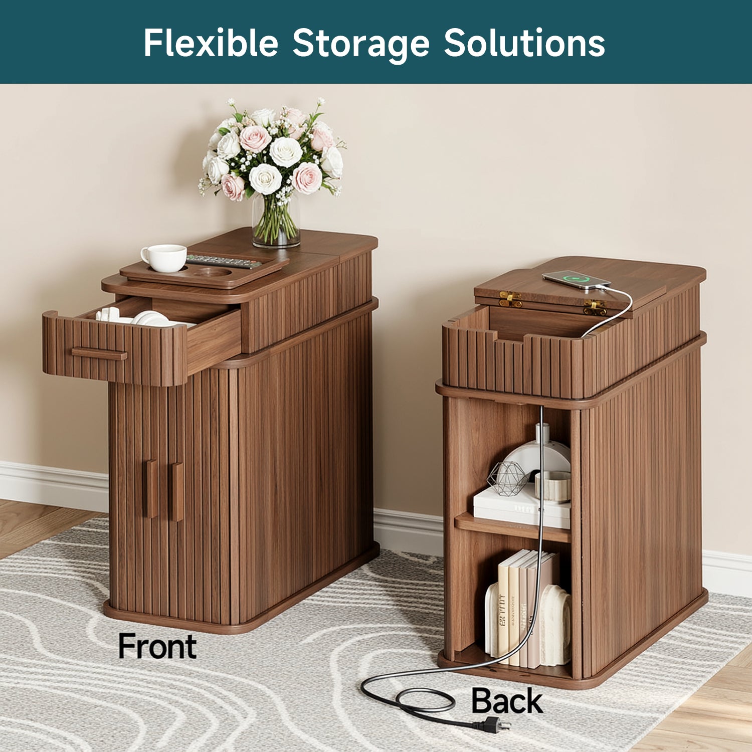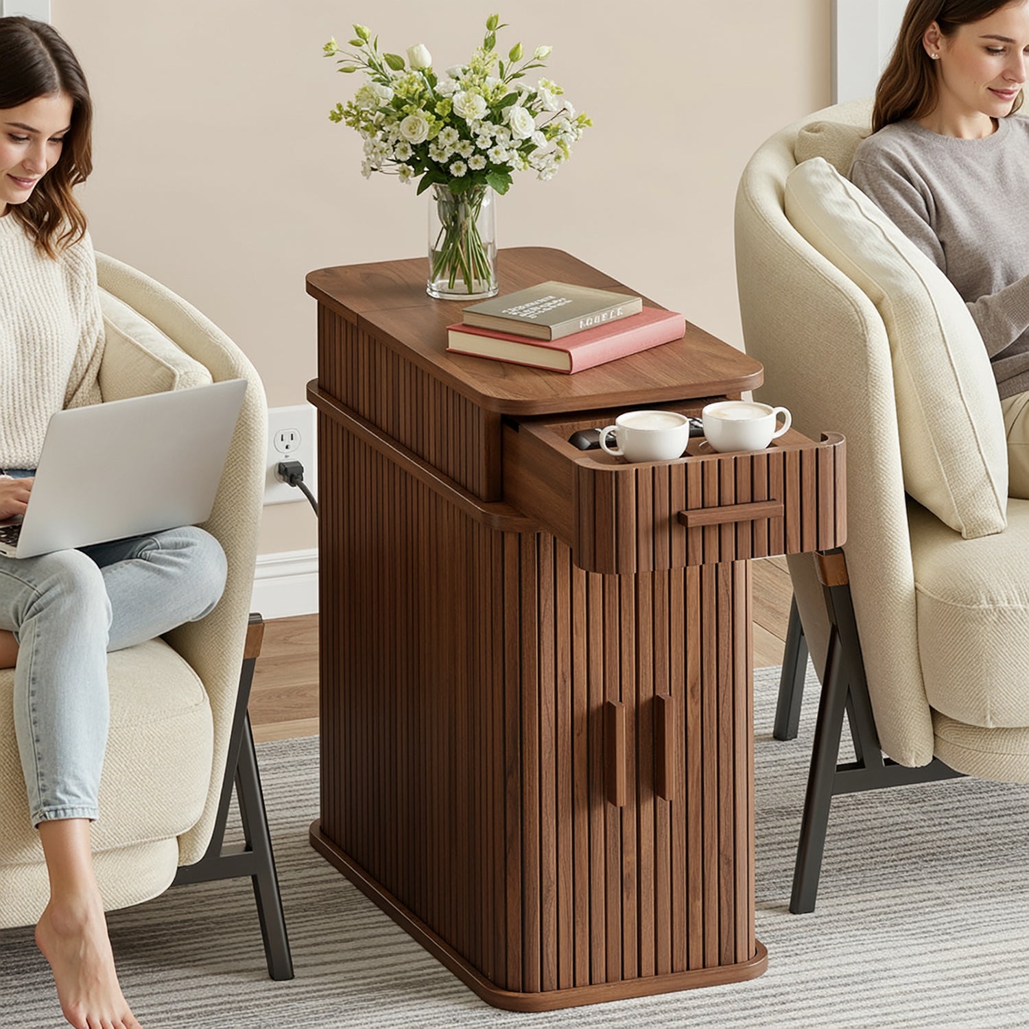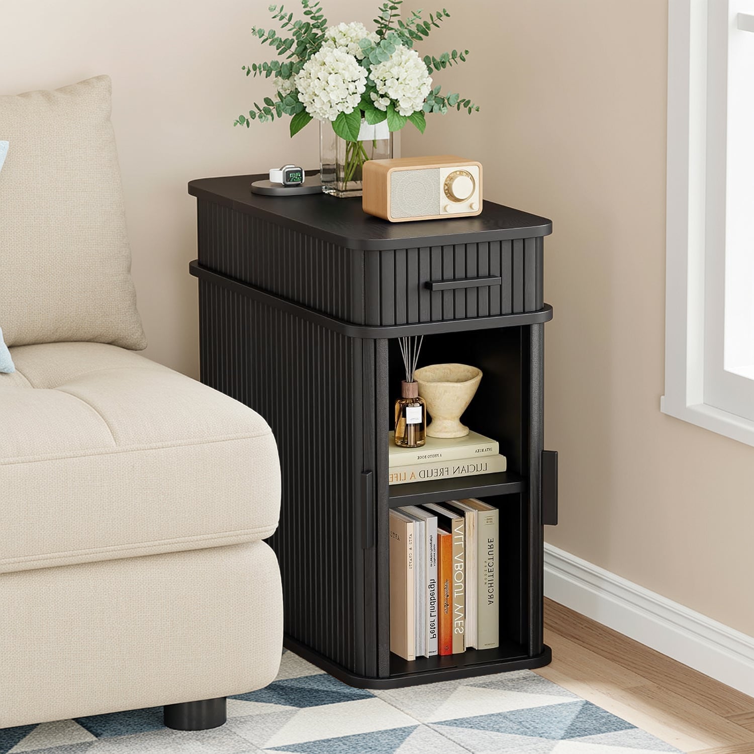 With compact dimensions of 23.62"D × 11.81"W × 23.62"H, this narrow table fits naturally beside a bed, sofa, or reading chair. It works just as well as a bedside table, a side table, or a small coffee corner, keeping power, storage, and daily essentials together without taking over the room.