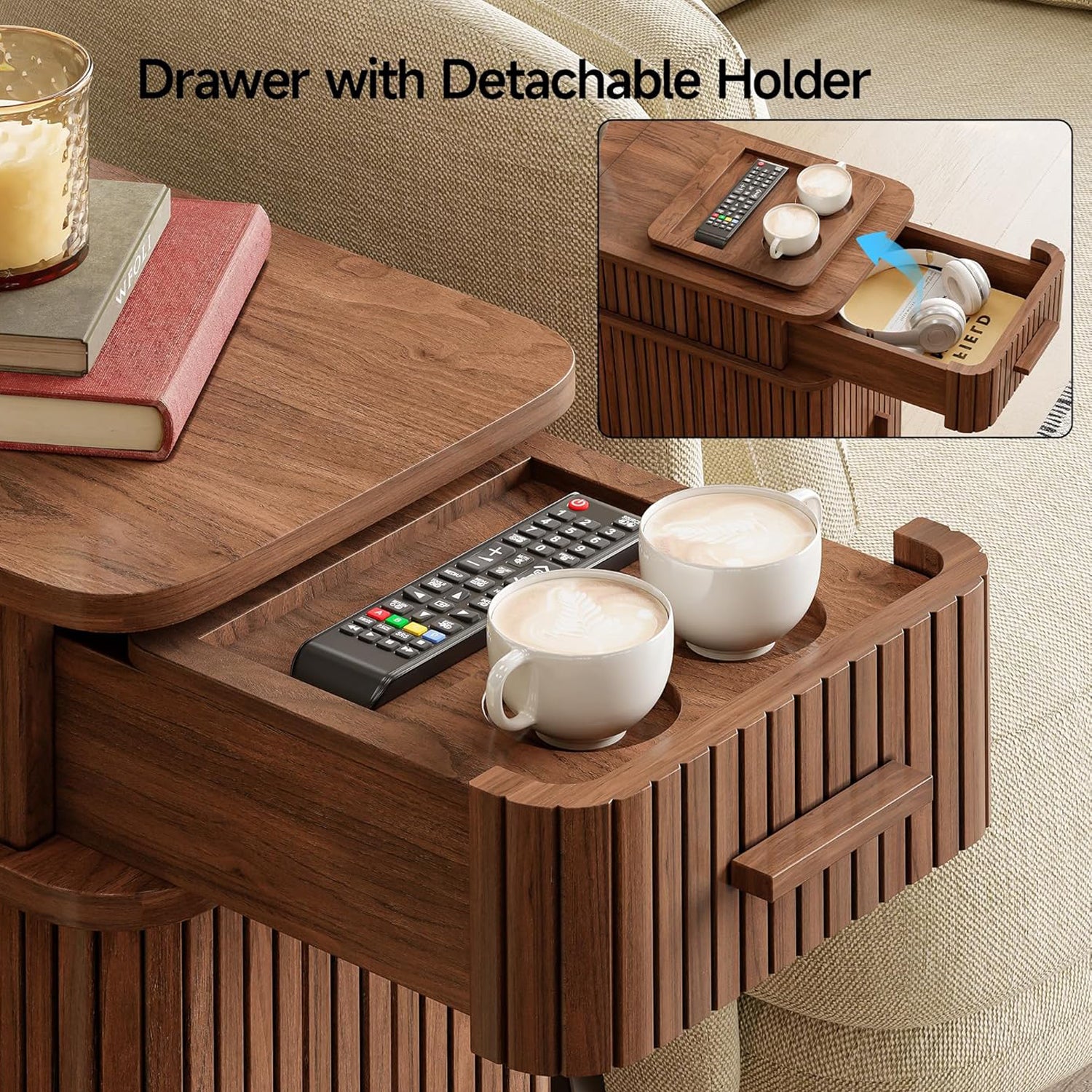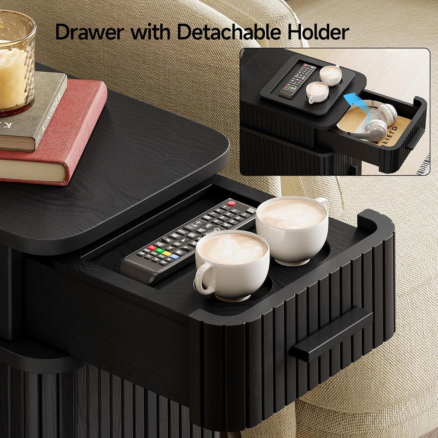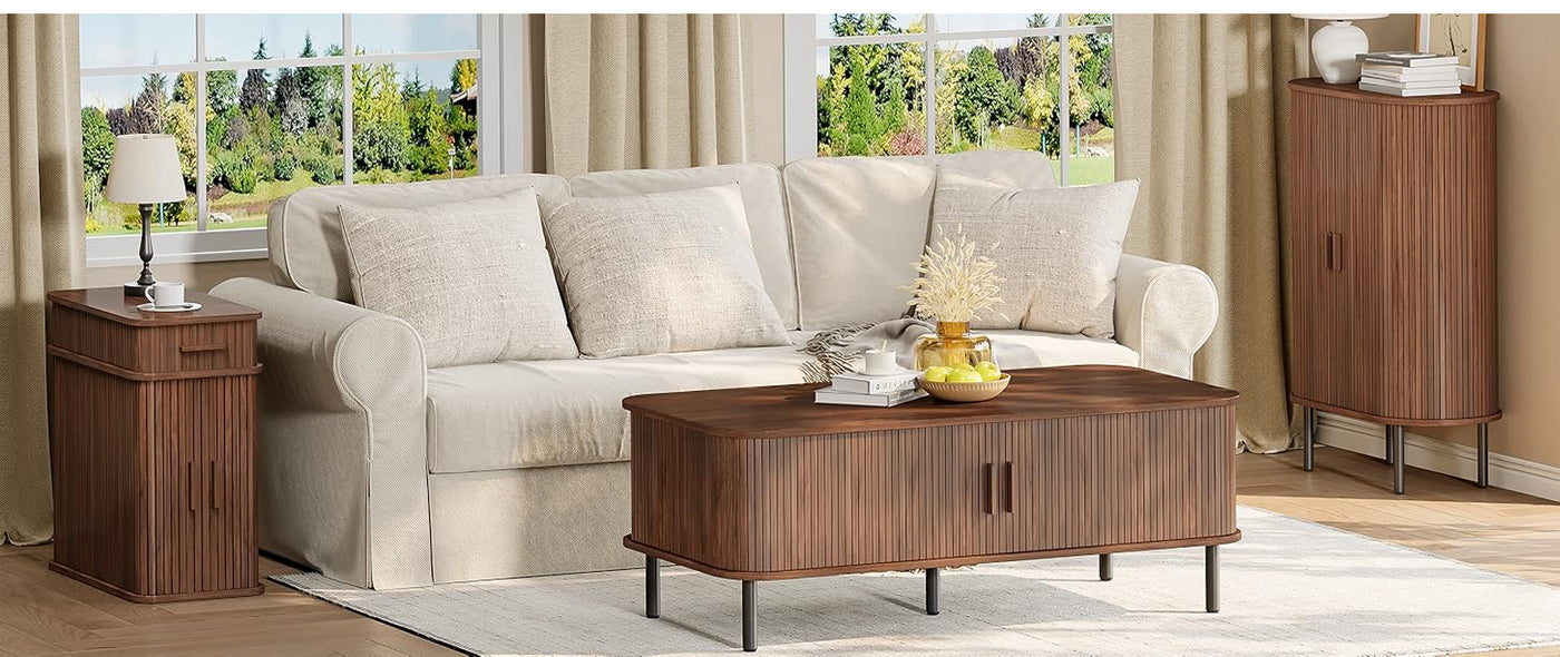 The front drawer features a removable tray, allowing small items such as glasses, remotes, or earbuds to be stored. Below, the sliding doors open to a main storage compartment that’s easily accessible from where you’re seated or lying down. Because the doors slide rather than swing outward, the table remains practical even in narrow spaces.