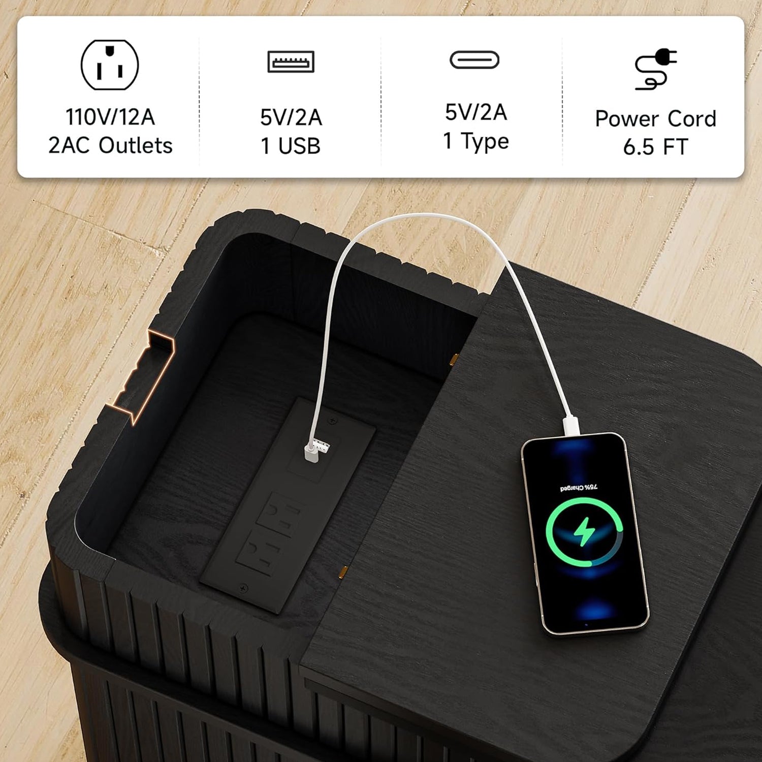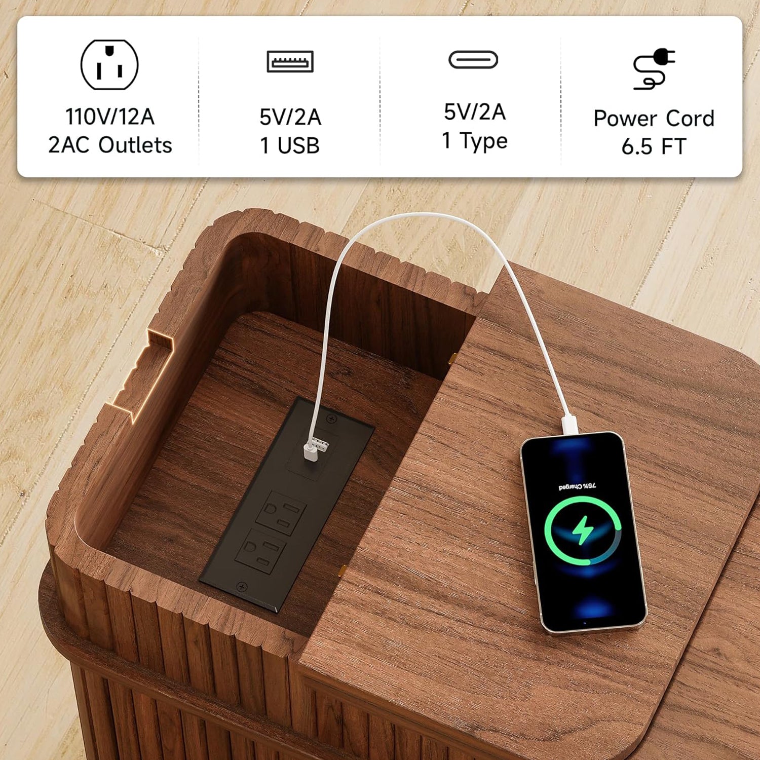 Lift the tabletop and you’ll find more than just storage. The charging station is built right inside, with 2 AC outlets, 1 USB port, and 1 Type-C port. You can plug devices in, place them inside the compartment, and keep everything hidden when the lid is closed. A rear cable hole lets cords run neatly out of sight.