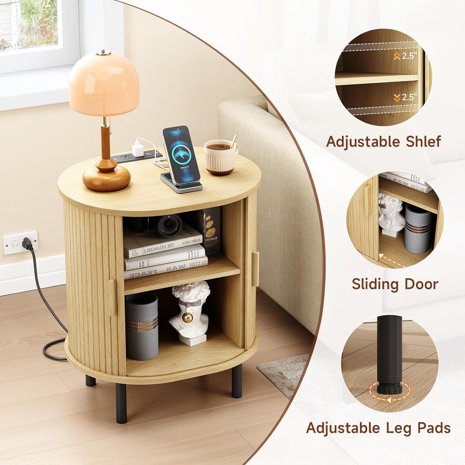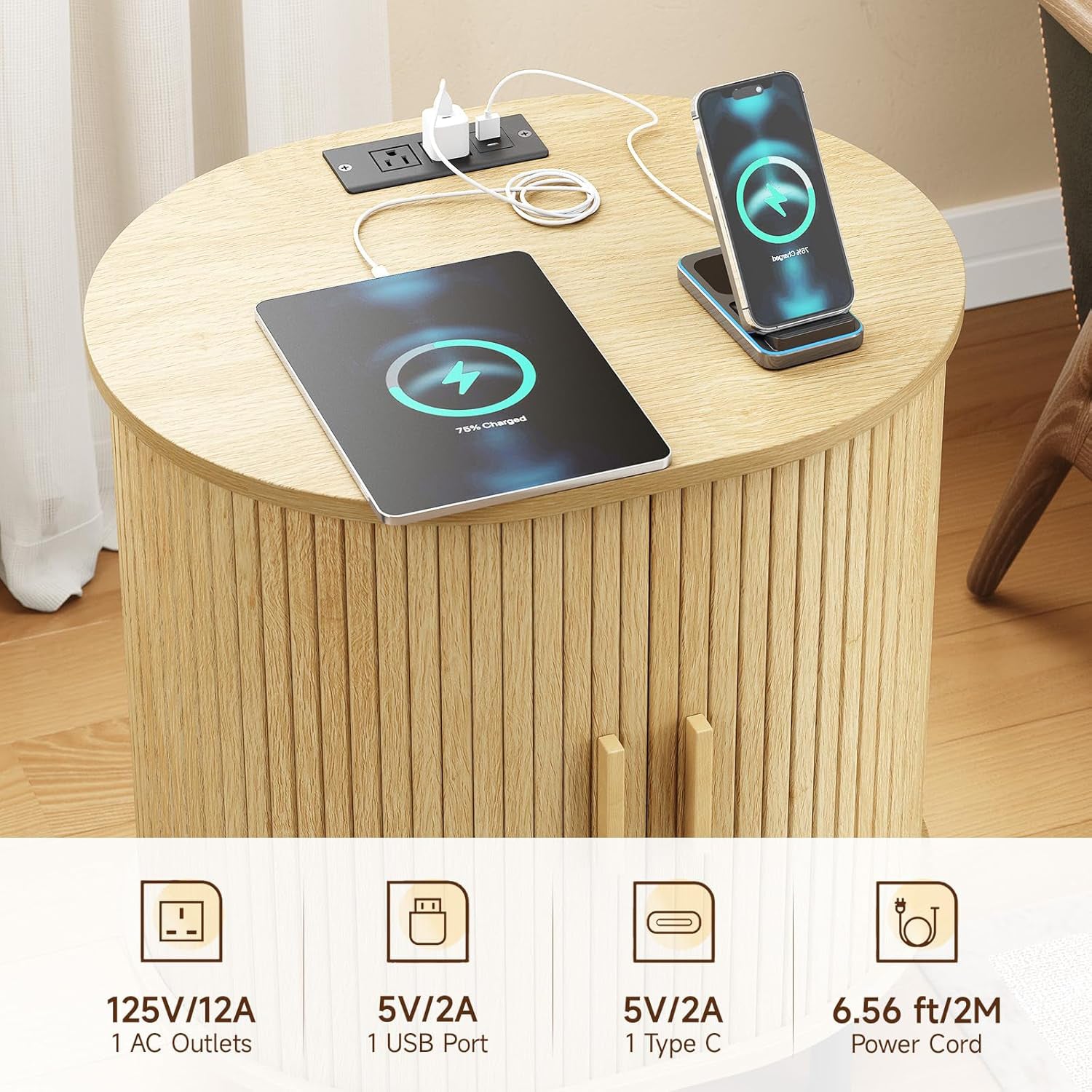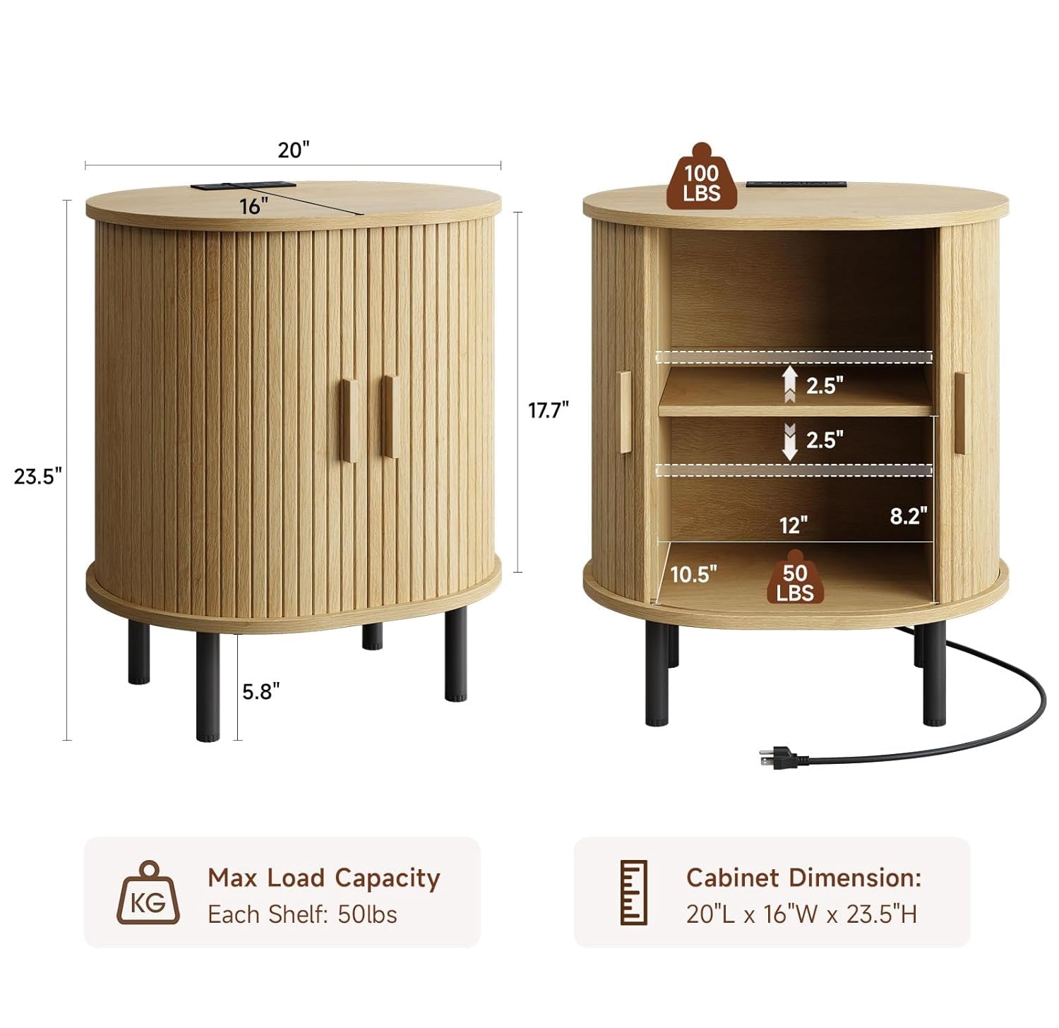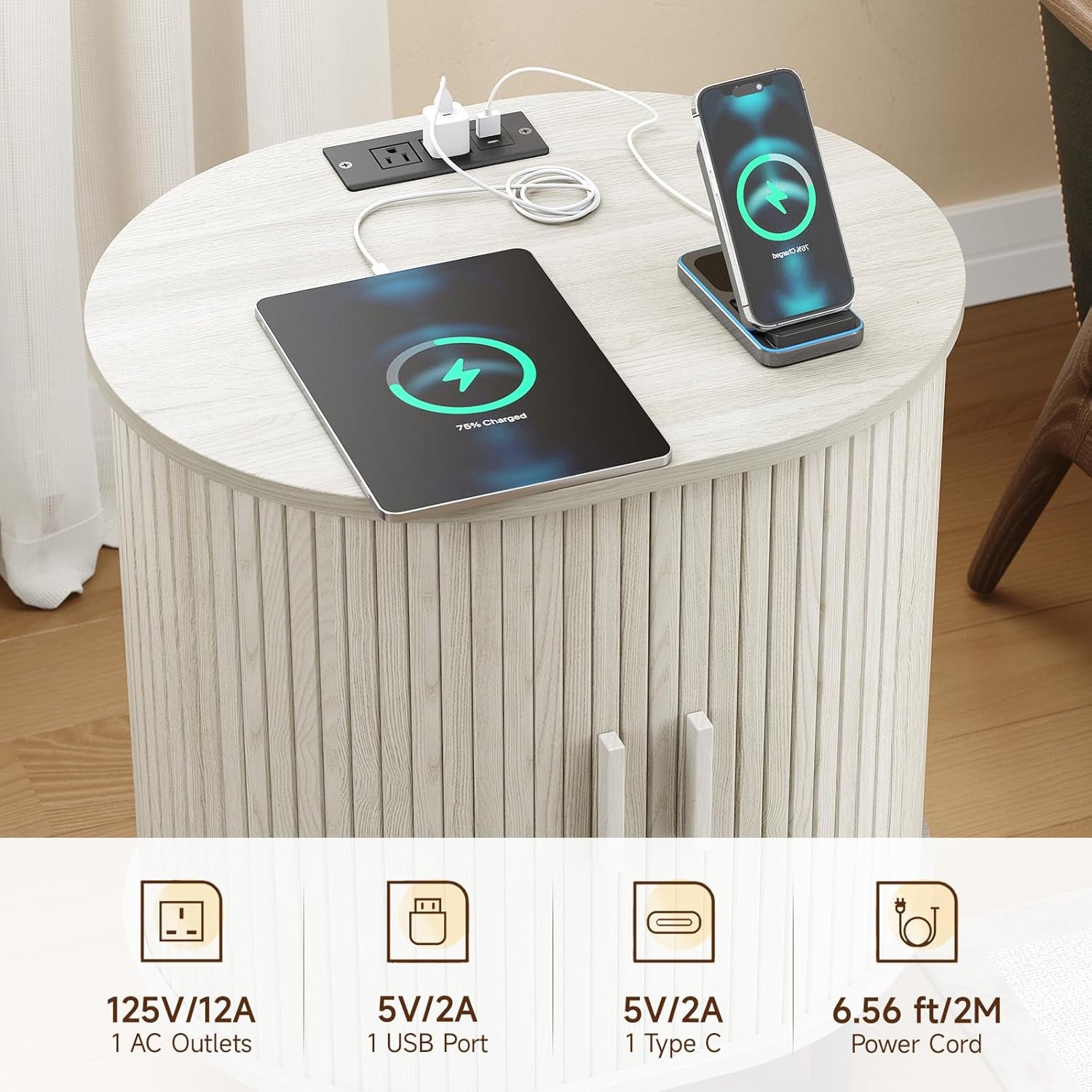 This end table measures 16"D x 20"W x 23.5"H, offering enough storage space without taking up too much floor space. The oval table includes a built-in charging station with two standard power outlets, one USB port, and one Type-C port, allowing you to charge multiple devices at the same time.